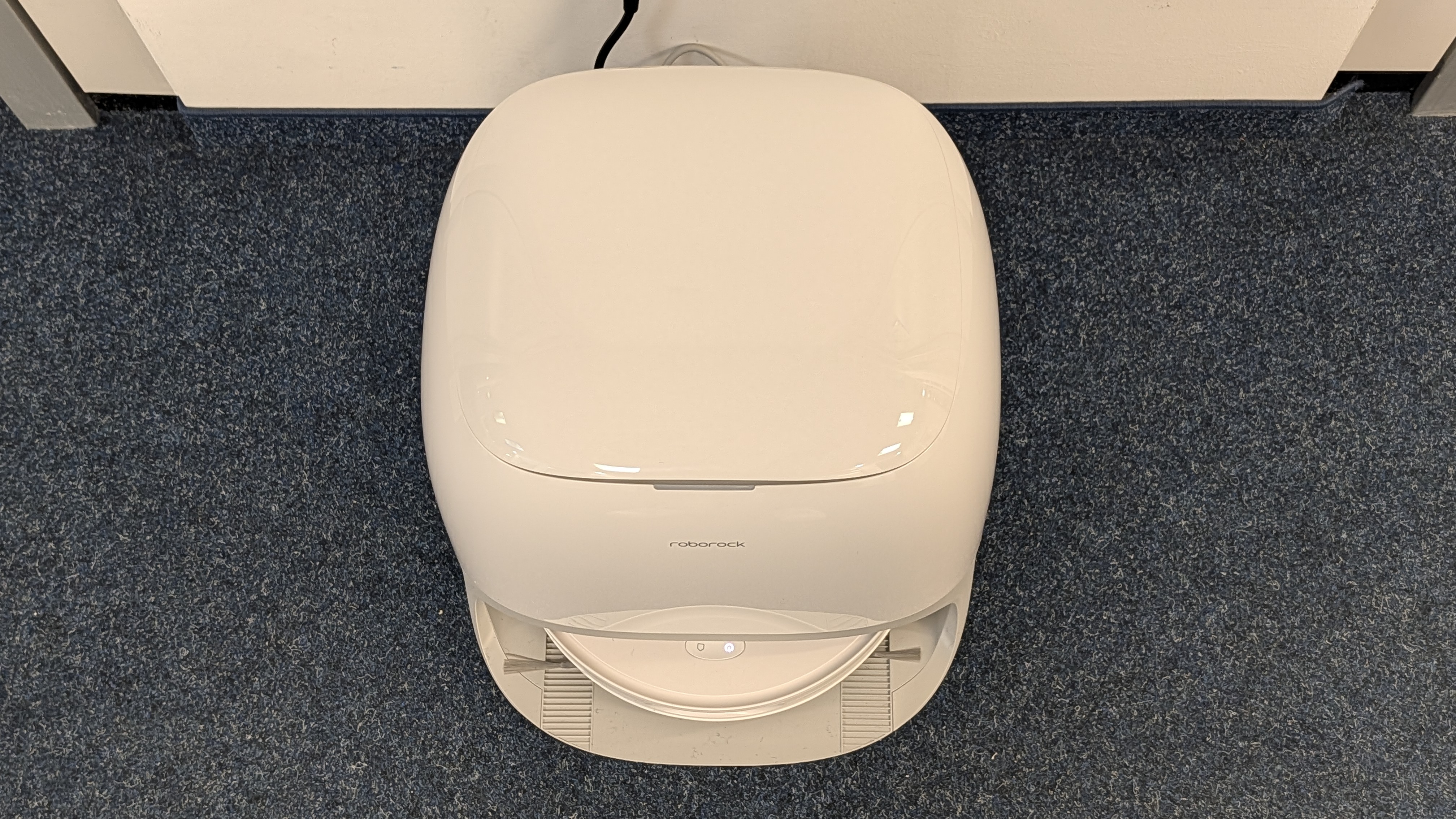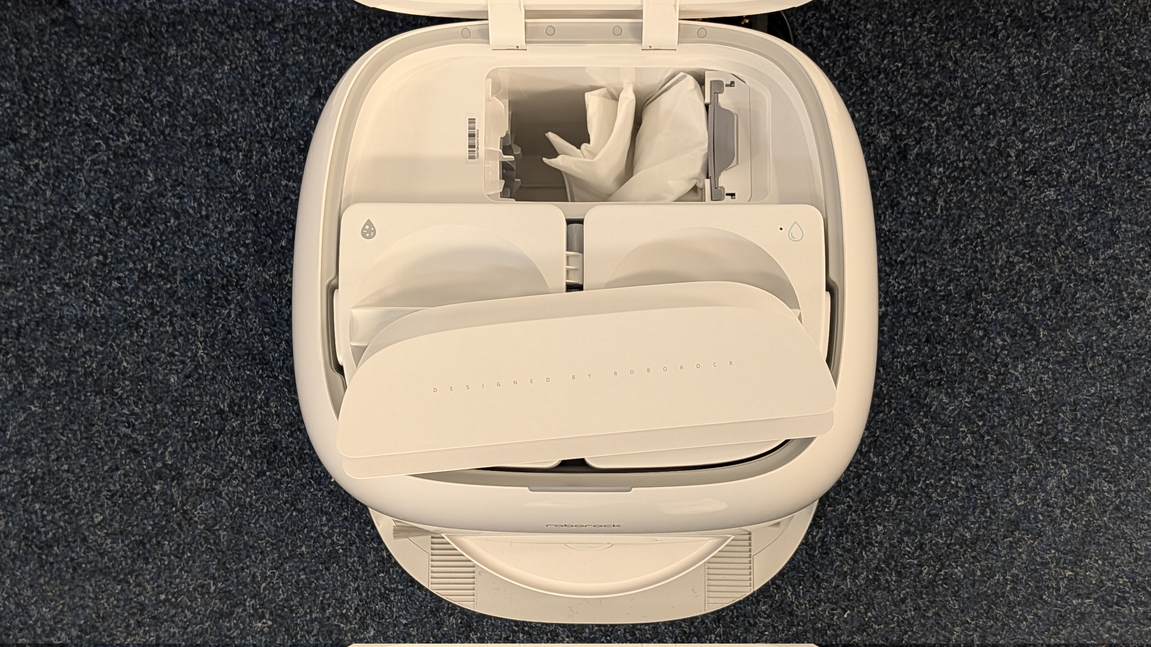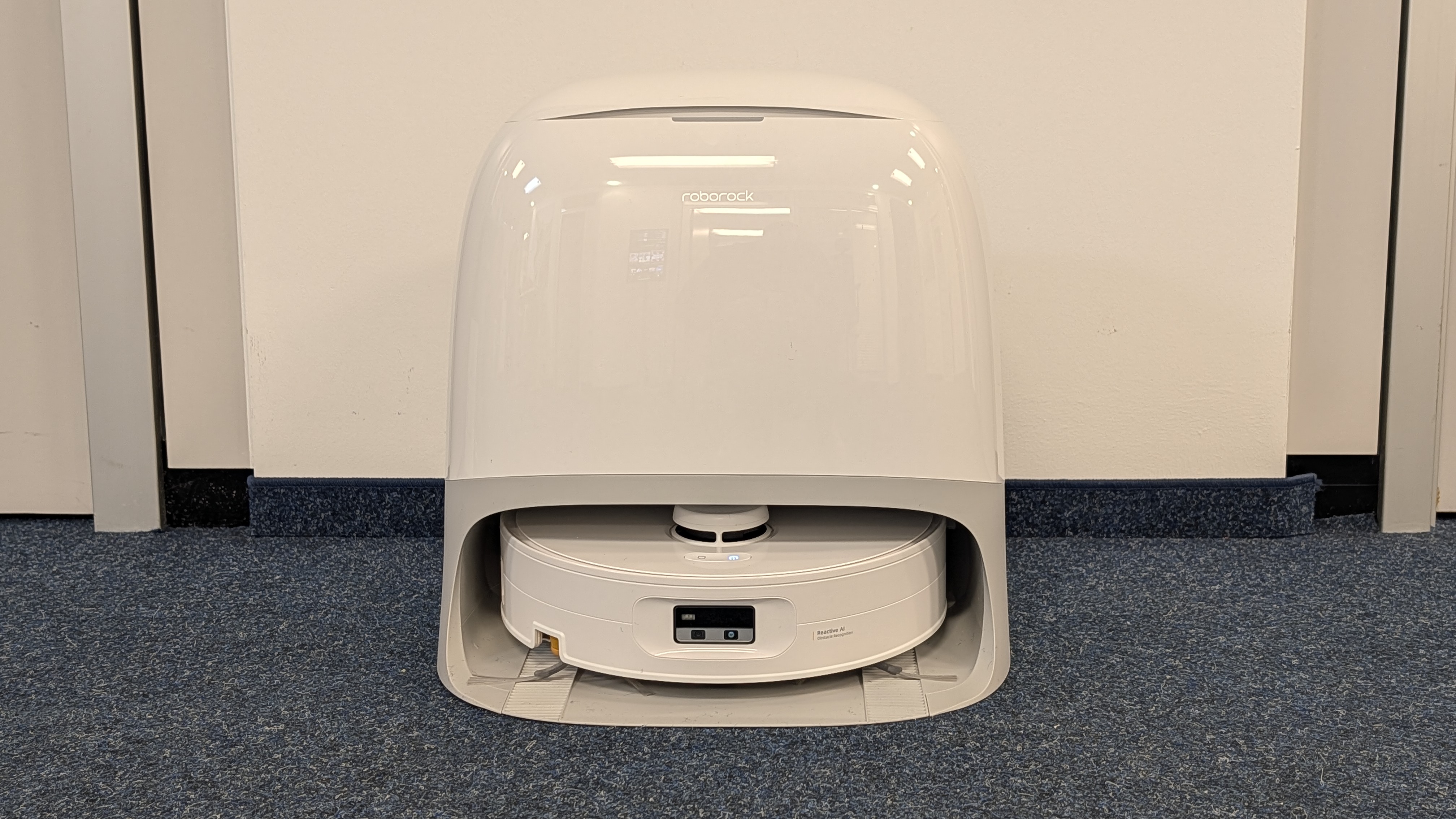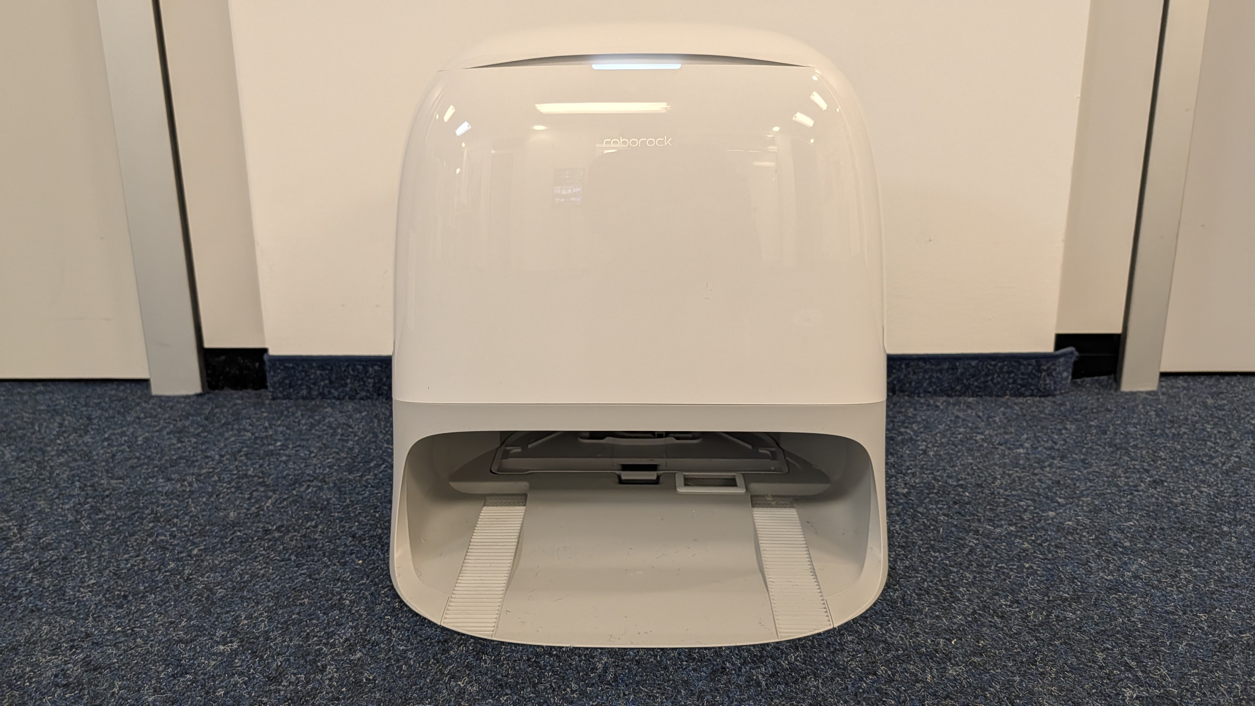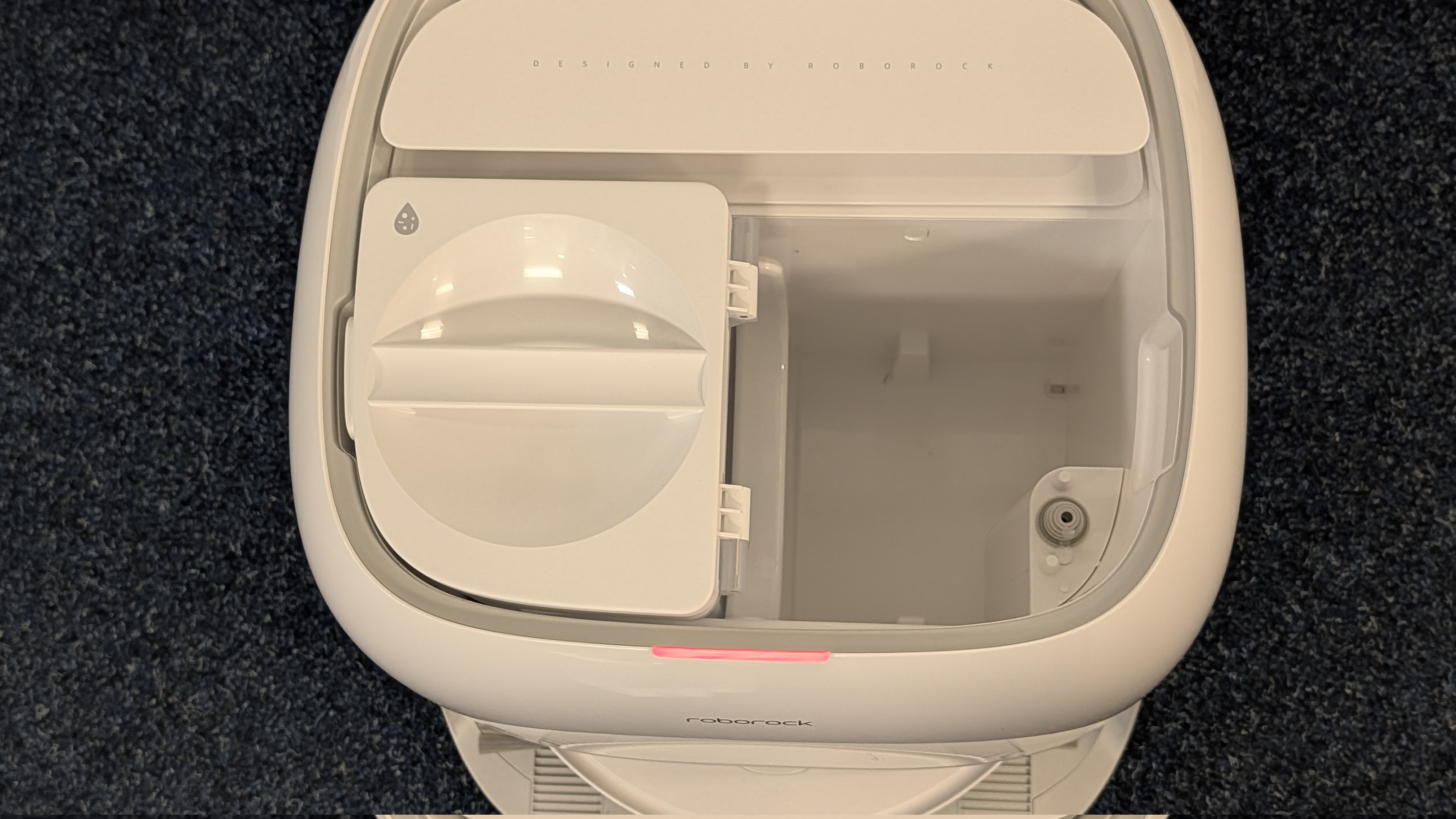Die Station fällt sofort ins Auge. Roborock setzt erneut auf das kubische Design mit stark abgerundeten Kanten, das schon beim Vorgänger polarisierte. Manche Kollegen in der Redaktion bezeichnen sie als hässliche Tonne, andere finden das Design zumindest ungewöhnlich. Ästhetik ist immer individuell – in jedem Fall kein gewöhnlicher Anblick. Die Station misst 450 × 450 × 450 mm und beherbergt unter dem Deckel den Frischwassertank (4 Liter), den Schmutzwassertank (3 Liter) sowie den Staubbeutel (2,5 Liter) mit einer kleinen Abdeckhaube.