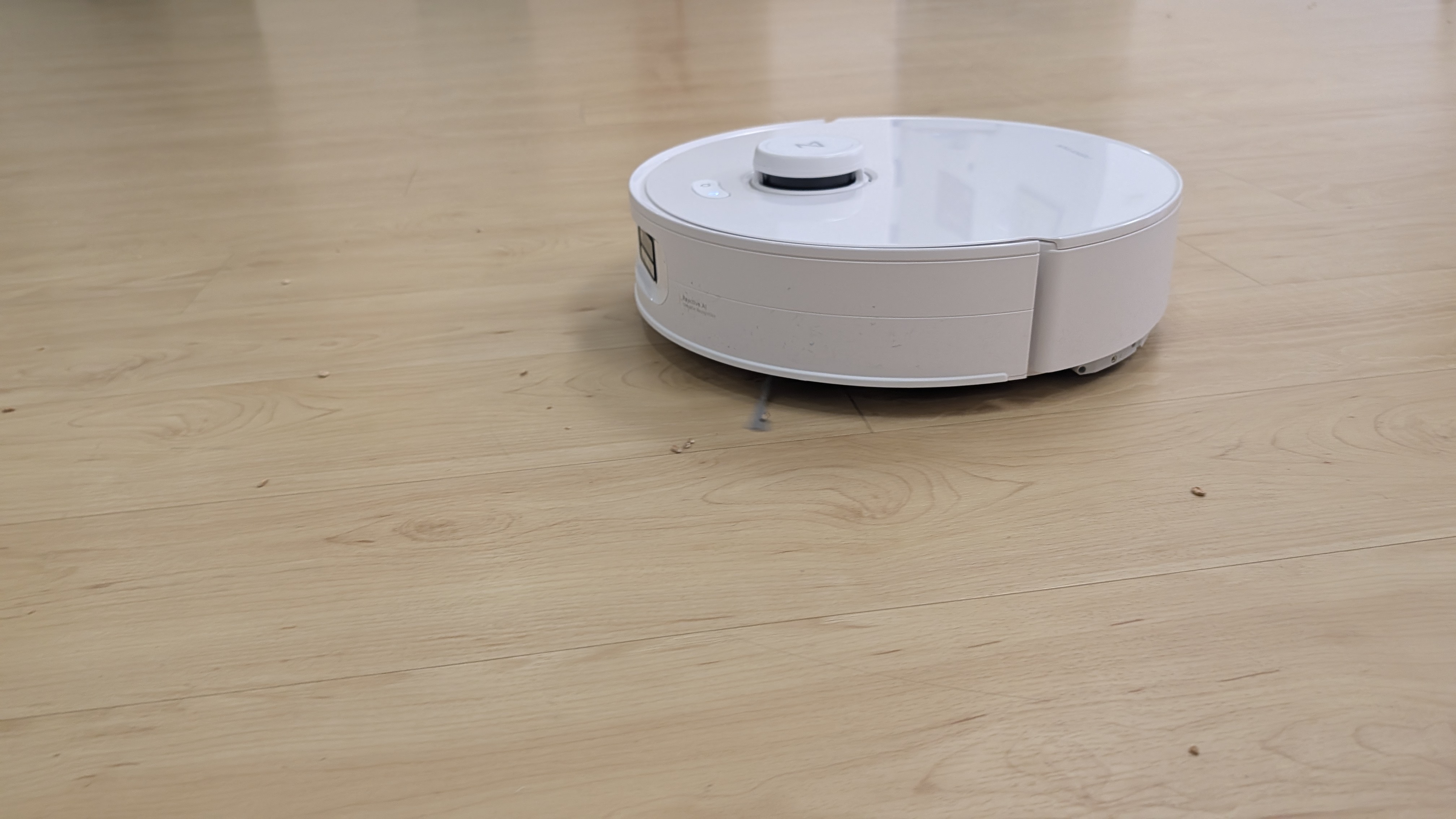 Auf Hartboden überzeugt der Curv 2 Flow. Grobe Partikel nimmt er zuverlässig auf, feiner Staub wird dank der Wischwalze ebenfalls schnell und restlos beseitigt. Die beiden Seitenbürsten arbeiten dabei effektiver als die Einzelbürste des teureren Saros 20, da sie Partikel gegenläufig zur Mitte hin kehren. Allerdings rotieren sie zum Teil zu schnell und schleudern – wie quasi alle Saugroboter – einzelne Partikel durch den Raum.