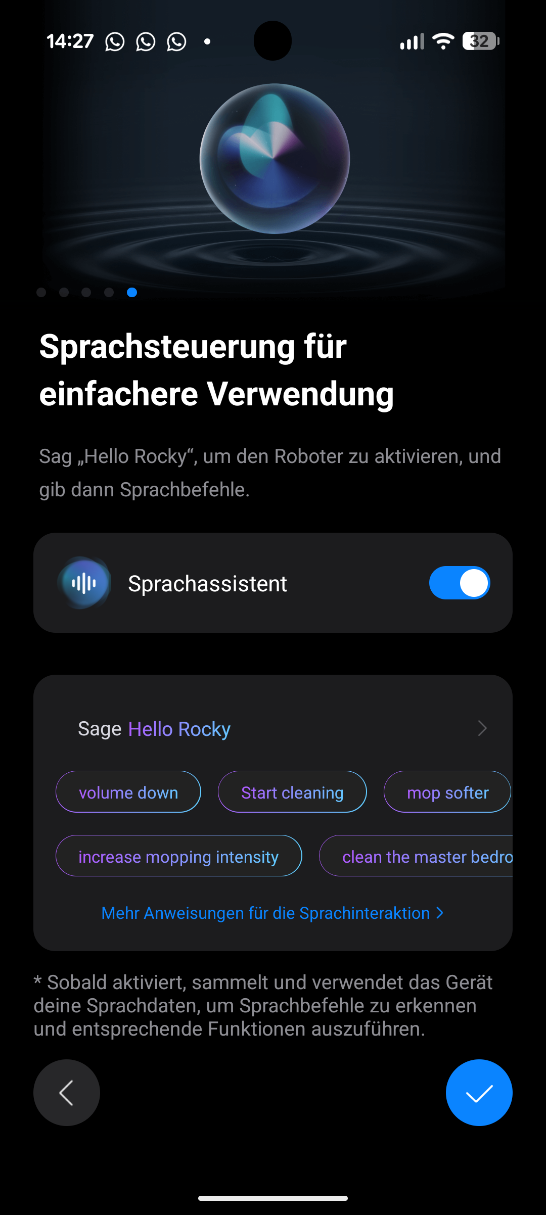 Die Sprachausgabe des Roboters ist angenehm zurückhaltend. Sie stört nicht mit zu vielen Bemerkungen und hält sich kurz – definitiv eine der angenehmeren unter den Saugrobotern.