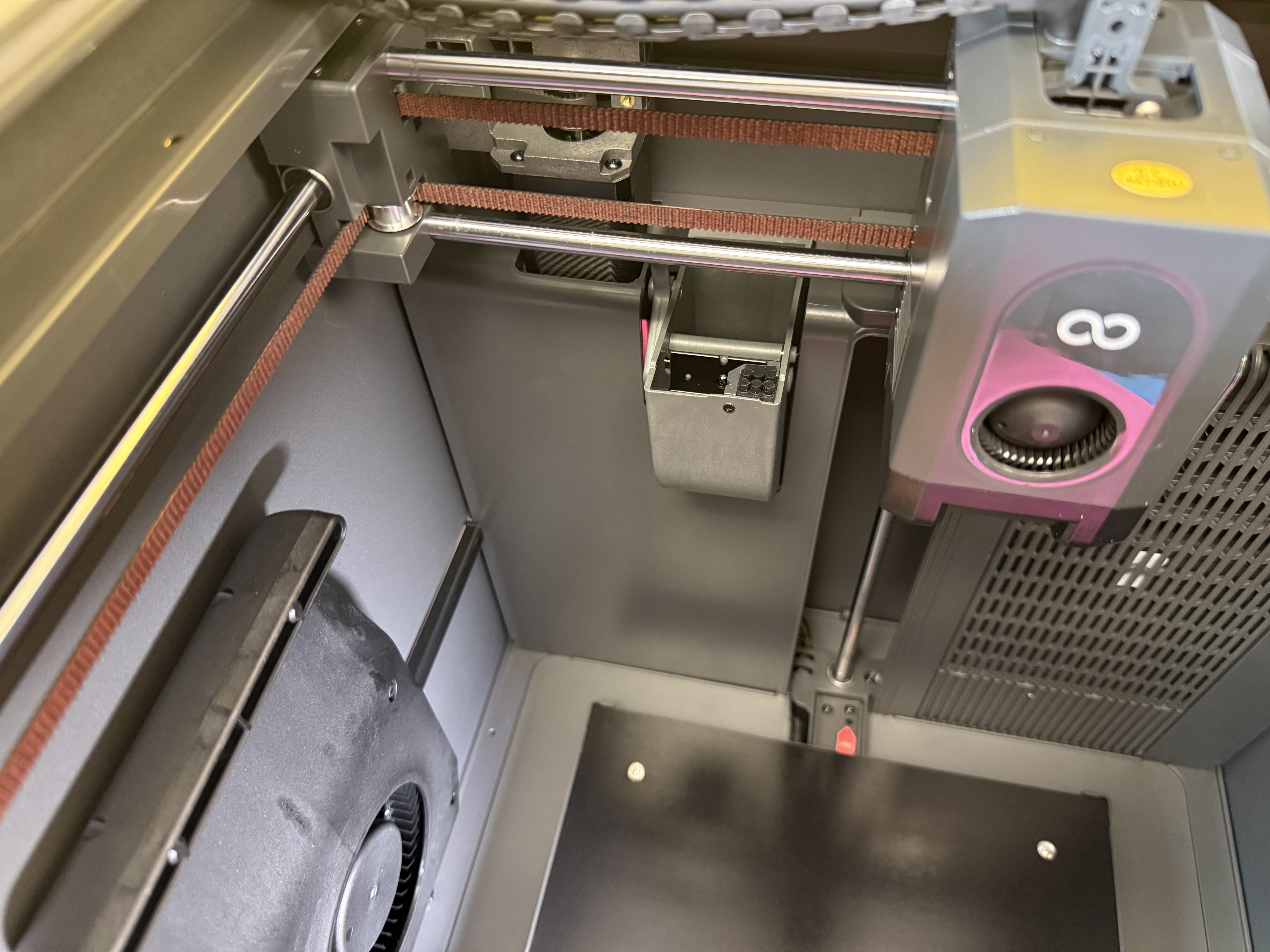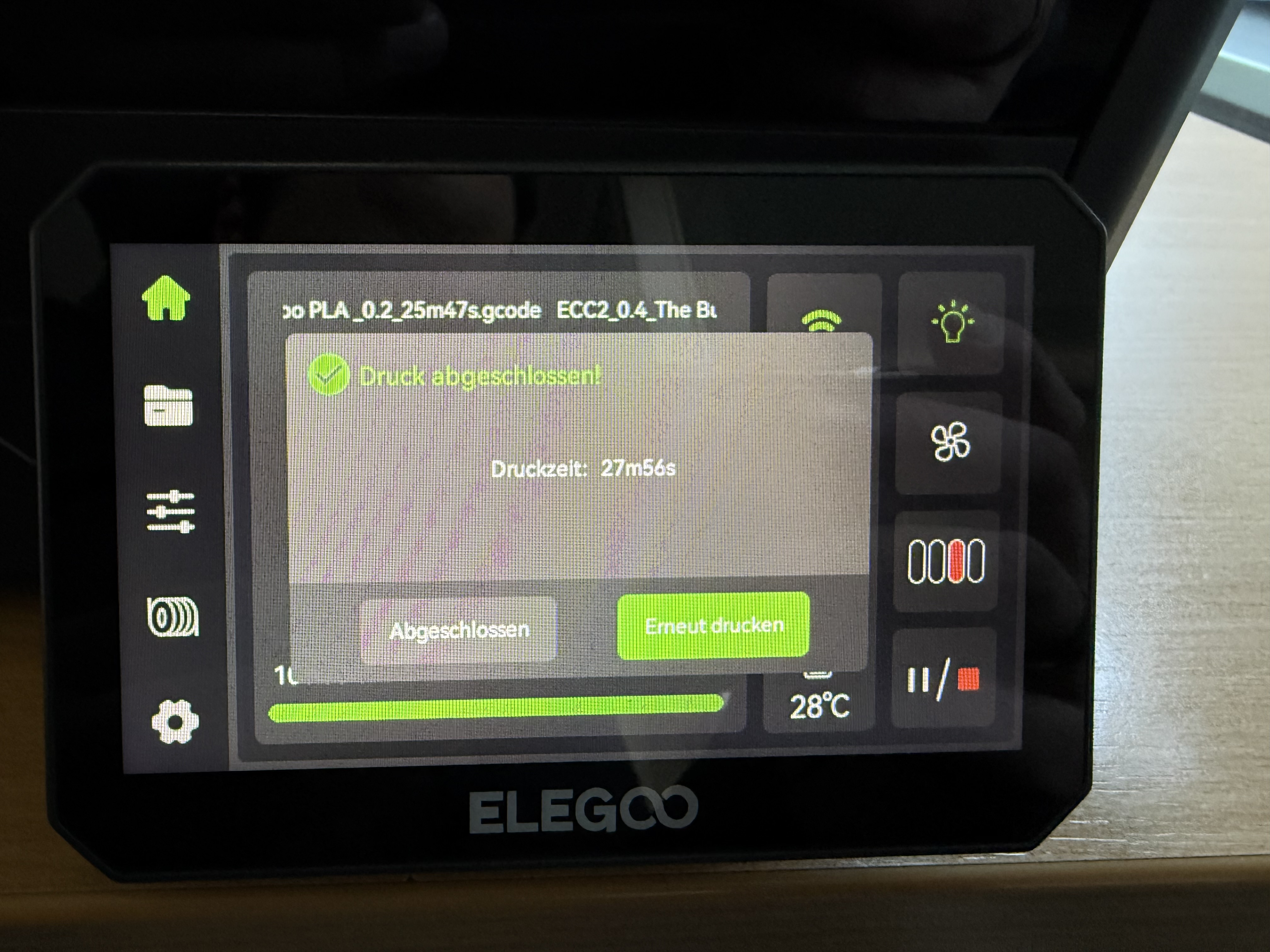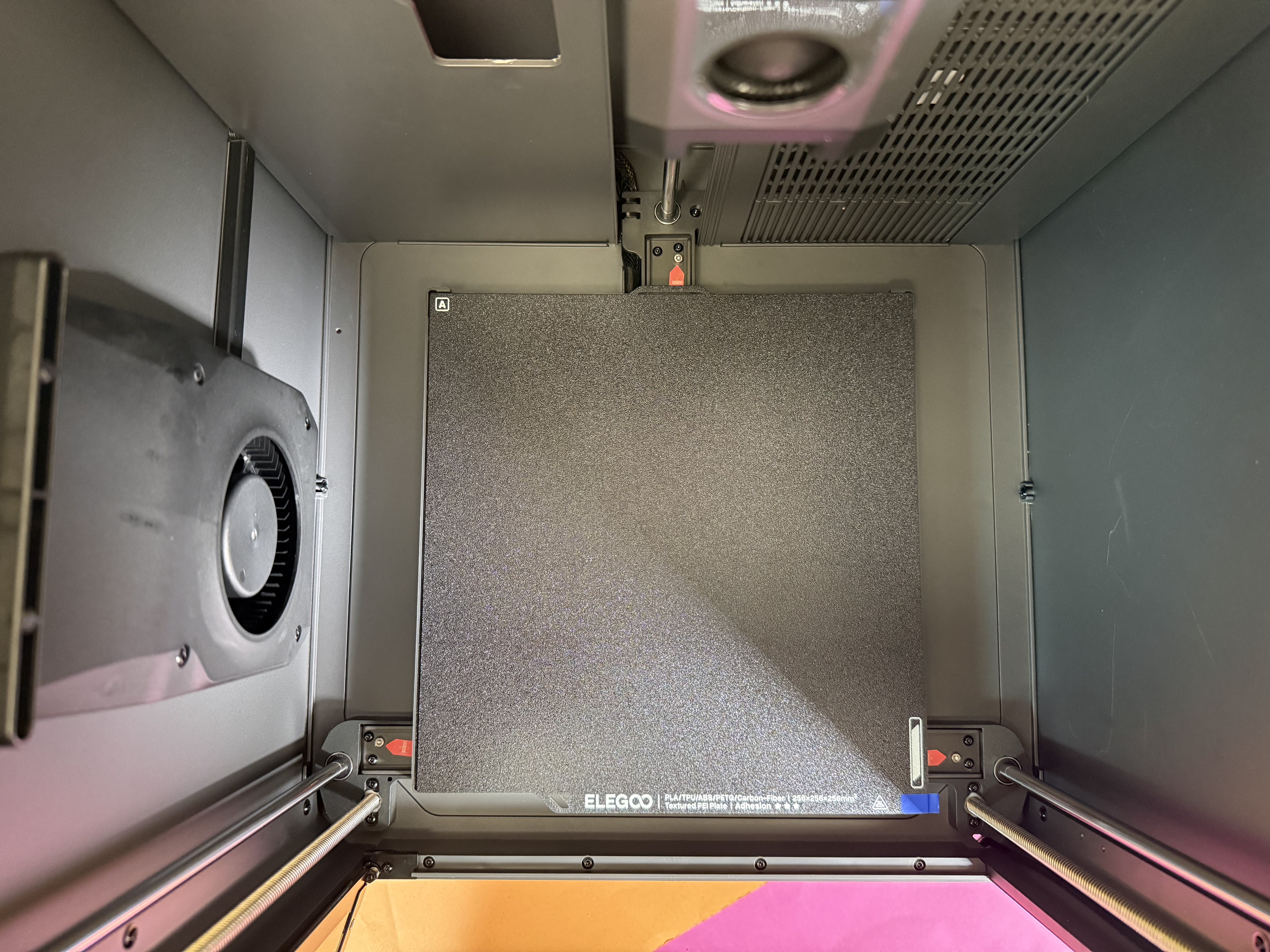 Im Gegensatz zum Carbon 1 muss man den Deckel beim Druck von PLA & Co. nicht offen lassen; wird es im Bauraum zu warm, führt ein Lüfter die warme Luft ab – sehr komfortabel. Dass dieser Lüfter mal sehr laut sein kann, merkt man nur gelegentlich; etwa wenn ein ABS-Druck fertig ist und der Elegoo zum Abschluss für eine Minute den Lüfter voll aufdreht.