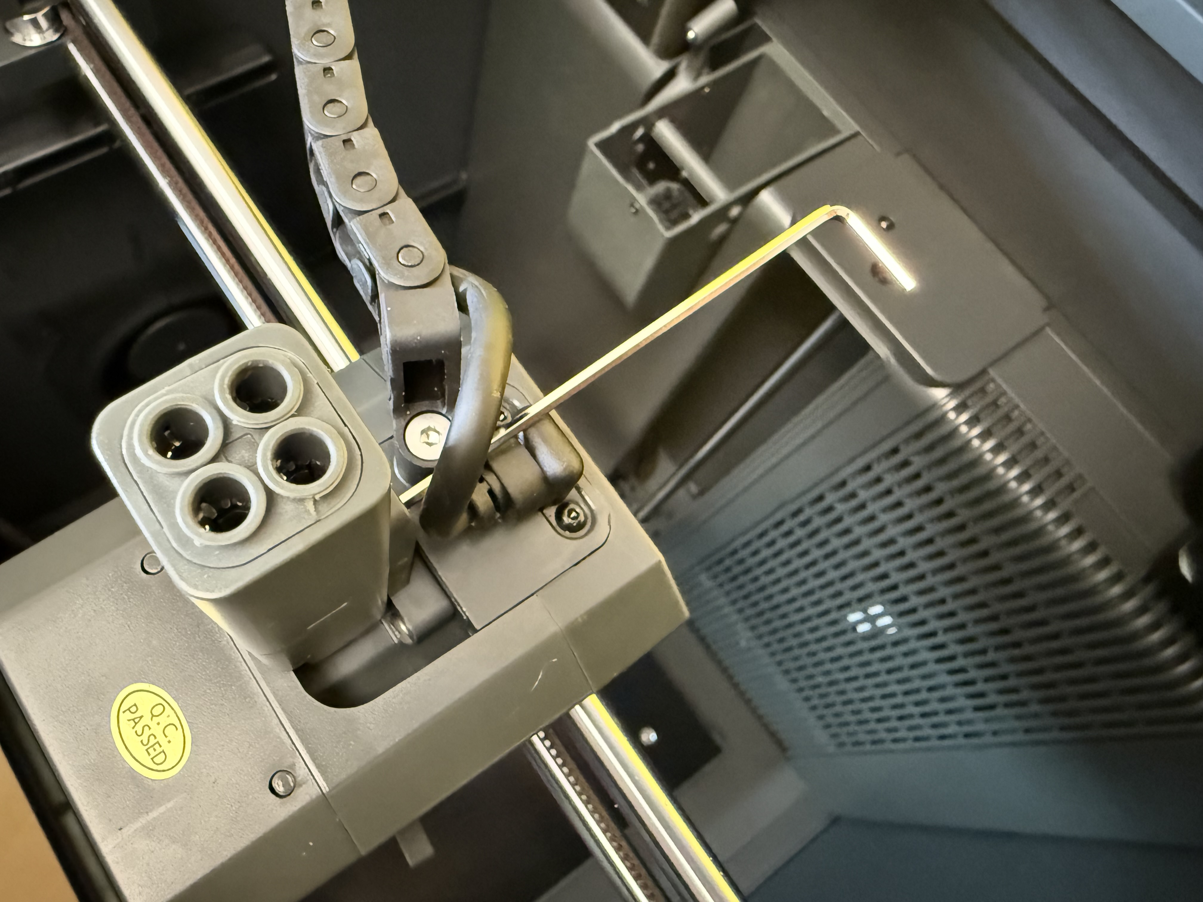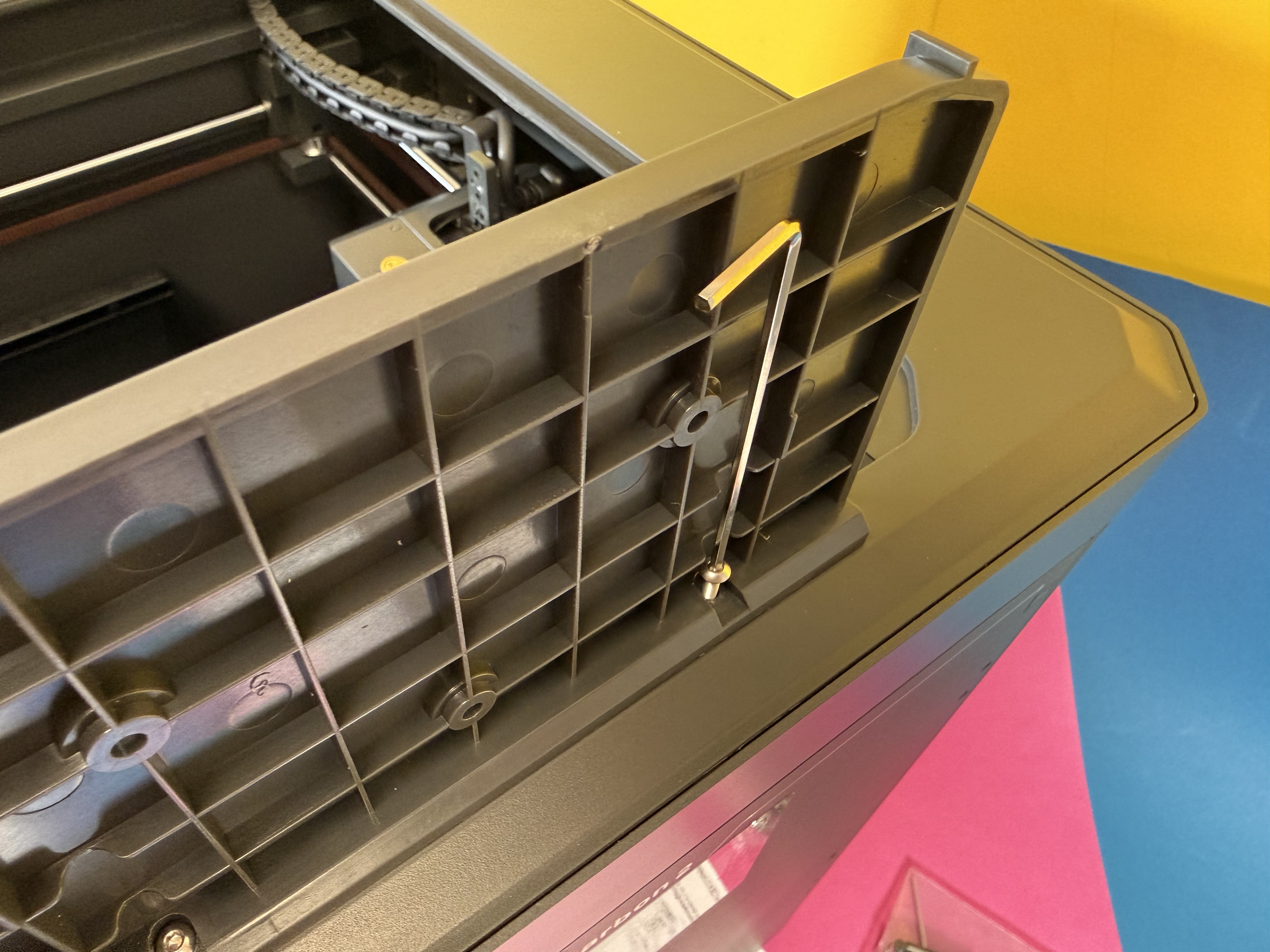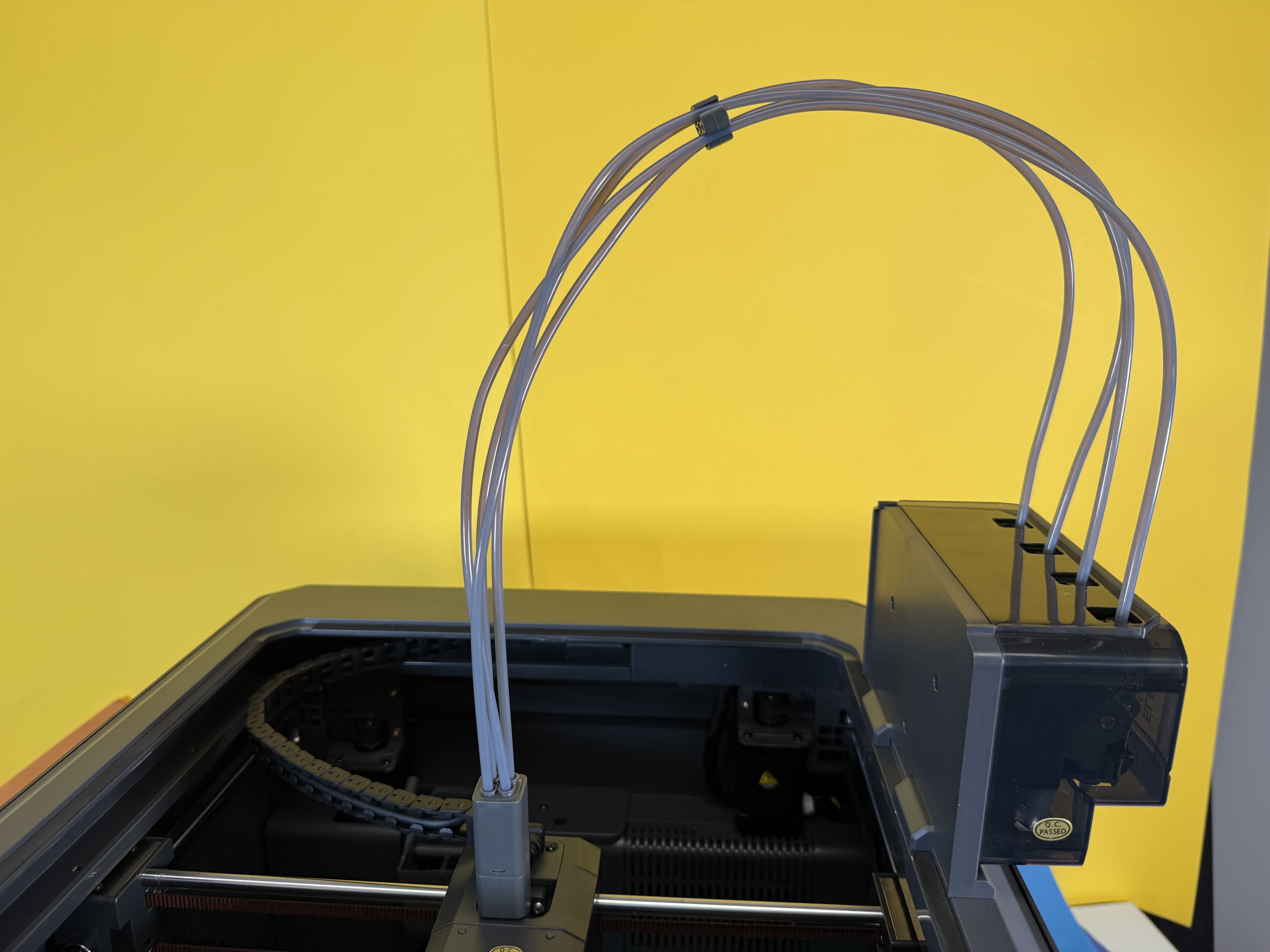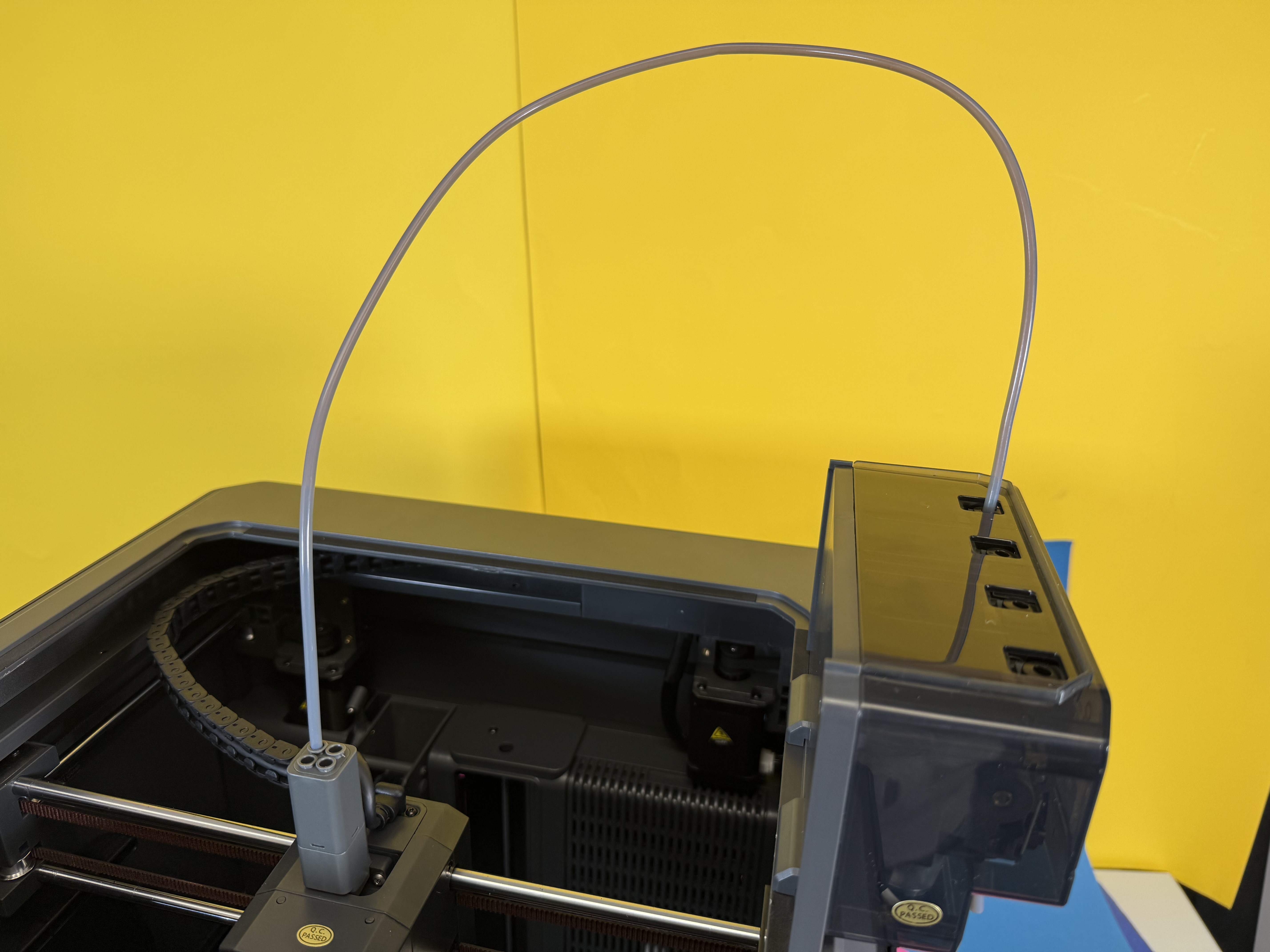 Etwas nervig: Wenn das Filament im PTFE-Schlauch zwischen dem Canvas genannten Materialwechsler und dem Druckkopf bricht, hat man eigentlich keine Chance mehr, den Druck erfolgreich zu Ende zu führen. Man kann den PTFE-Schlauch nicht einfach nach oben abziehen und es gibt keine Option in der Software des Druckers, das gerade eingelegte Filament zu extrudieren. Man muss den Filament-Hub, der die vier PTFE-Schläuche der Filamente zum Extruder des Druckers verbindet, abschrauben, um die Filament-Reste entnehmen zu können. Die Schrauben sitzen aber hinten, sodass man nicht drankommt, wenn der Druckkopf in seiner Ausgangsposition geparkt wird.