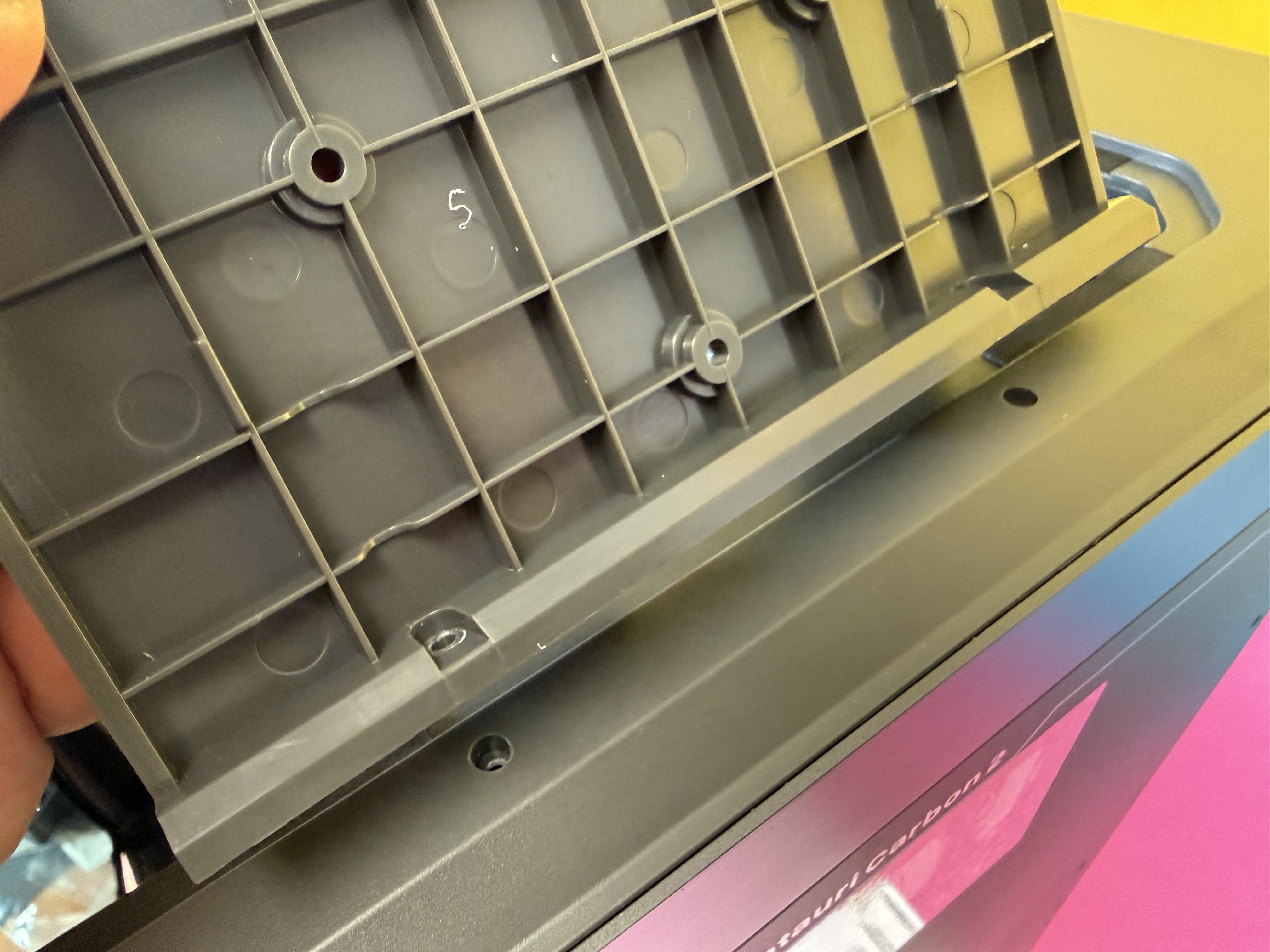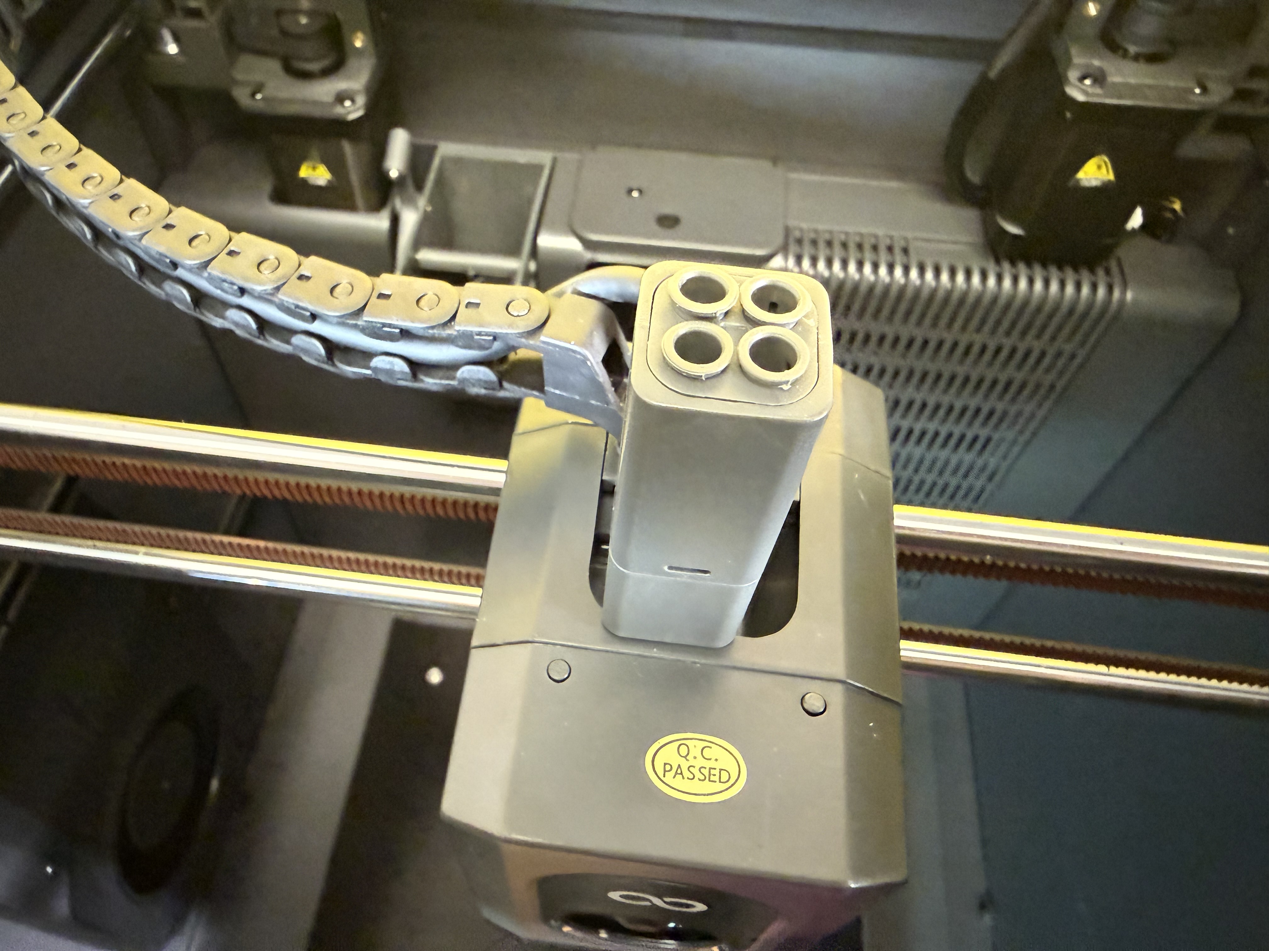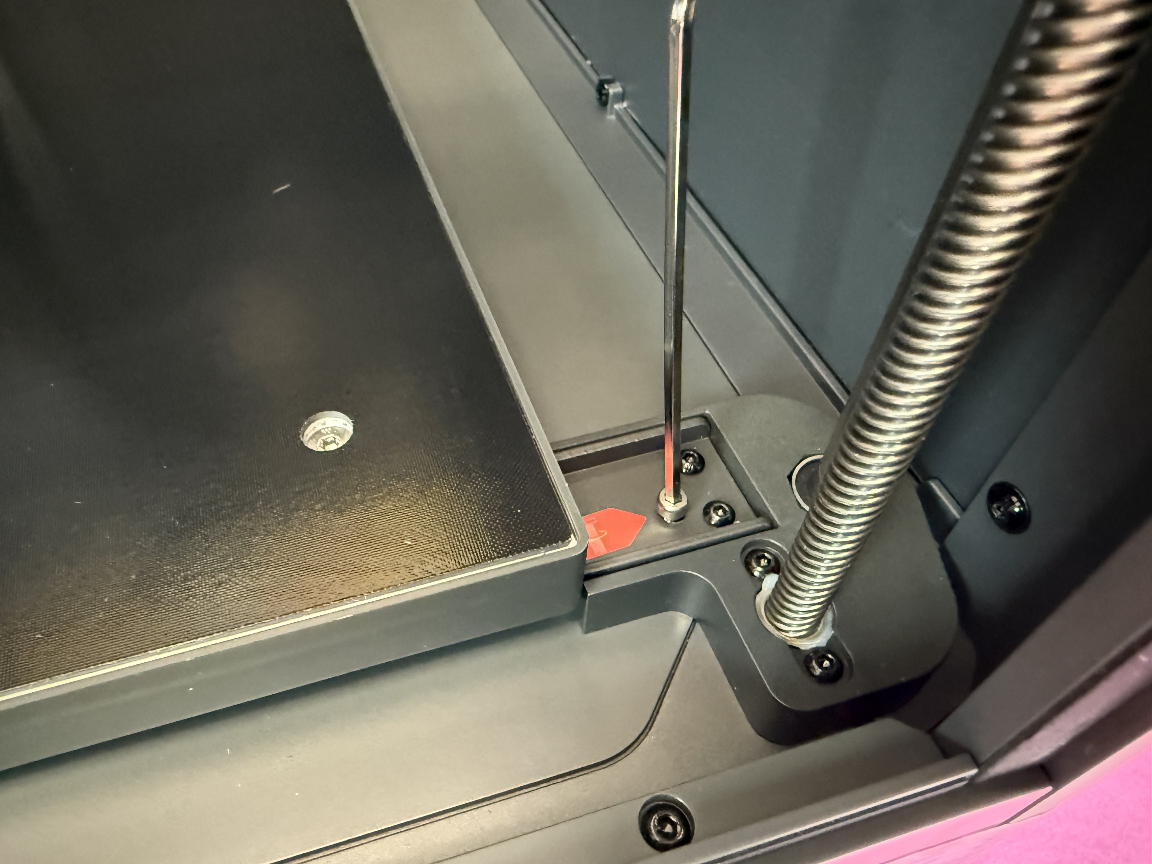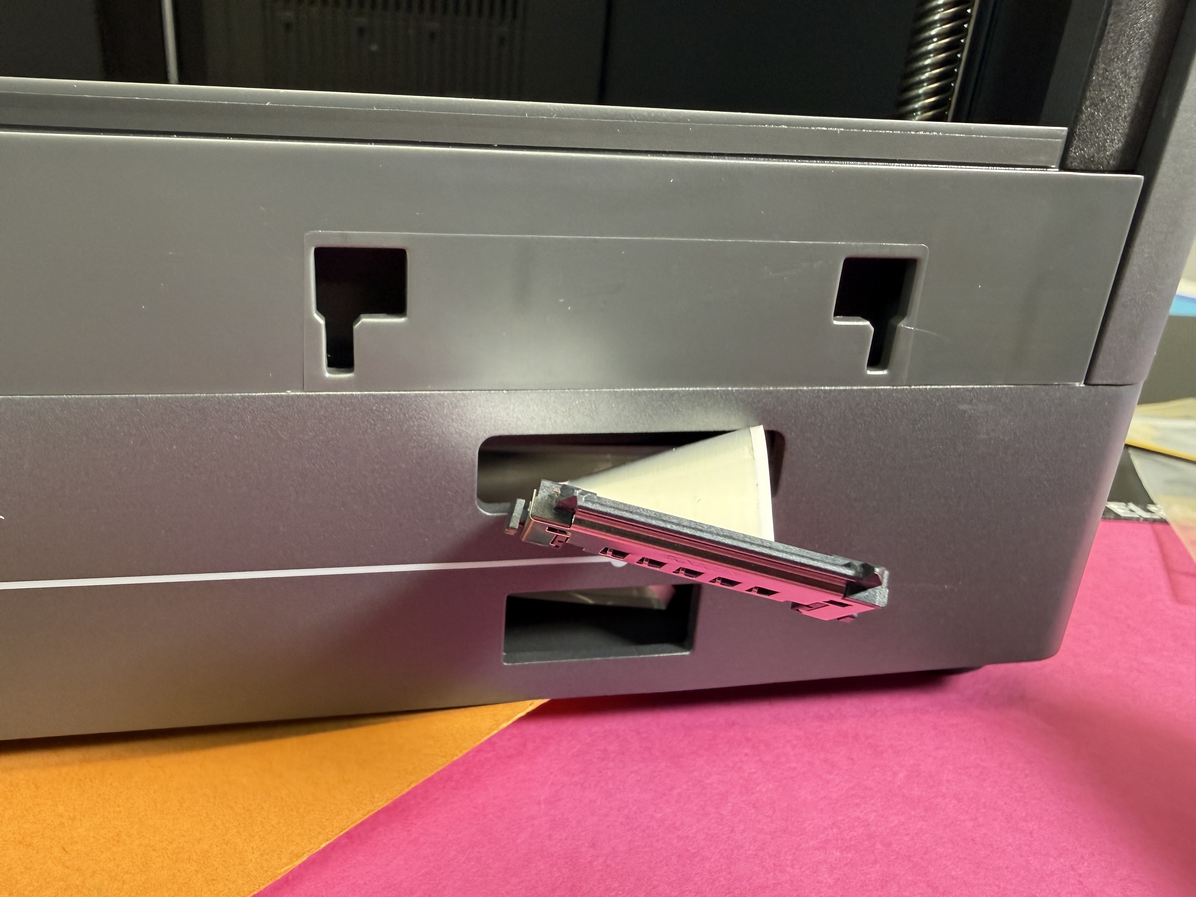 Etwas nervig: Wenn das Filament im PTFE-Schlauch zwischen dem Canvas genannten Materialwechsler und dem Druckkopf bricht, hat man eigentlich keine Chance mehr, den Druck erfolgreich zu Ende zu führen. Man kann den PTFE-Schlauch nicht einfach nach oben abziehen und es gibt keine Option in der Software des Druckers, das gerade eingelegte Filament zu extrudieren. Man muss den Filament-Hub, der die vier PTFE-Schläuche der Filamente zum Extruder des Druckers verbindet, abschrauben, um die Filament-Reste entnehmen zu können. Die Schrauben sitzen aber hinten, sodass man nicht drankommt, wenn der Druckkopf in seiner Ausgangsposition geparkt wird.