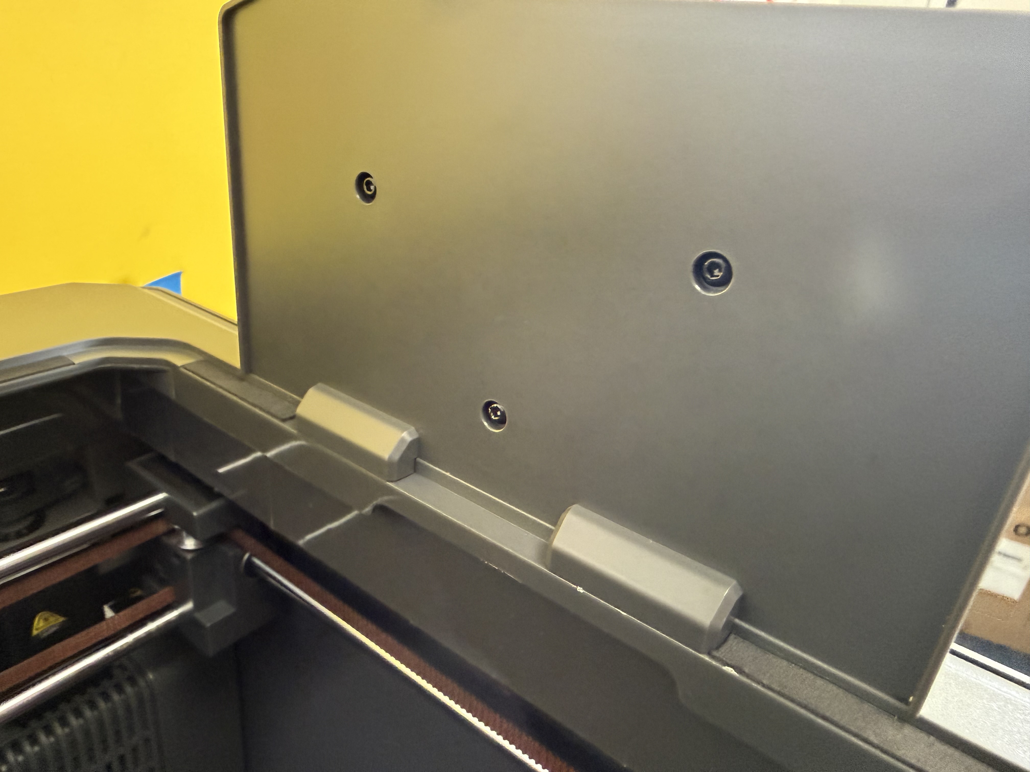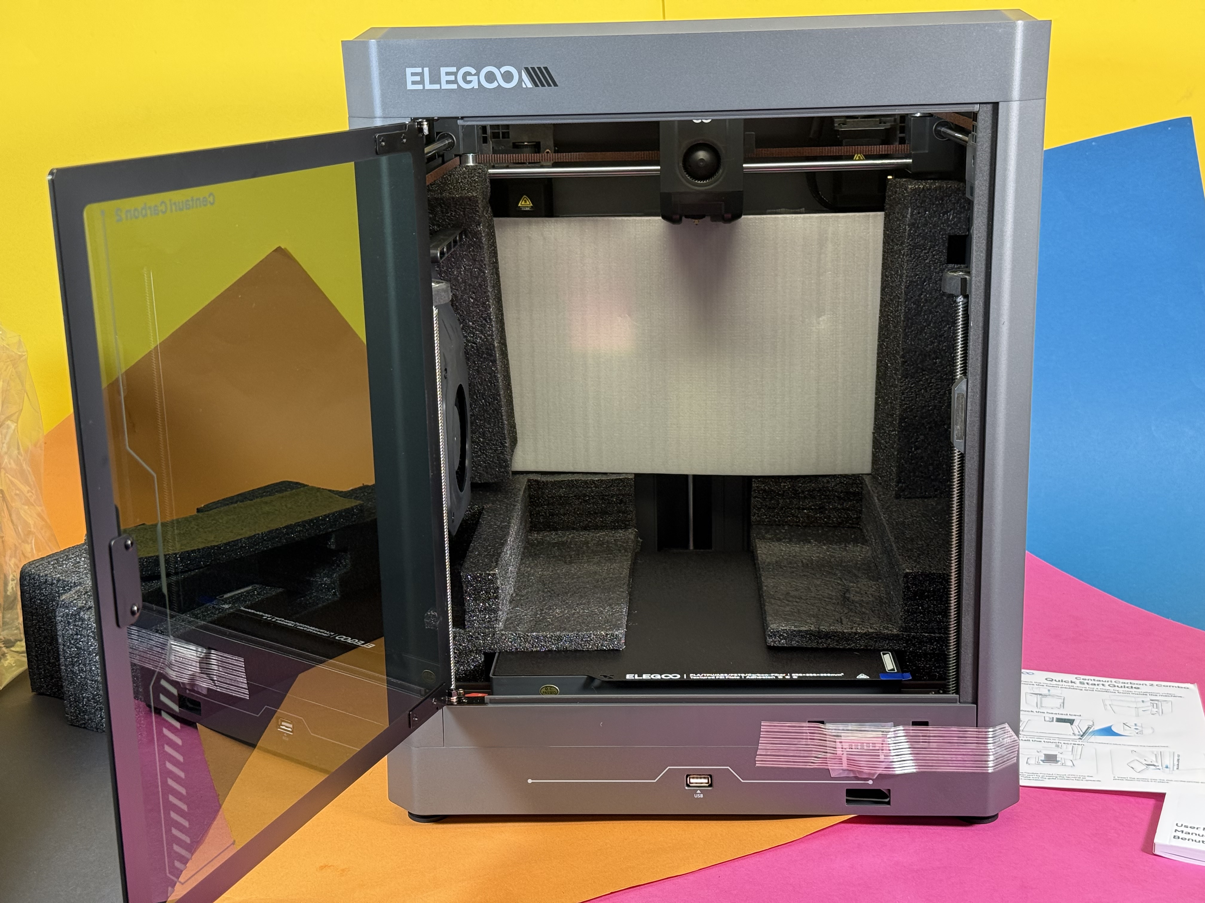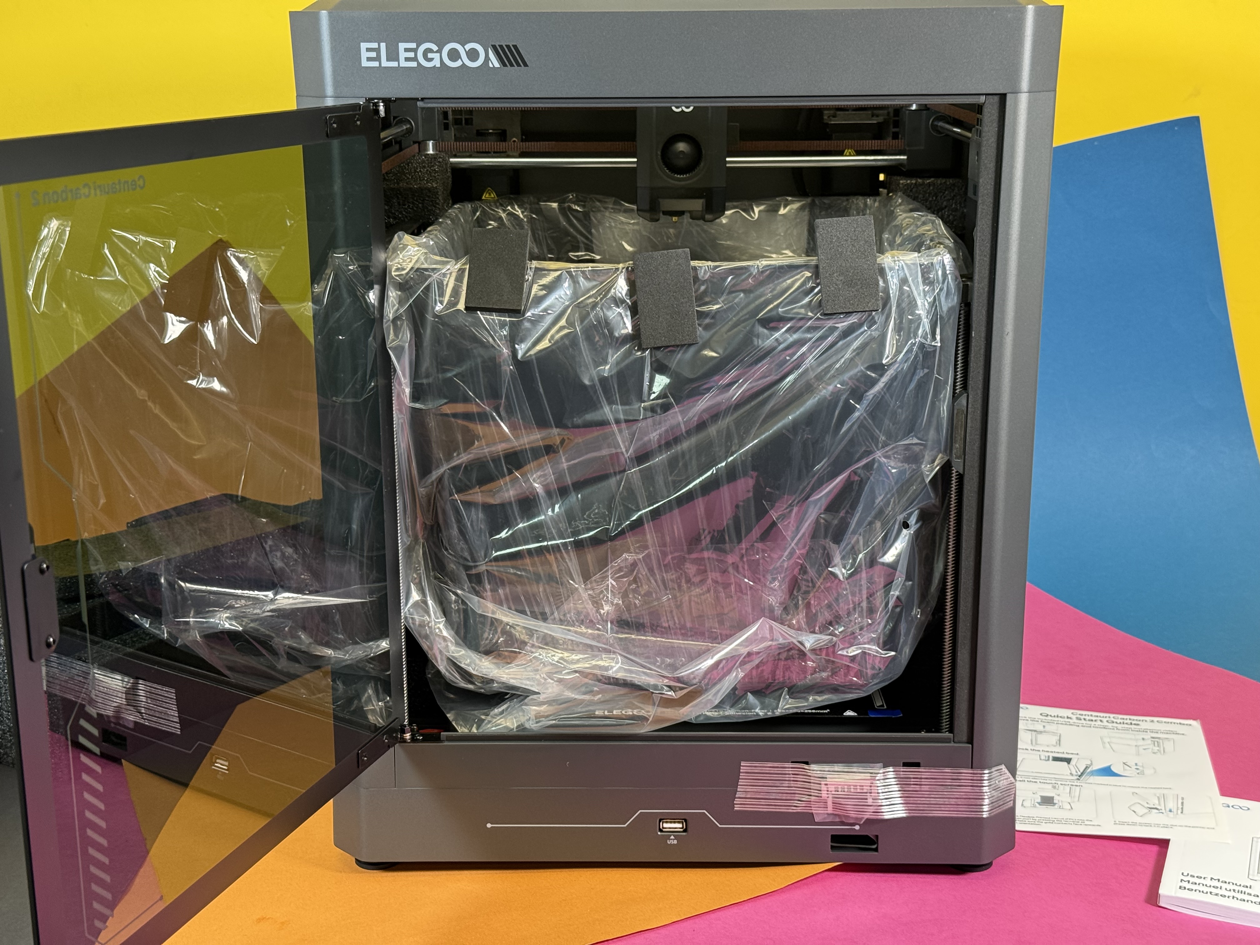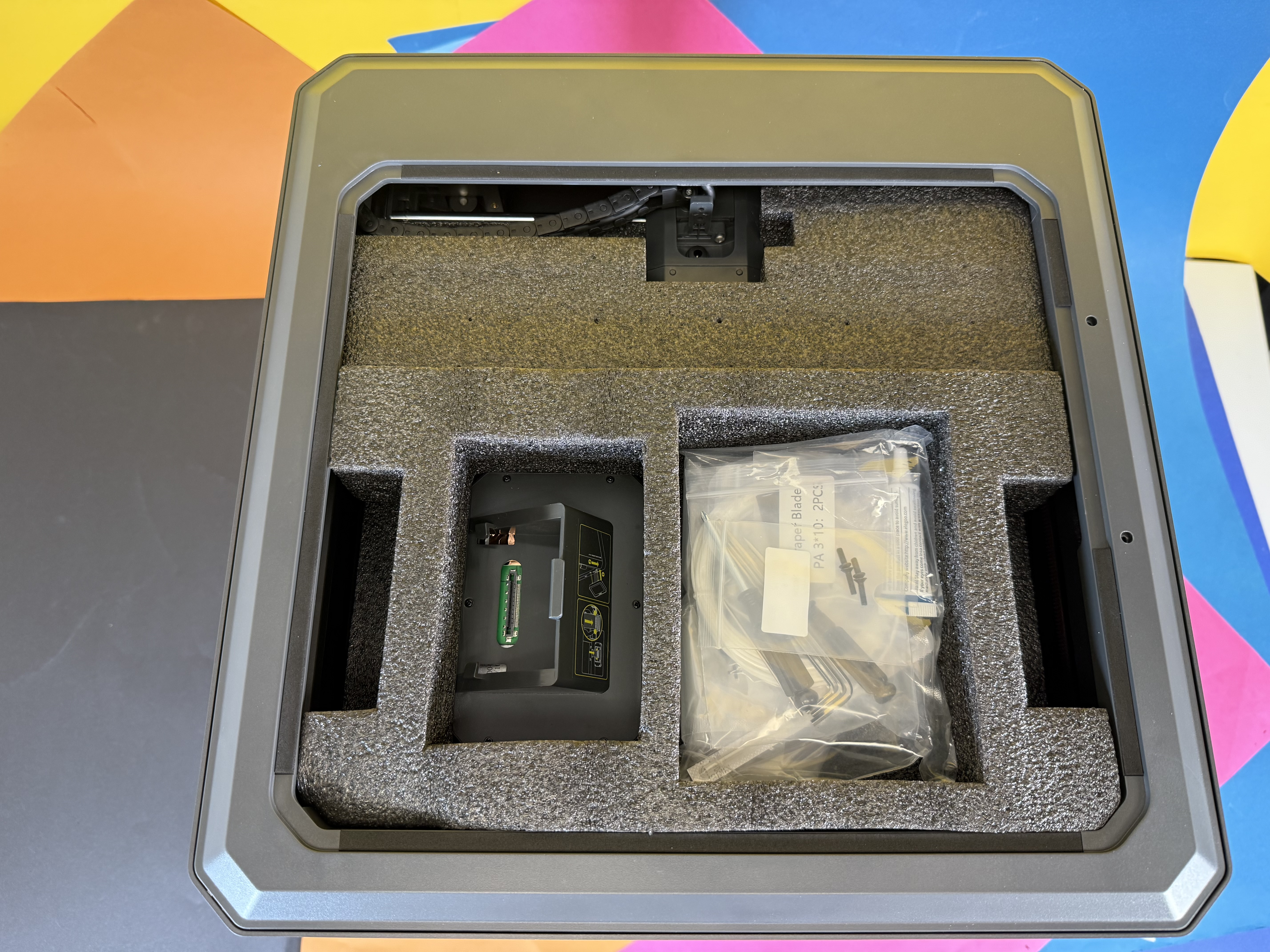 Der eigentliche Drucker ist vormontiert. Das Gehäuse ist aus Blech gefertigt, die Fronttür besteht aus echtem Glas. Eine Scheibe oben wie beim Vorgänger gibt es hier nicht mehr, stattdessen den besagten Kunststoffdeckel. Der Drucker ist gut gegen Kratzer und Beschädigungen geschützt. Nach dem Auspacken aus der Plastikfolie entfernt man diverse Klebestreifen, die die Tür geschlossen halten, die Kabel schützen und so weiter. Die Klebestreifen lassen sich grundsätzlich gut entfernen, hinterlassen vereinzelt leichte Klebespuren, die sich gut entfernen lassen. Sämtliche Anbauteile hat der Hersteller gut und sinnvoll im Inneren des Bauraums untergebracht. Diese entnimmt man zunächst nach oben. Dann kann man den Kunststoffdeckel durch die Tür nach vorn aus dem Drucker ziehen.