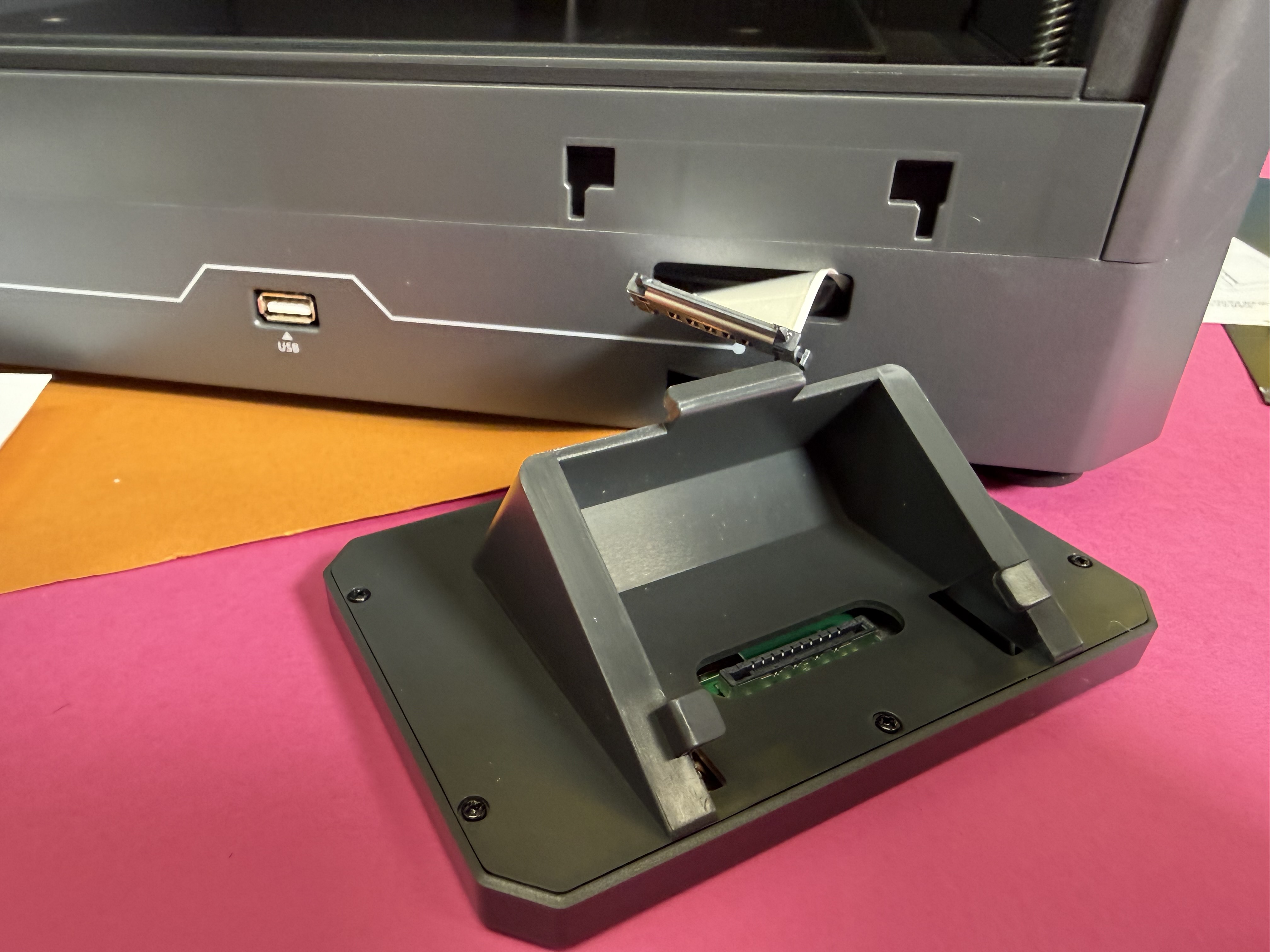 Weiter geht es mit dem Entfernen der Transportsicherungen. Es wird verständlich erklärt, wo die Schrauben sitzen; das nötige Werkzeug ist im Lieferumfang enthalten. Danach montieren wir die ersten Anbauteile, allen voran den Filamentauswurf und das Display. Sollte man den Stecker jemals wieder entfernen wollen, muss man aufpassen, dass die Plastiknasen nicht abbrechen – also am besten das Display daran lassen.