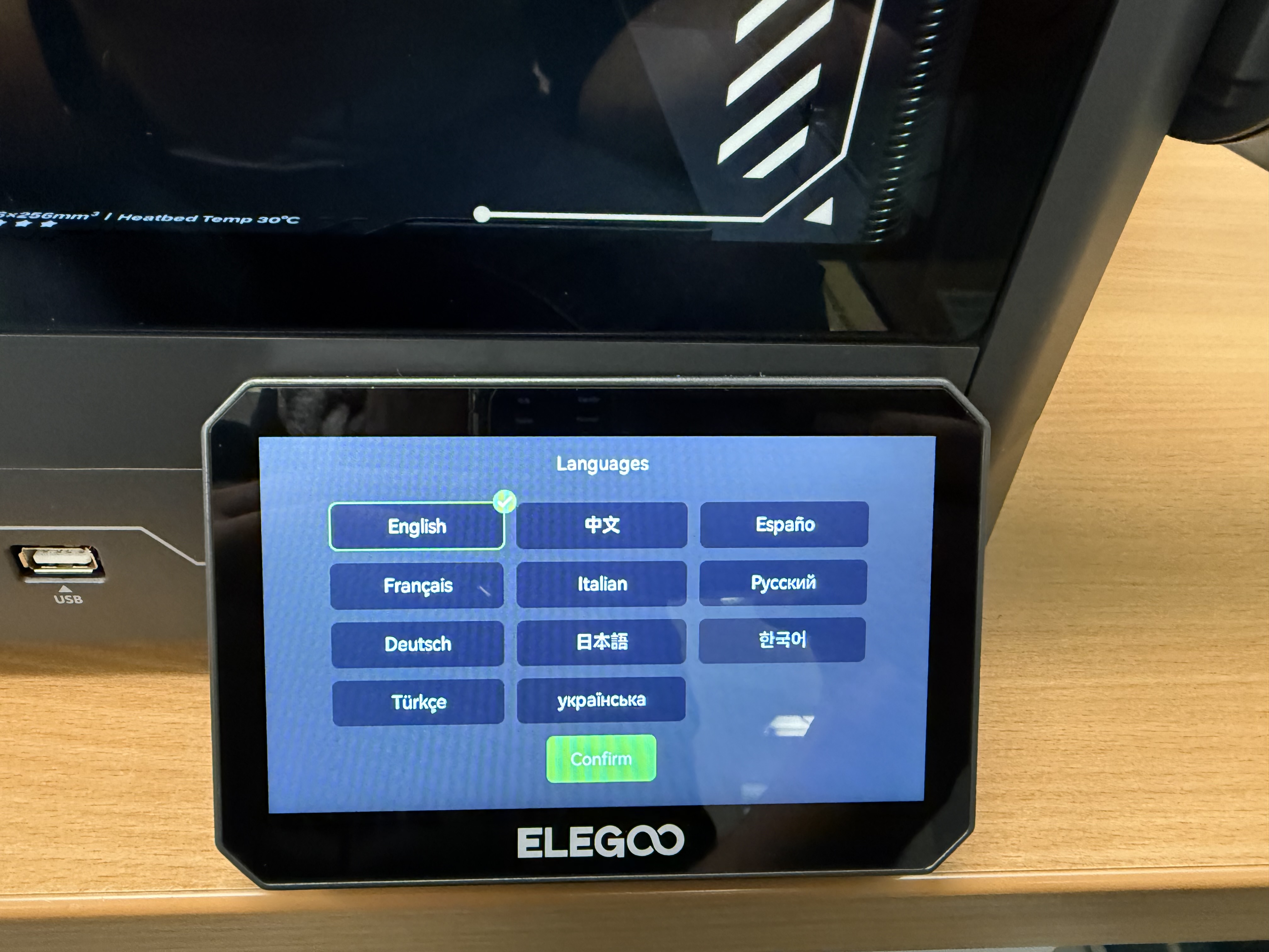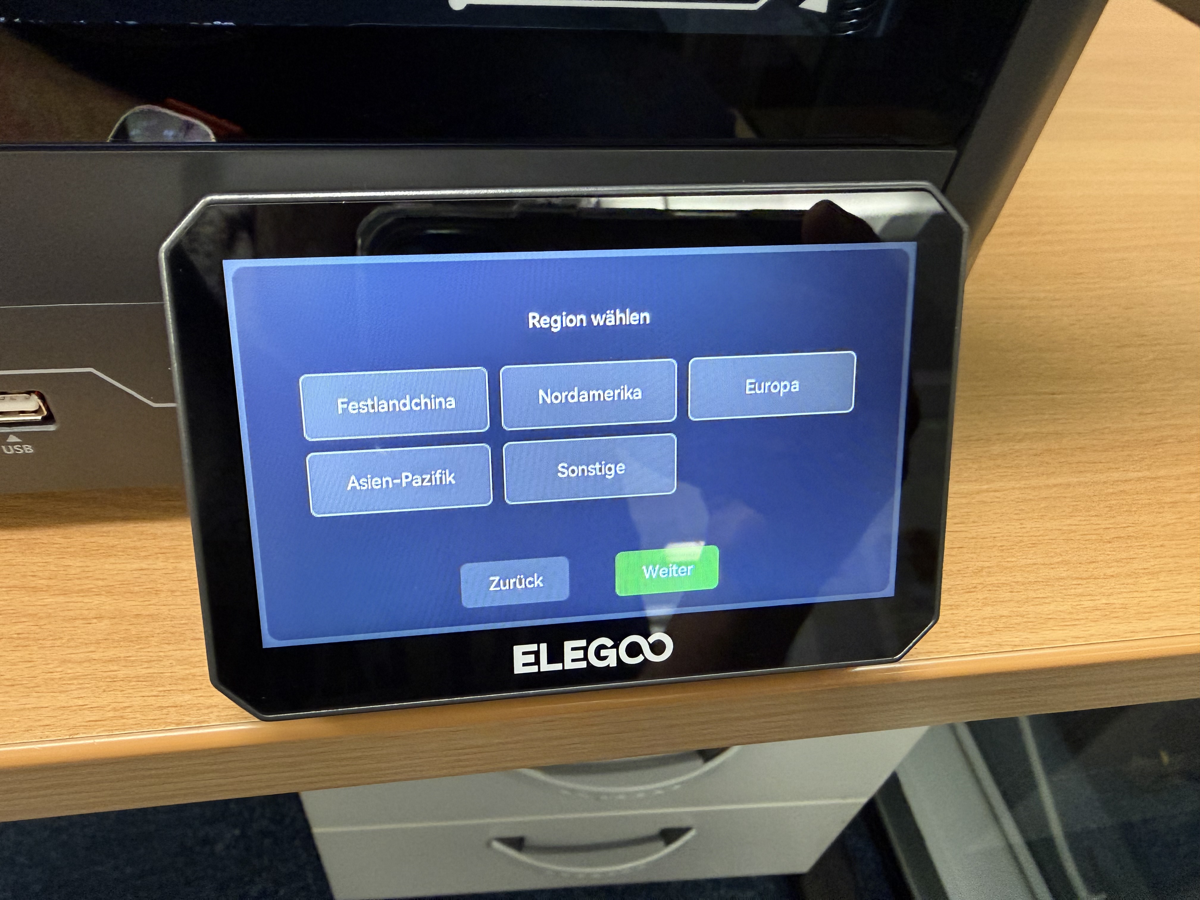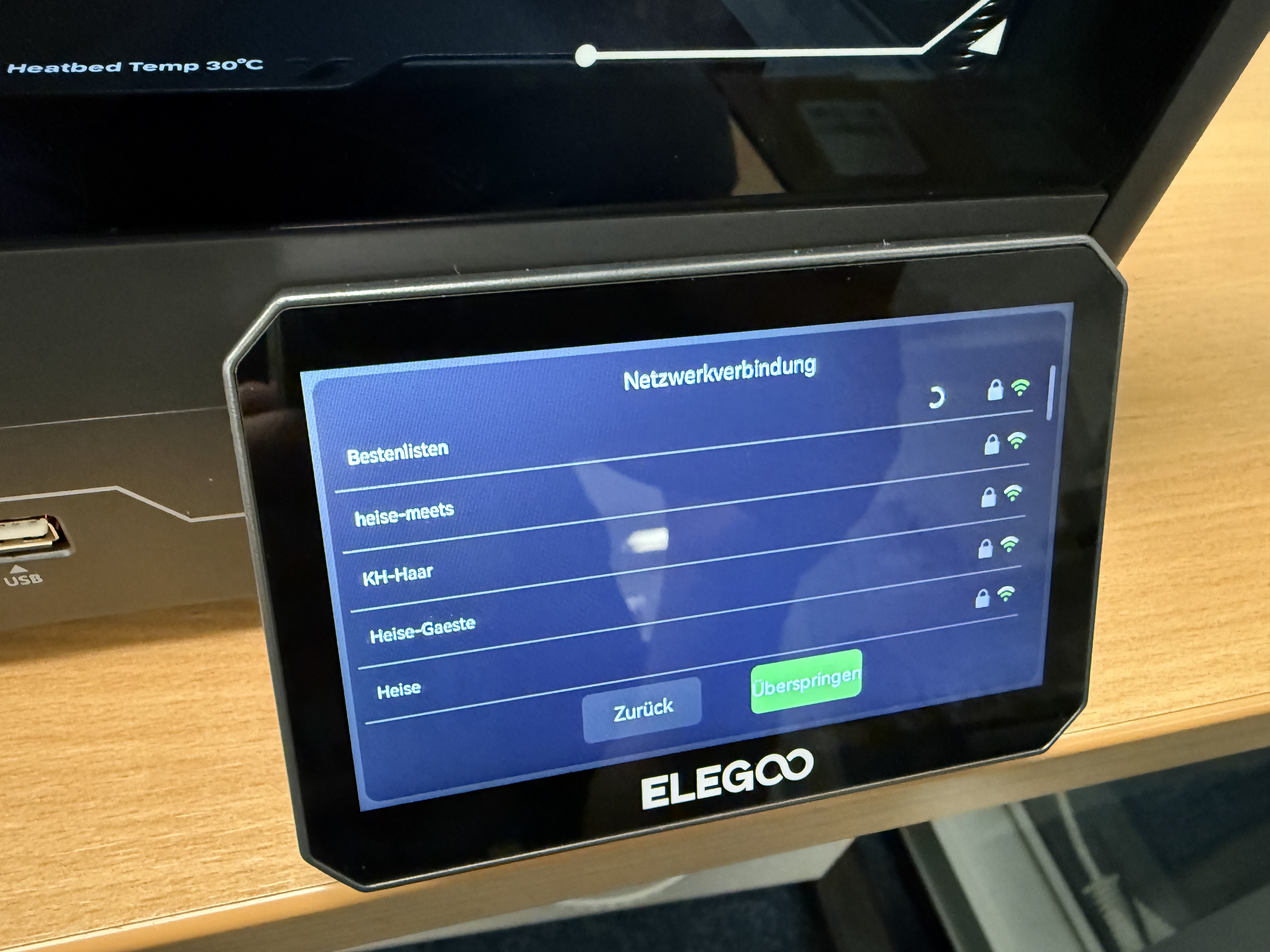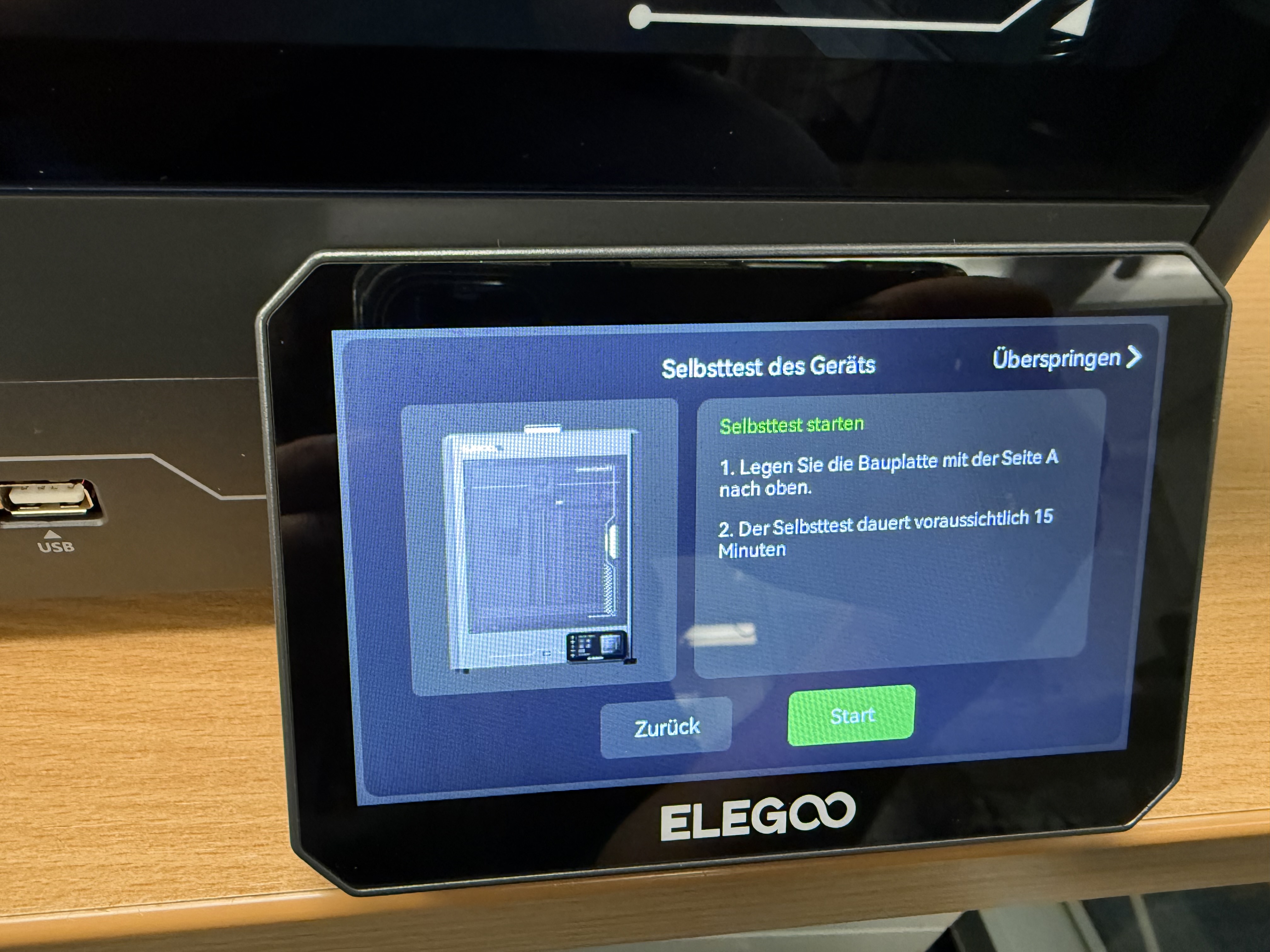 Nach dem Aufbau des Druckers erfolgt die Inbetriebnahme. Wie bei aktuellen 3D-Druckern üblich, läuft der Prozess komfortabel über das Menü ab. Schaltet man den Centauri Carbon 2 zum ersten Mal ein, öffnet sich ein Assistent, der durch die weiteren Schritte führt. Zunächst verbindet man den Drucker mit dem WLAN, wählt die Sprache und bestätigt, dass man die Transportsicherungen gelöst hat. Der Assistent spricht Deutsch – und das sehr ordentlich. Schritt für Schritt geht es an das automatische Leveln des Druckbetts, die Kalibrierung und den Selbsttest.