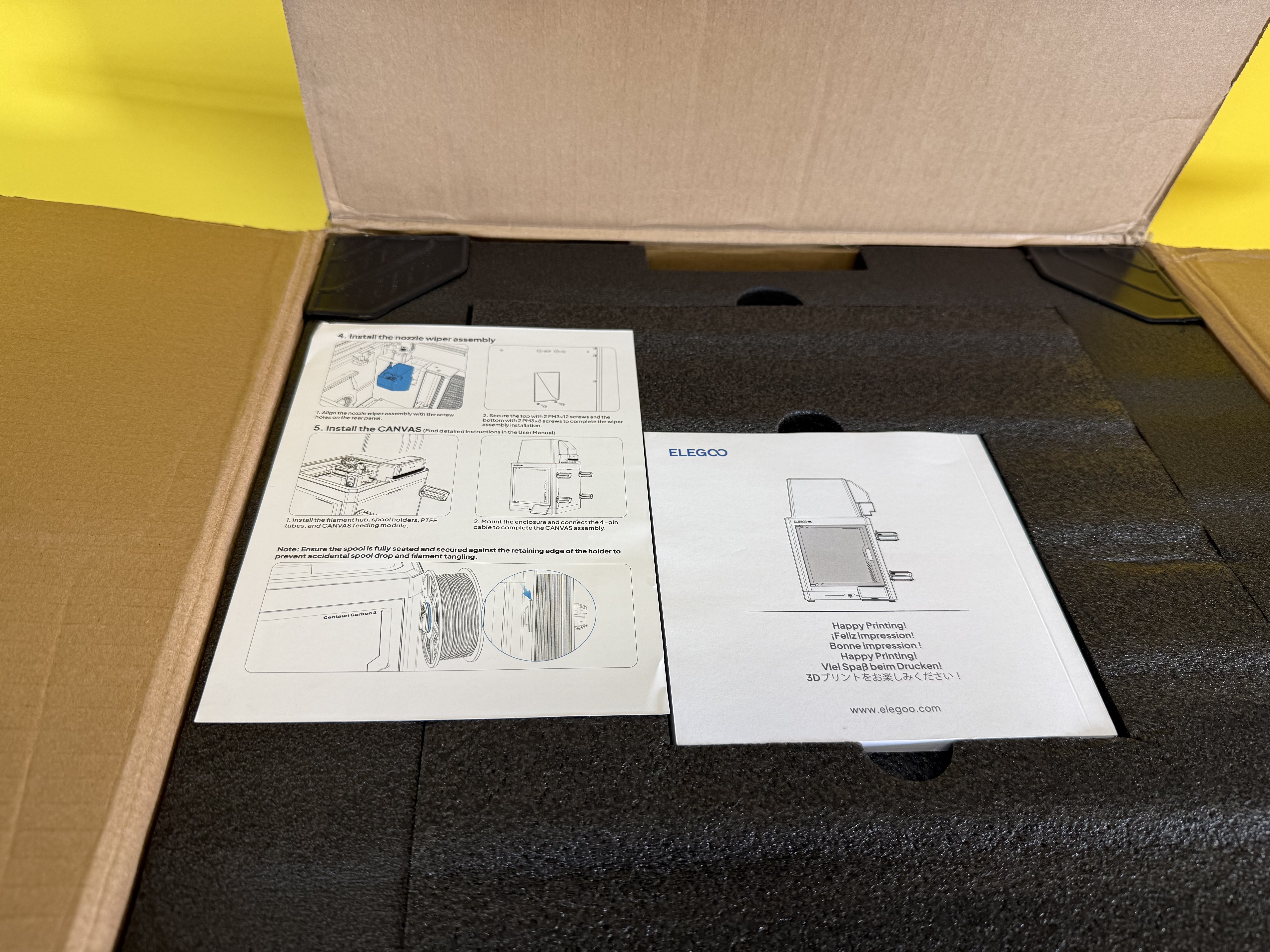 Im Inneren des stabilen Kartons befindet sich der gut in Schaumstoff eingepackte Drucker. Beim Öffnen springen einem zunächst die gedruckten Anleitungen in die Augen, die in englischer Sprache beim Aufbau und bei den ersten Schritten helfen. Zum Herausheben des Druckers aus dem Karton bietet sich eine zweite Person zur Hilfe an, im Notfall geht es aber auch allein.
