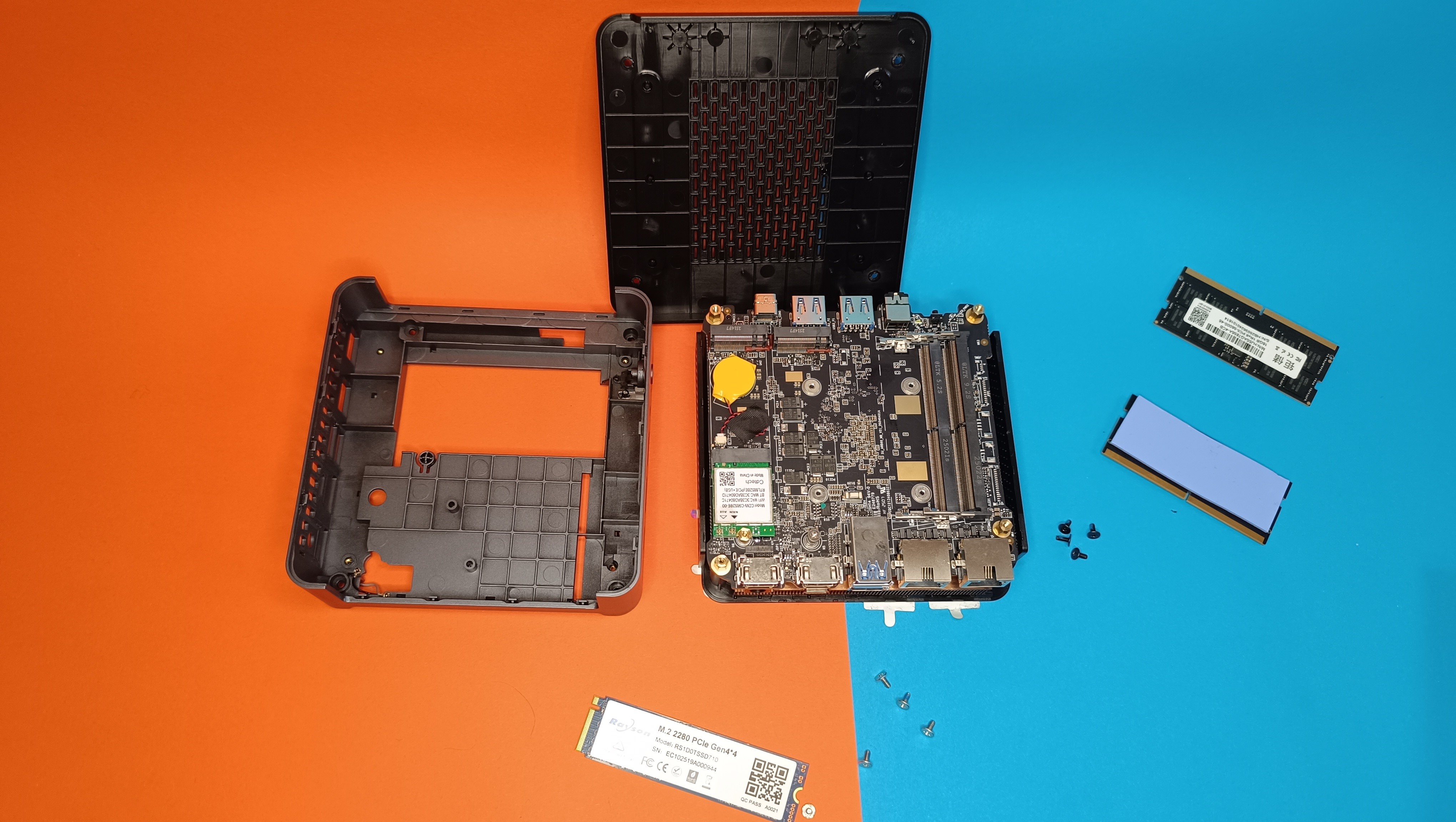 Beim Speicher gibt es 1 TB mit einer schnellen M.2-NVMe-SSD von Rayson im Formfaktor 2280. Mit Crystaldiskmark messen wir 4783 MB/s im Lesen und 4415 MB/s im Schreiben. Die Festplatte soll über PCIe 4.0 x4 angebunden sein, dafür sind die Geschwindigkeiten allerdings ein wenig gering. Das Mainboard bietet noch einen weiteren Steckplatz für eine M.2-SSD im Formfaktor 2280. Der Hersteller gibt das Kapazitätslimit mit 4 TB für den zweiten Slot an, demnach wären insgesamt bis zu 8 TB möglich.