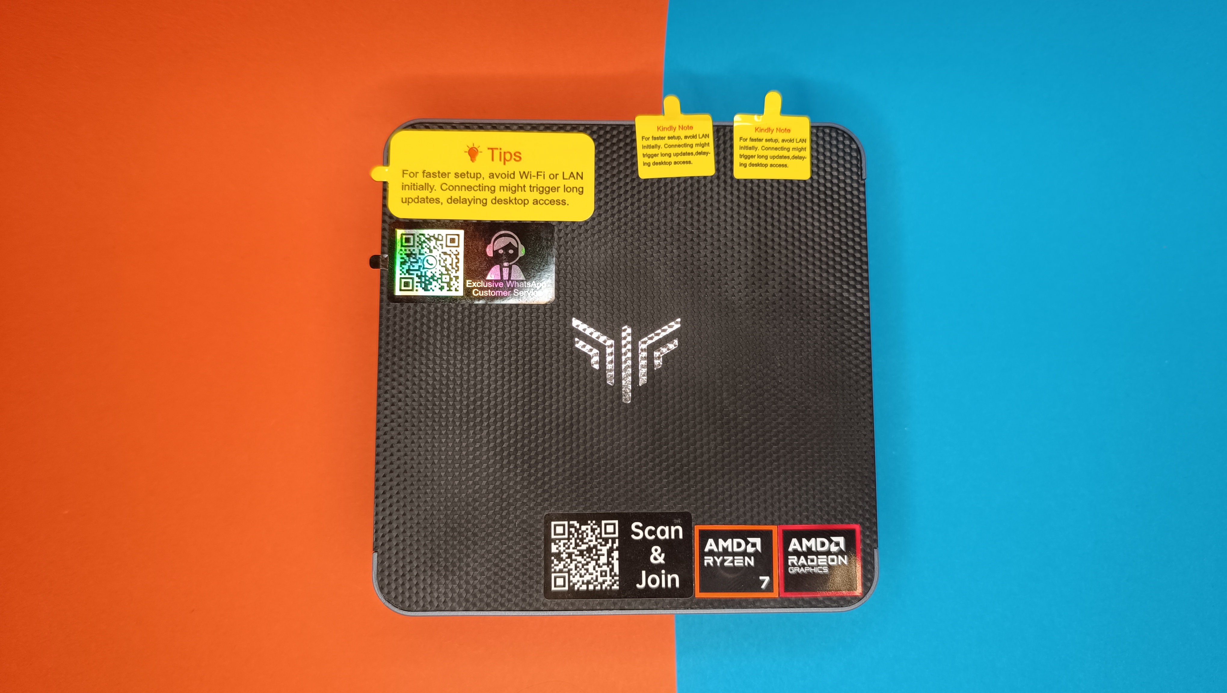 Nur leichte Schrammen können hier nicht ausgeschlossen werden, wie der Test der anderen Ausstattungsvariante mit Ryzen 9 zeigt. Seitlich und am Boden gibt es Mesh-Gitter zum Luftaustausch, die Oberseite zieren zahlreiche Sticker des Herstellers. Darunter sind neben QR-Codes zum Support auch Hinweise bei den LAN-Ports, dass die Einrichtung von Windows ohne Internet schneller abläuft. So werden nämlich nicht bereits während der Einrichtung die aktuellen Updates heruntergeladen und man landet schneller im System.
