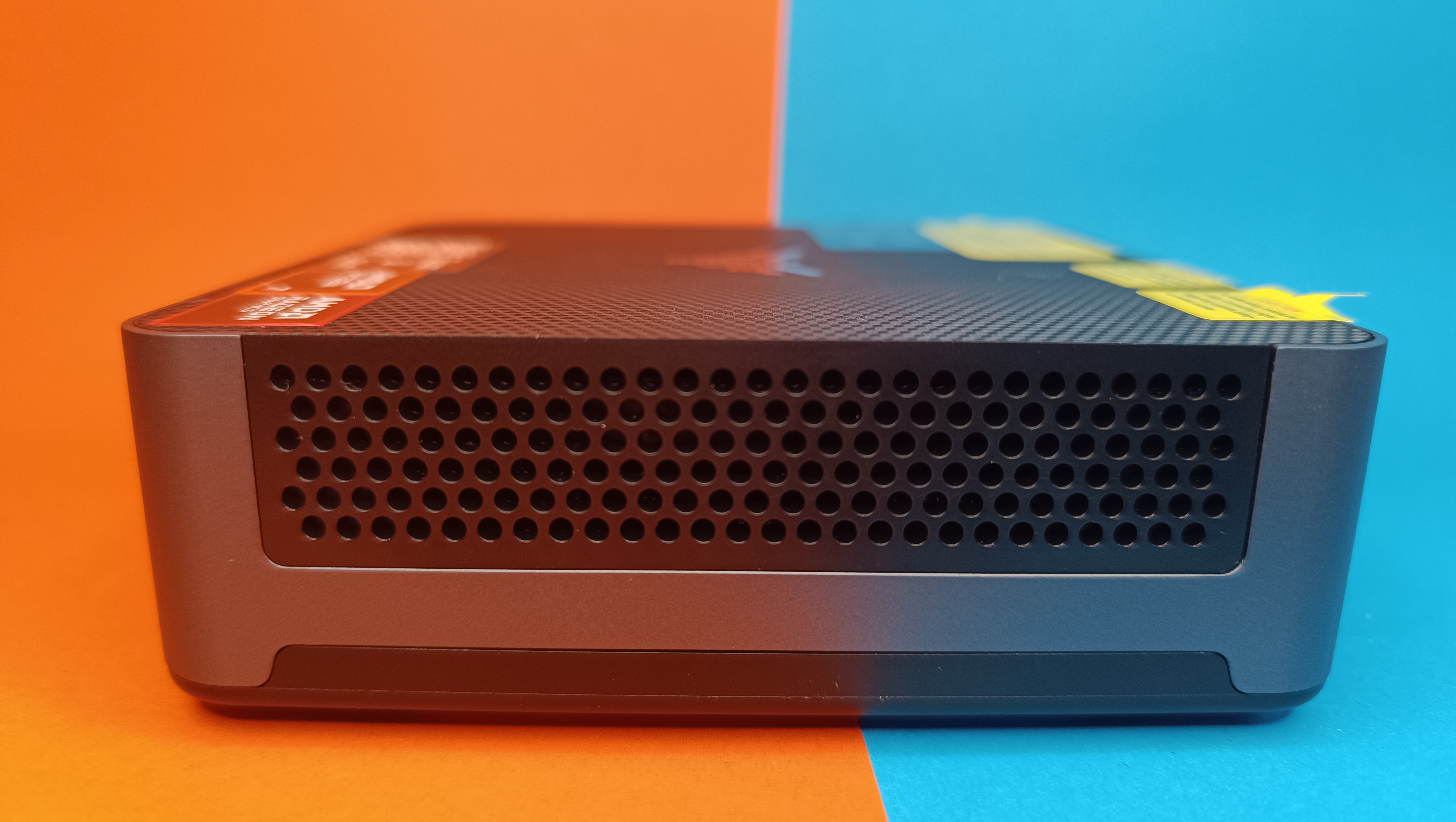 Der AM21 bietet das identische, vergleichsweise flache Gehäuse zur anderen Variante des AM21 mit Ryzen 9 6900HX (Außenmaße: 119 × 119 × 36,9 mm). Der Rahmen ist vollständig aus Kunststoff gefertigt und gut verarbeitet. Die einzelnen Paneele sind dabei allerdings sehr dünn und damit leider auch leicht biegbar. Damit fühlt sich das Gehäuse nicht so hochwertig und generell fragiler, als ein Metallgehäuse an – auf dem Tisch aber an sich kein Problem.