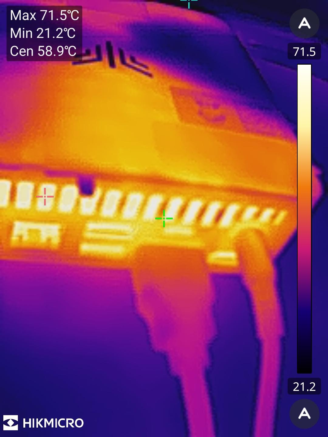 Durch die moderne Architektur ist der Ryzen 7 sehr sparsam und verbraucht im Idle gerade einmal 7 bis 8 W, sofern keine USB-Geräte angeschlossen sind. Unter Volllast des Systems mittels Aida64 steigt der Verbrauch für die ersten vier Minuten auf 72 W an. Dabei taktet die CPU mit rund 3,4 GHz, die iGPU mit knappen 1,8 GHz bei einer Leistungsaufnahme von 54 W nur für das SoC. Anschließend fällt der Verbrauch über 30 Sekunden stetig auf einen Endwert von 62 W. Dabei taktet die CPU dann nur noch mit 3,1 GHz und die iGPU mit 1,7 GHz. Diesen Zustand behält das System dann dauerhaft bei.