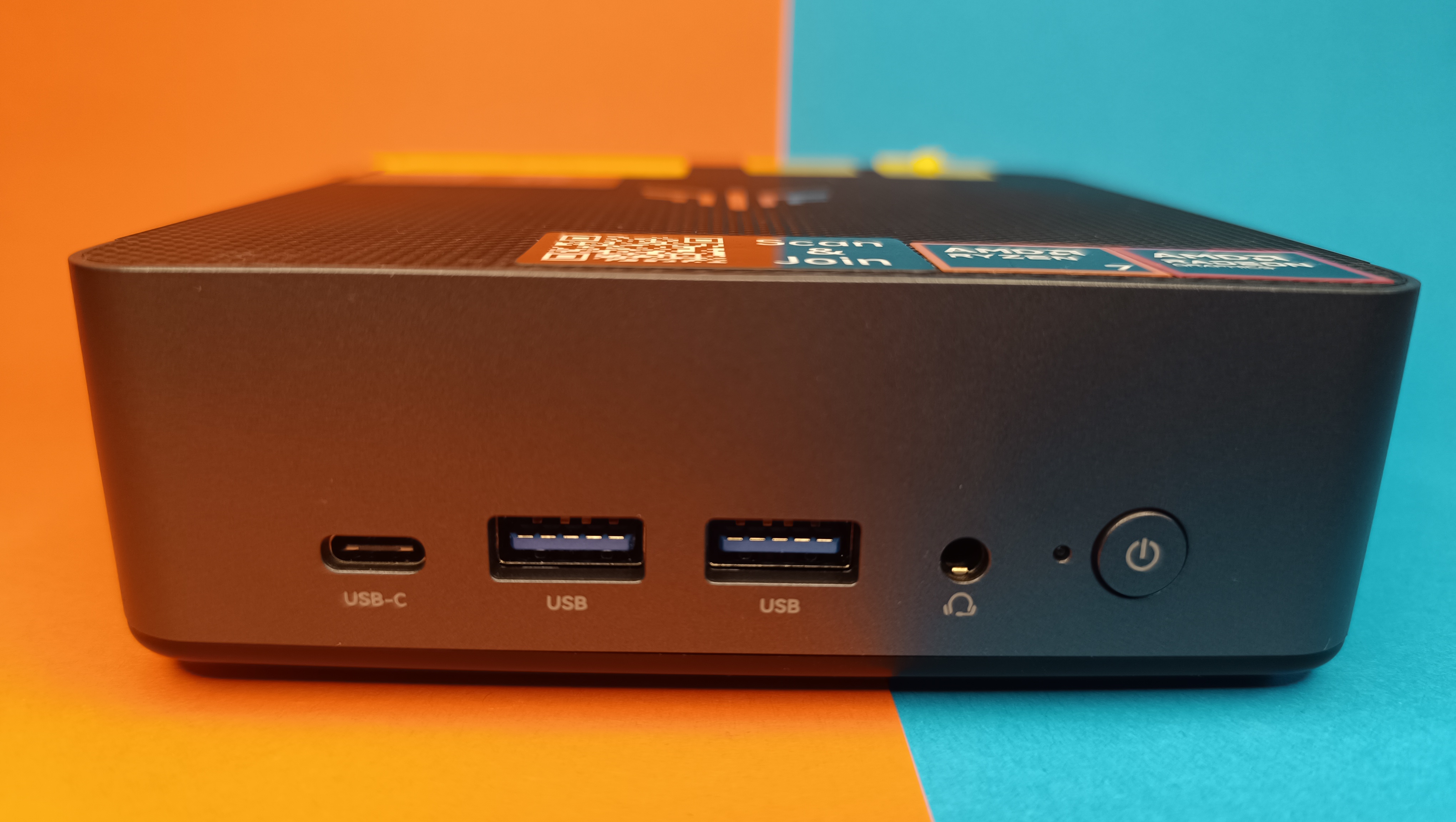 Bei den Anschlüssen stellt der Mini-PC zweimal HDMI 2.1 und zweimal USB-C bereit. Dabei handelt es sich nur bei Port auf der Rückseite um USB4 mit 40 Gbps und Displayport (DP 1.4) und Eingangsstromversorgung. Auf der Vorderseite gibt es nur USB 3.2 in Typ C mit 10 Gbps, aber auch Displayport 1.4.