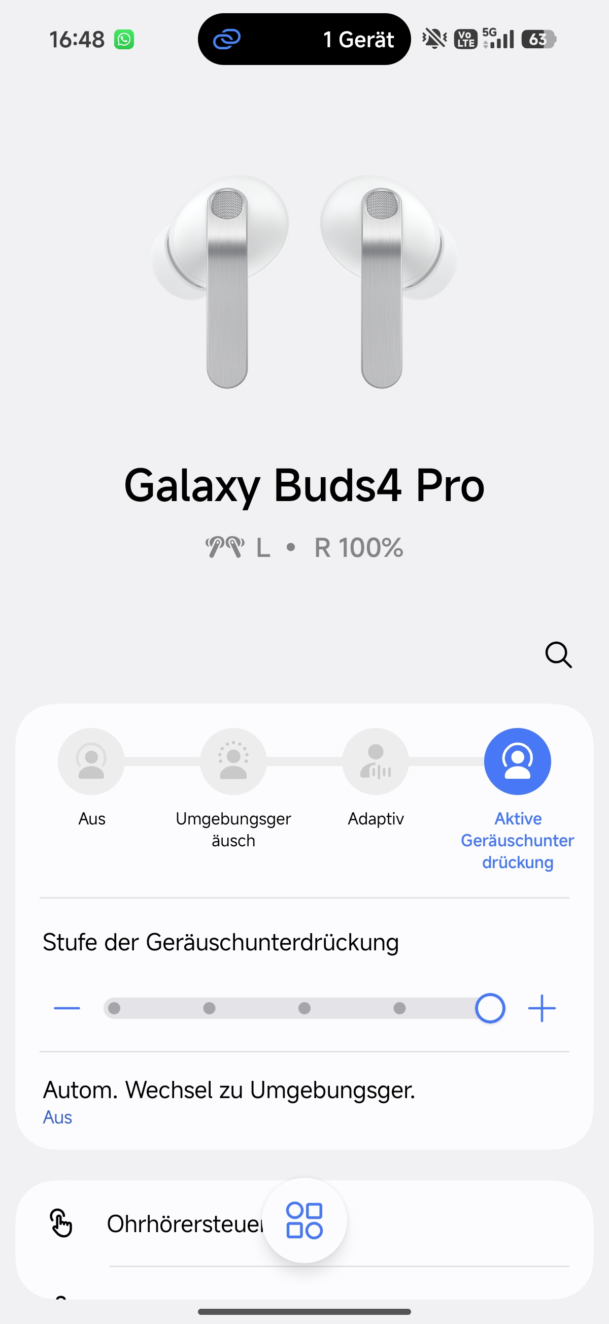 Bei der aktiven Geräuschunterdrückung lässt sich ein neues Niveau attestieren: War das Vorgängermodell noch ein gutes Stück von der ANC-Spitzenklasse entfernt, können die Galaxy Buds 4 Pro nun endlich aufschließen – wenn auch nicht übertrumpfen. Vor allem die Unterdrückung hoher Töne wie Stimmen hat sich massiv verbessert. Ähnliches gilt für den Transparenzmodus, der sich schön natürlich anhört und die eingesetzten Earbuds schnell vergessen lässt. Sowohl Geräuschunterdrückung als auch Transparenzmodus lassen sich in fünf Stufen regeln. Alternativ arbeitet das ANC adaptiv und passt sich automatisch an die Umgebung an.