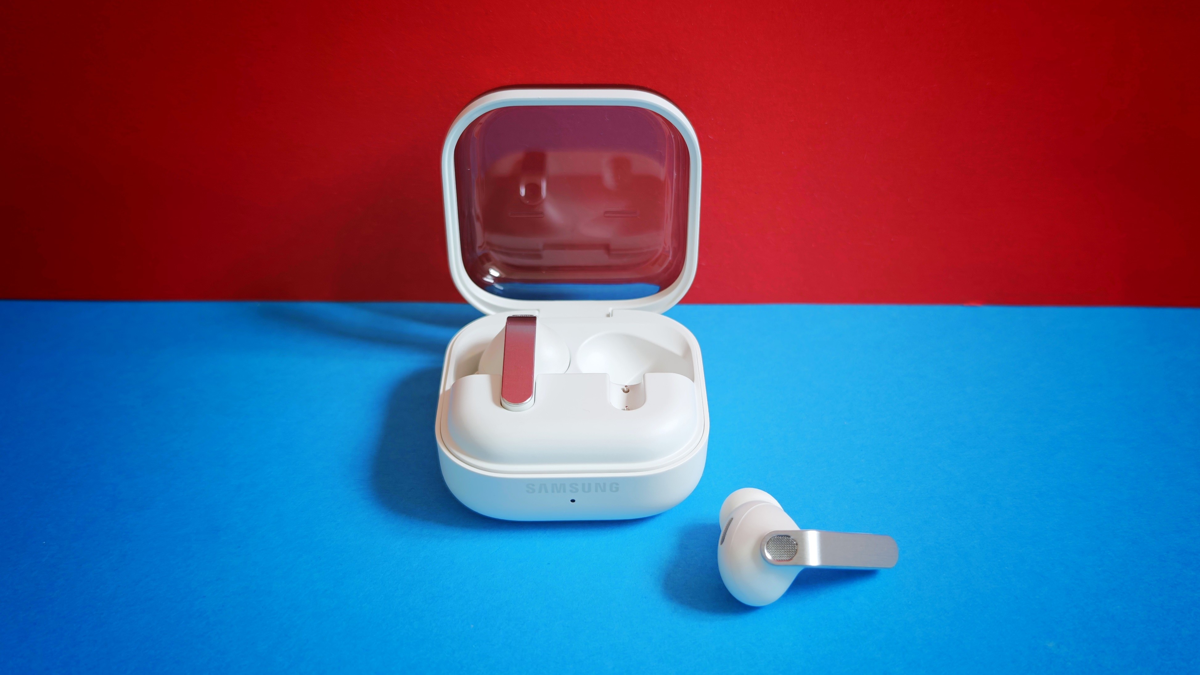 Schon beim ersten Blick zeigt sich: Die Galaxy Buds 4 Pro haben ein deutliches Design-Update bekommen. Der Leuchtstreifen des Vorgängers weicht einer markanten Metall-Abdeckung an der Außenseite. Ansonsten bleibt Samsung dem klassischen In-Ear-Look mit Stift treu. Das Zusammenspiel aus runden und kantigen Formen ist auffällig und ungewohnt zugleich – uns gefällt es überaus gut.