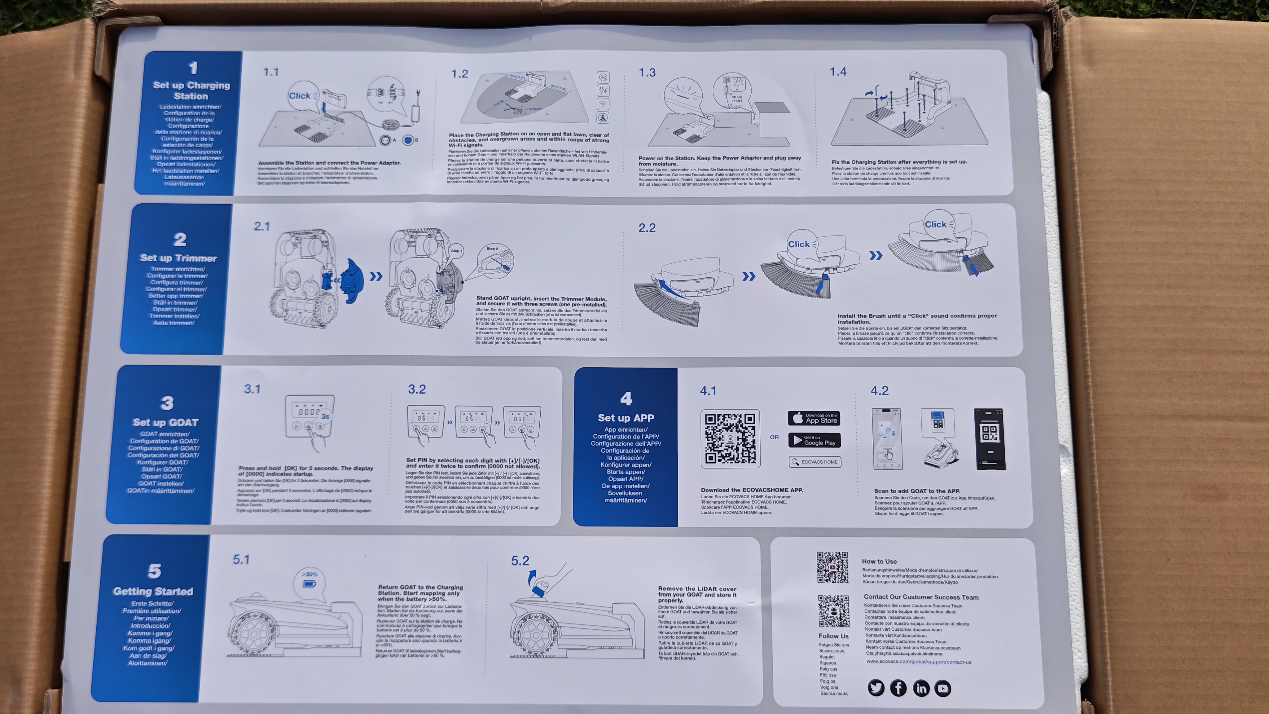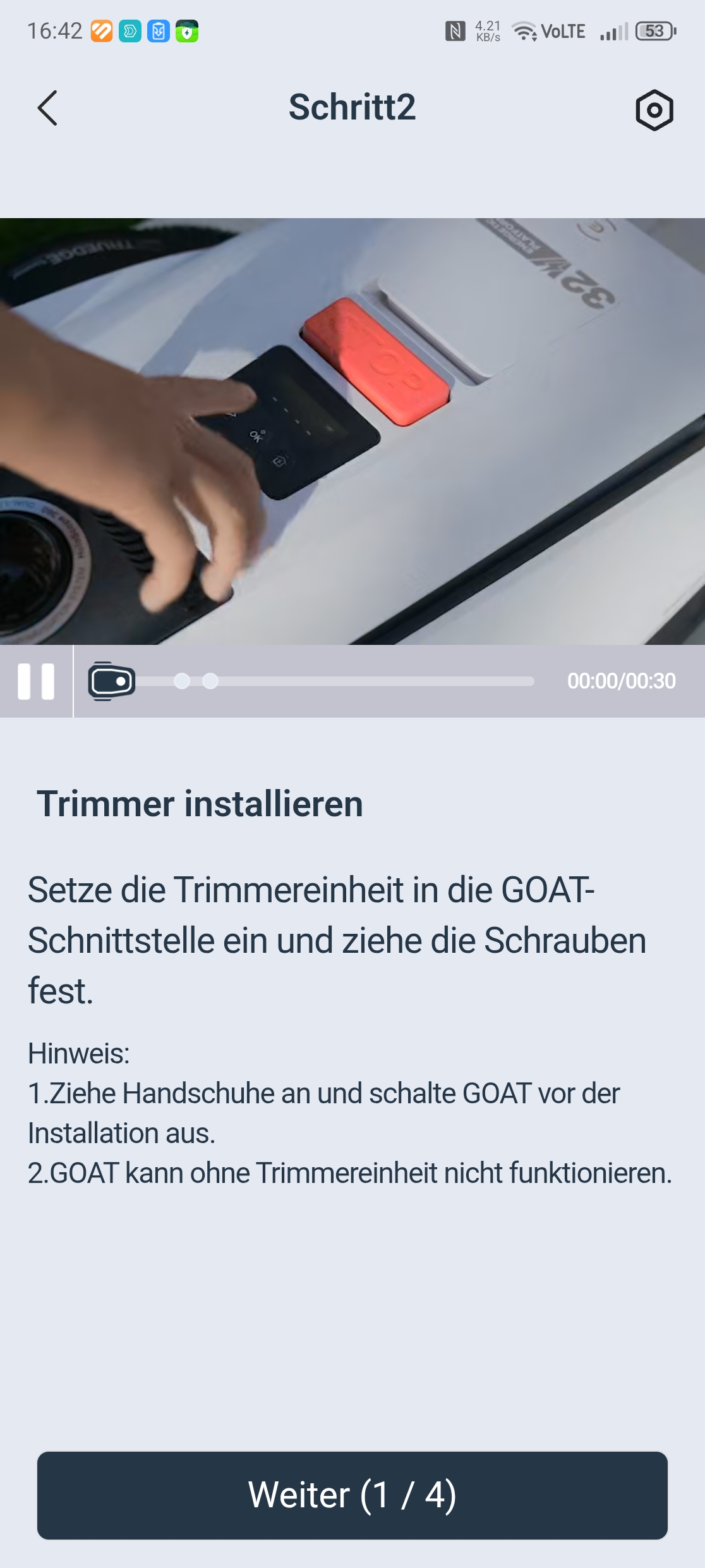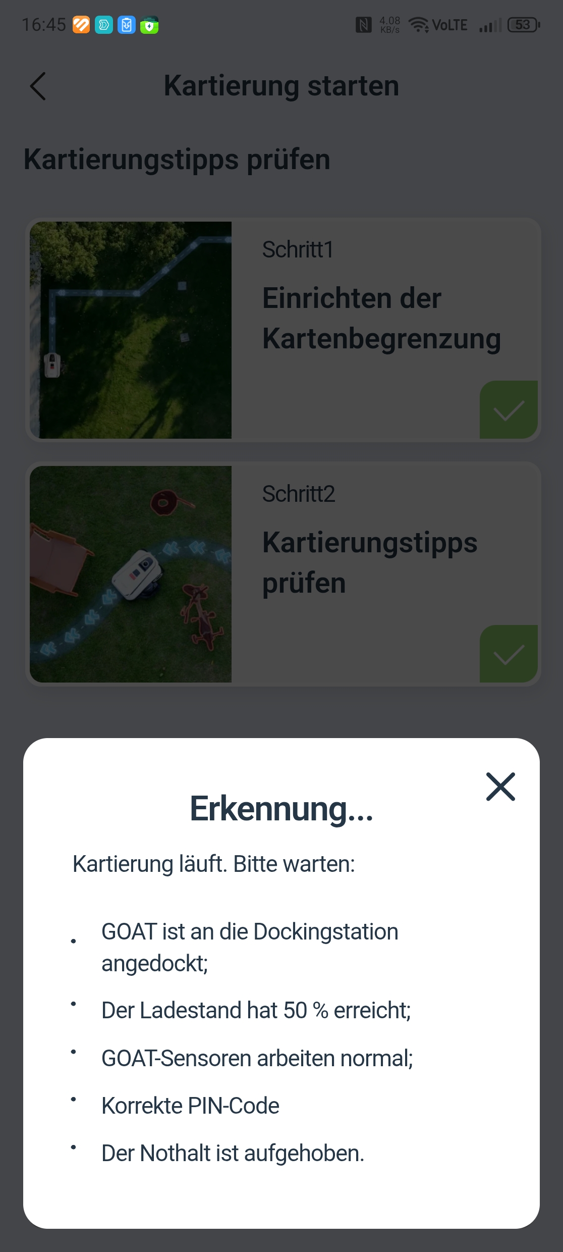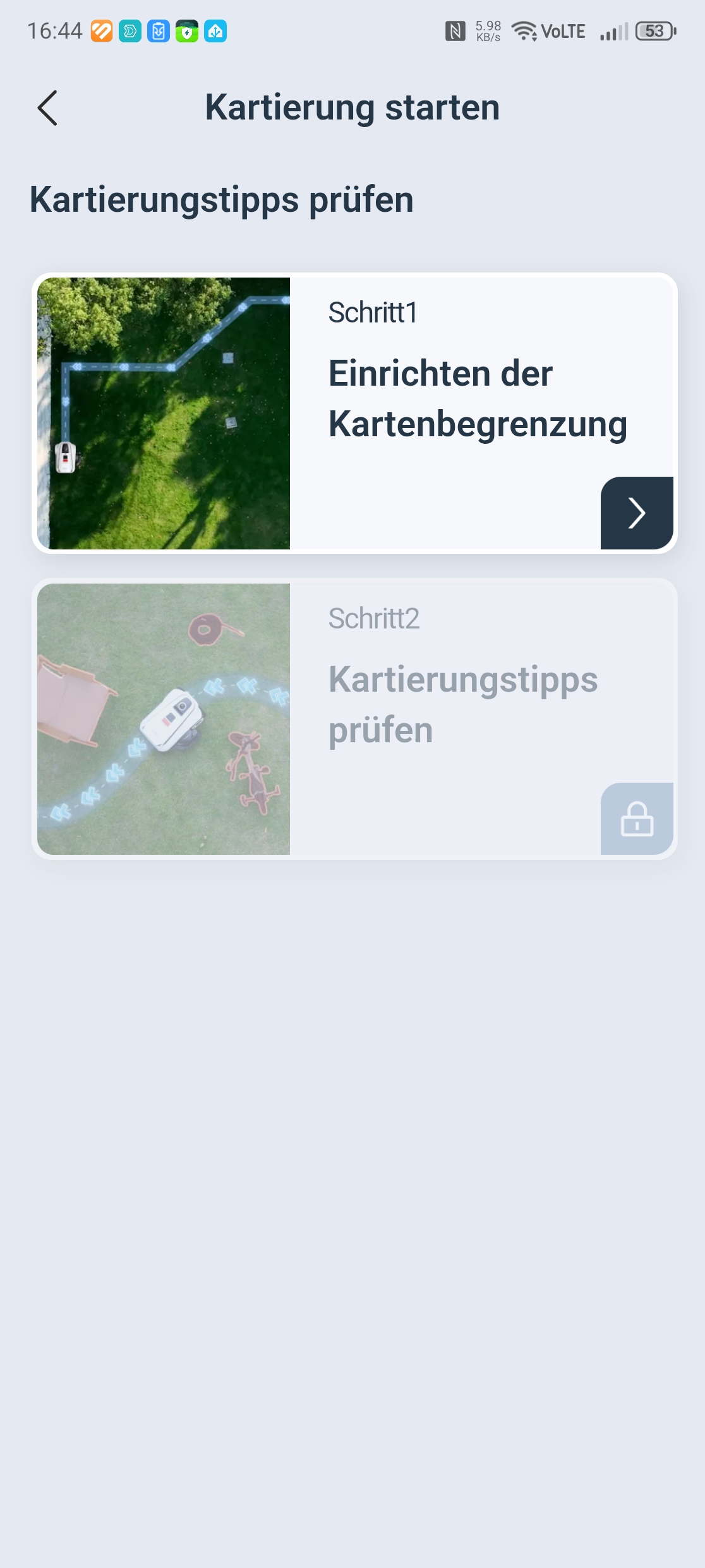 Die Einrichtung über die Ecovacs-App ist vorbildlich gelöst. Eine Schritt-für-Schritt-Anleitung mit Bildern führt durch Bluetooth-Kopplung, QR-Code-Scan und WLAN-Verbindung über 2,4 GHz – auch in gemischten Netzen gab es keine Probleme. Nach einem obligatorischen Firmware-Update war der Roboter in etwa 30 Minuten startklar. Einzig die Montage des Trimmermoduls erfordert etwas Geduld und einen Kreuzschlitzschraubendreher mit langer Klinge von mindestens 10 cm, da eine Schraube tief im Gehäuse sitzt.