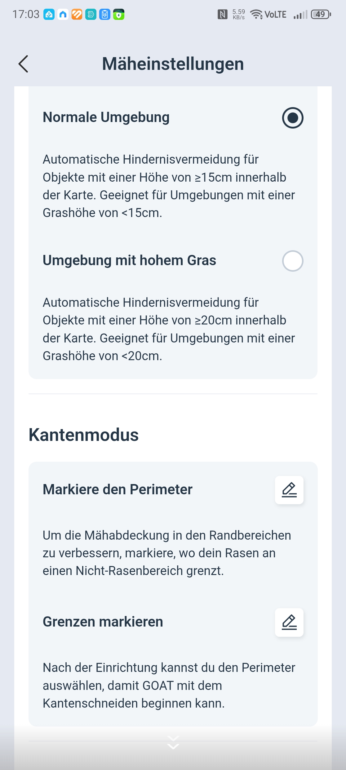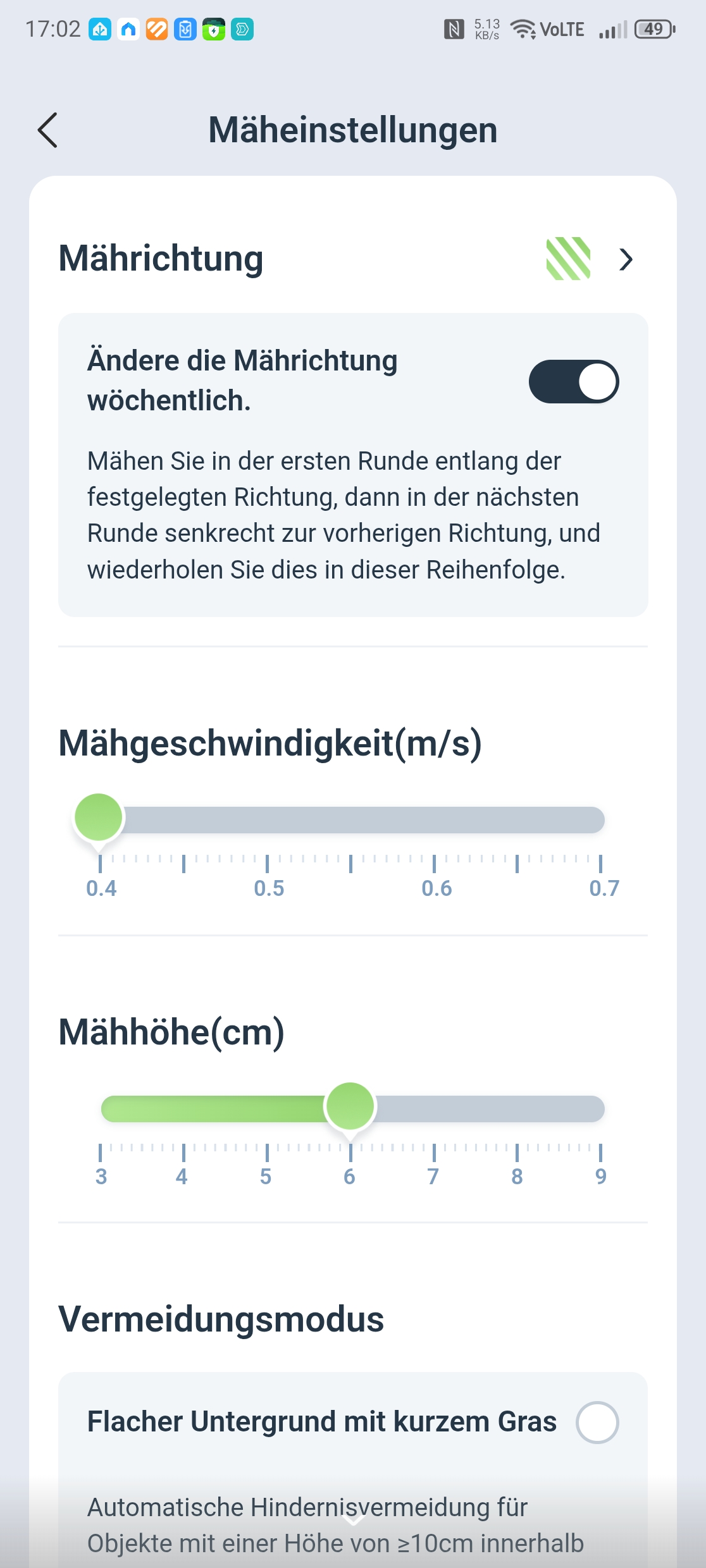 Ganz ohne Kritikpunkte bleibt die Navigation allerdings nicht. Die Hinderniserkennung reagiert gelegentlich übervorsichtig auf hohes Gras oder Löwenzahn, was die Mähzeit unnötig verlängert. Hier hilft die Anpassung des Vermeidungsmodus in der App, der sich auf 10, 15 oder 20 cm konfigurieren lässt. Auch die Überlappung der Mähbahnen schwankt stellenweise, was den insgesamt guten Gesamteindruck etwas trübt. Die Hindernisumfahrung funktioniert im Nahbereich bis auf etwa 5 cm Abstand, was für die meisten Alltagssituationen ausreicht.