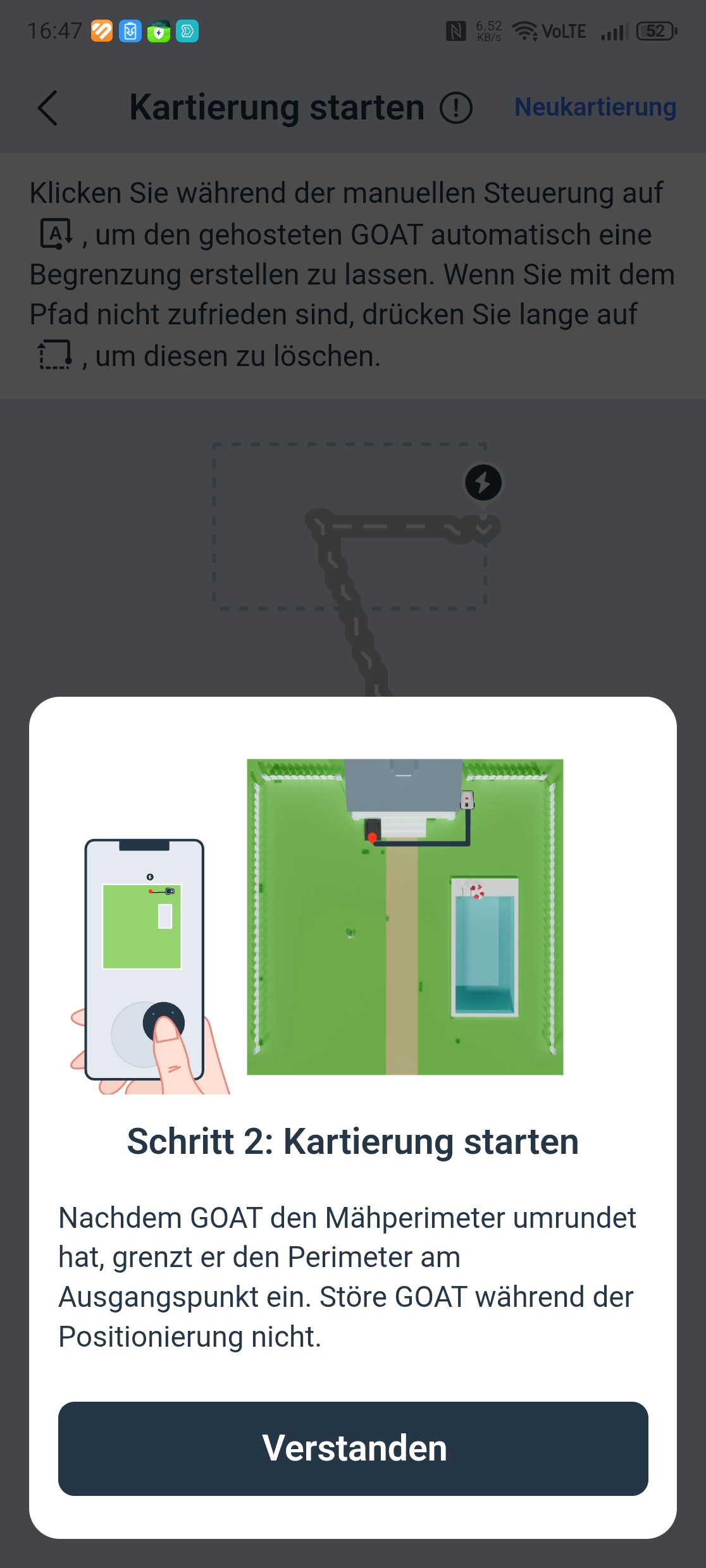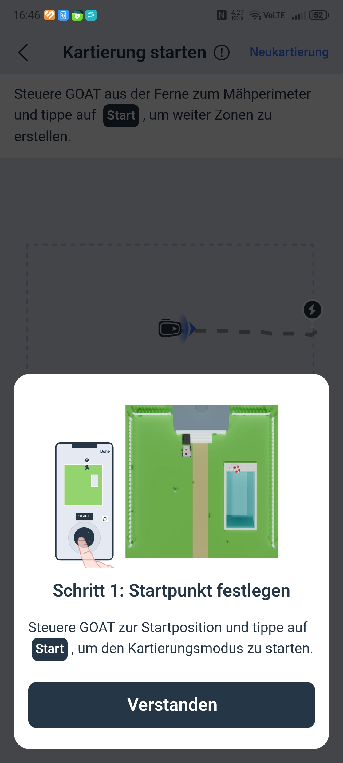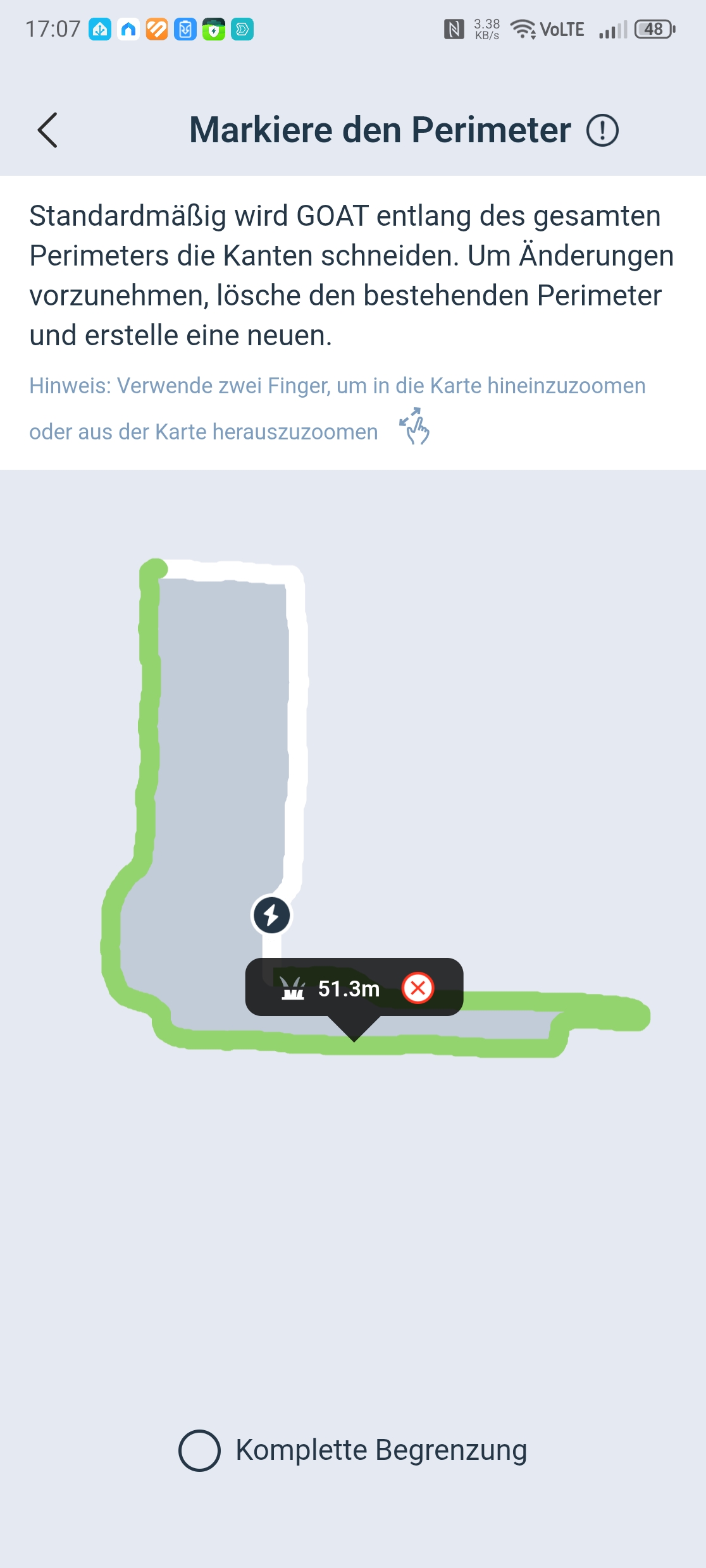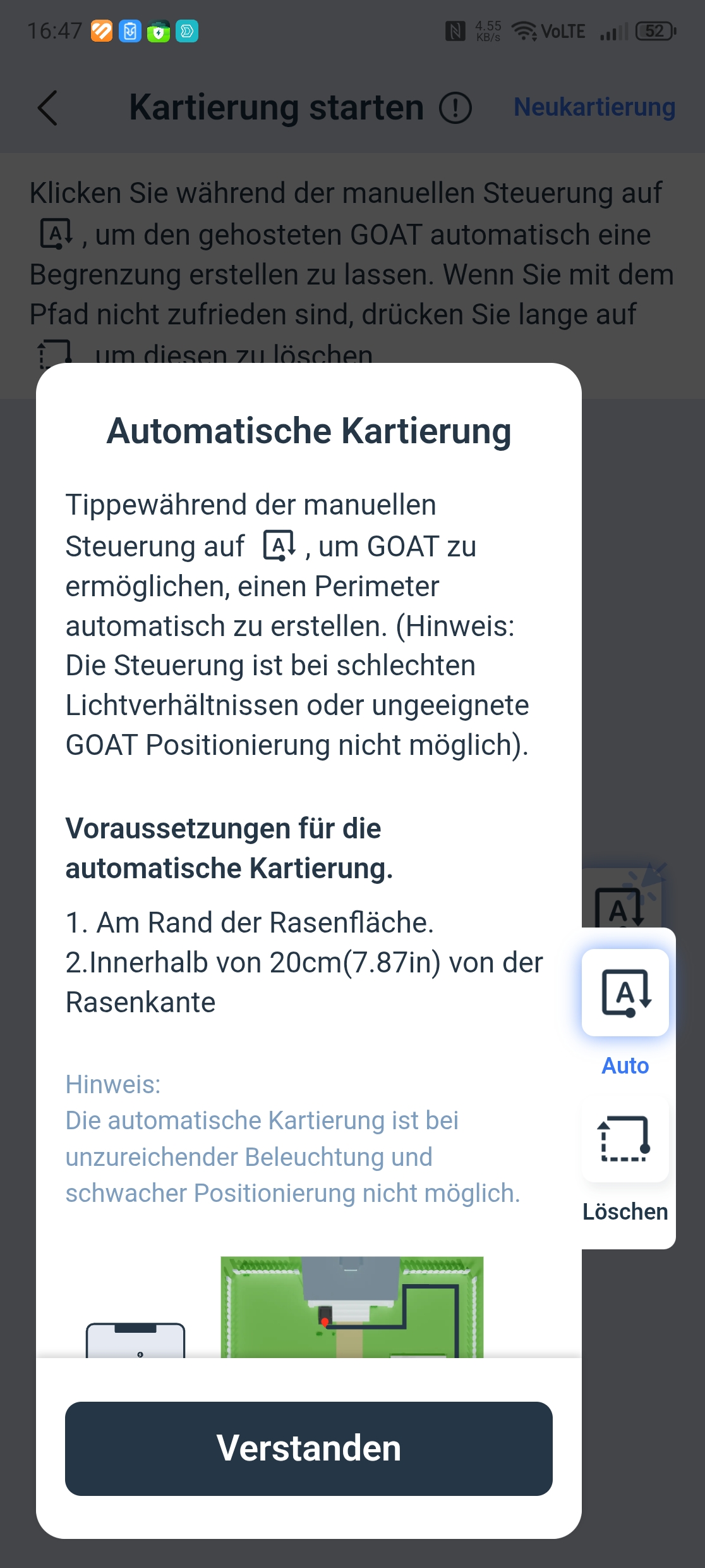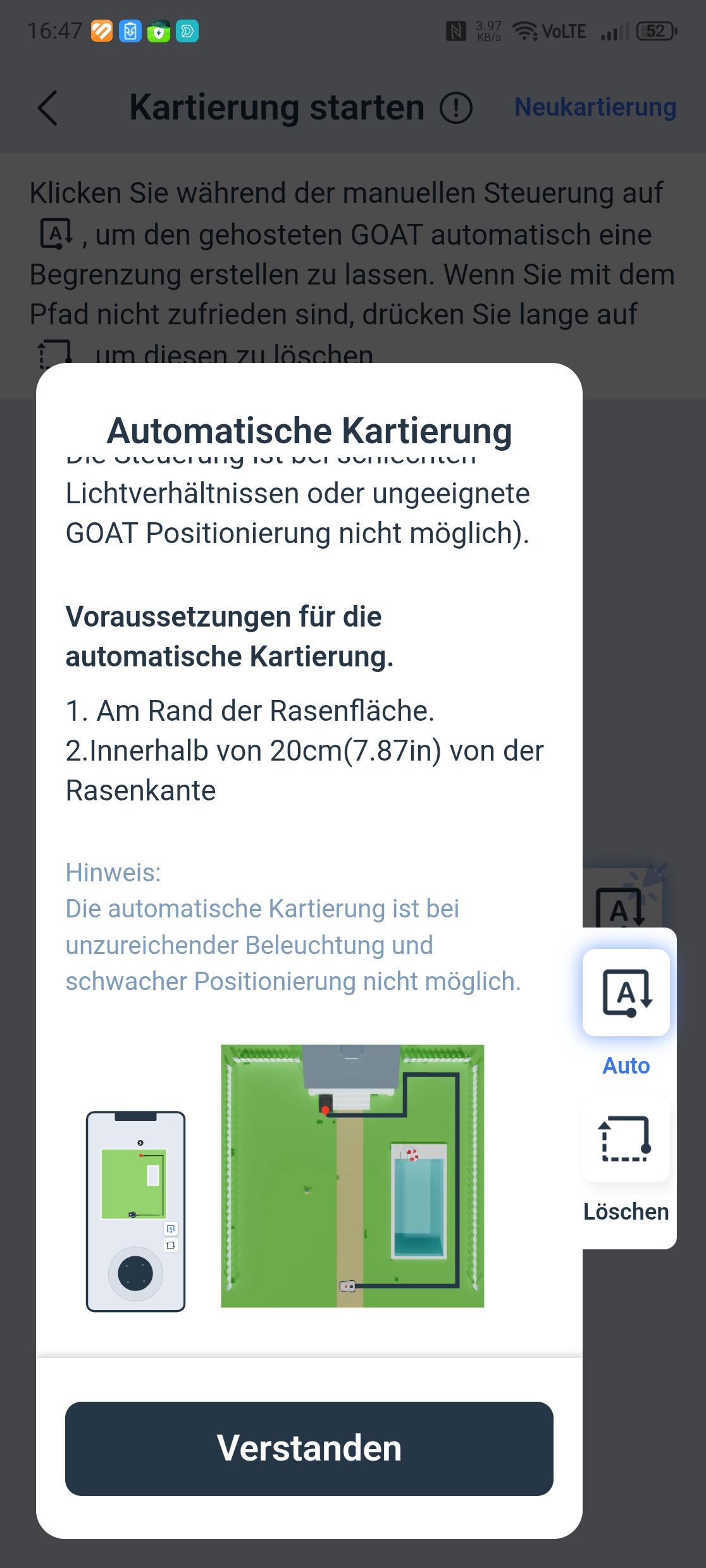 Der Ecovacs Goat A3000 LiDAR bietet eine automatische Kartierung, die allerdings nur funktioniert, wenn die Rasenfläche klar abgegrenzt ist. In unserem Test-Garten mit offenen Übergängen kartieren wir manuell. Die Methode liefert in jedem Fall die präziseren Ergebnisse.