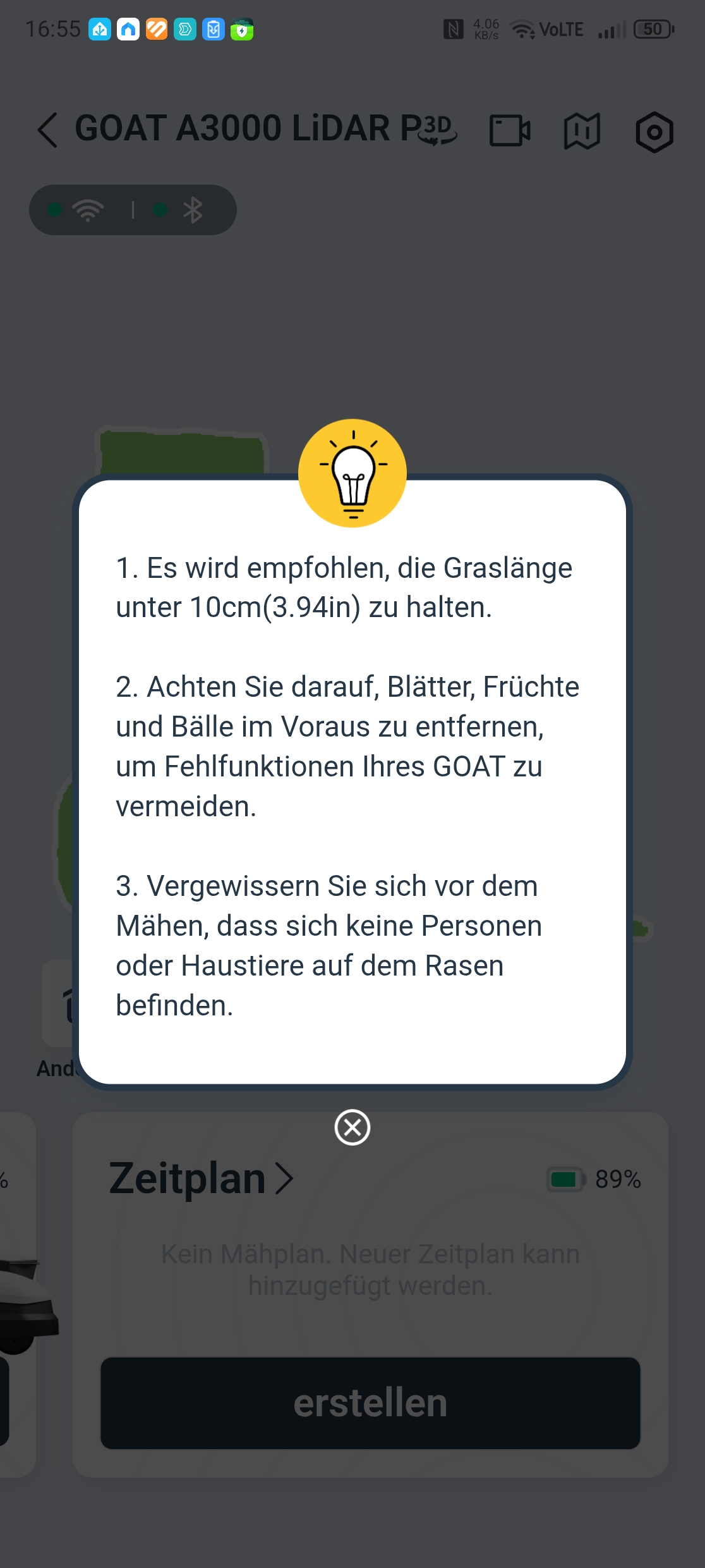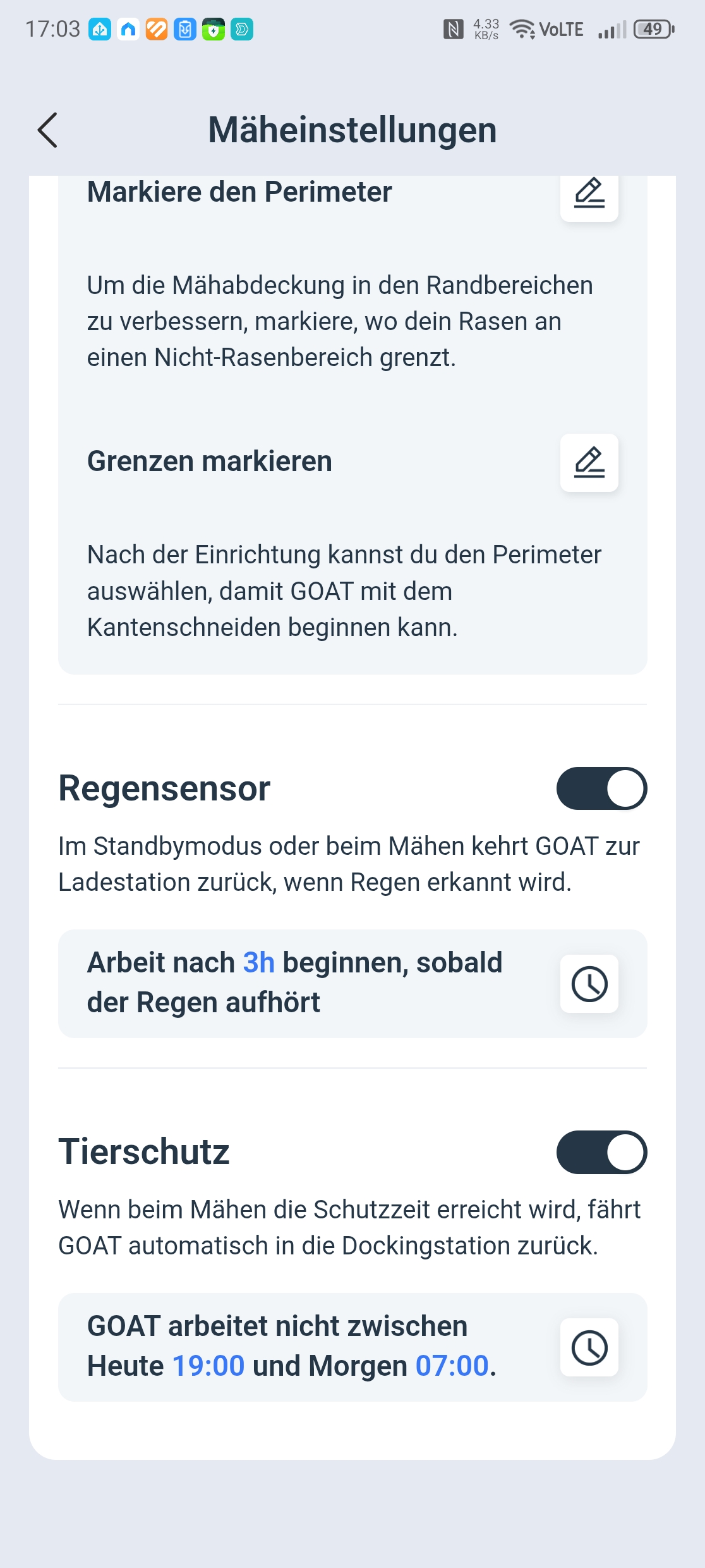 Die Kombination aus LiDAR, Kamera und ToF-Sensor erkennt selbst kleine Gegenstände zuverlässig, eine hundertprozentige Garantie gibt es dennoch nicht. Zum Schutz nachtaktiver Tiere wie Igel sollte der Mähroboter ausschließlich tagsüber betrieben werden. In einigen Kommunen gibt es bereits Nachtfahrverbote mit empfindlichen Geldbußen – in Leipzig beispielsweise bis zu 50.000 Euro. Geht es nach dem Deutschen Städtetag, könnte ein solches Verbot bald bundesweit gelten. In der Ecovacs-App lassen sich entsprechende Tierschutz-Zeiten definieren, die standardmäßig auf 19:00 bis 7:00 Uhr eingestellt sind.