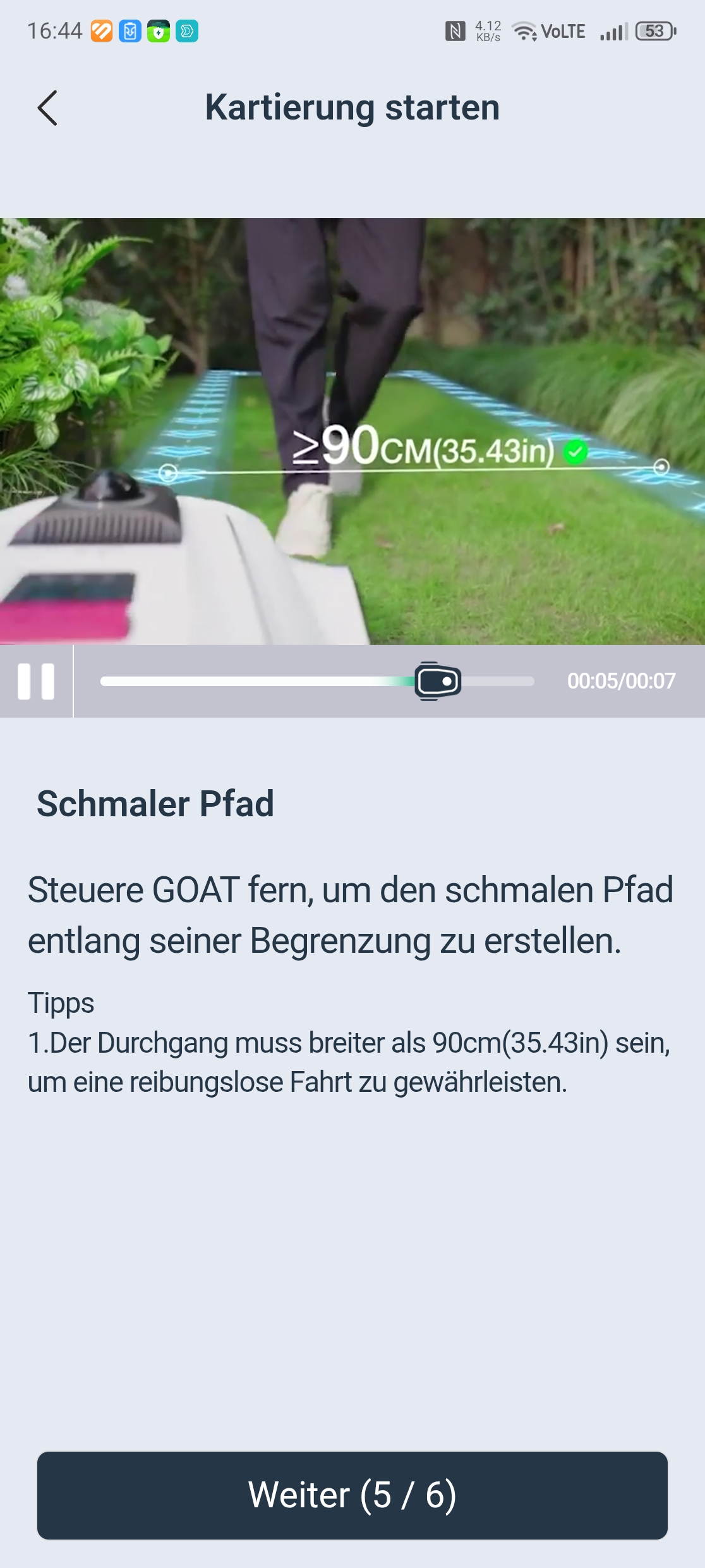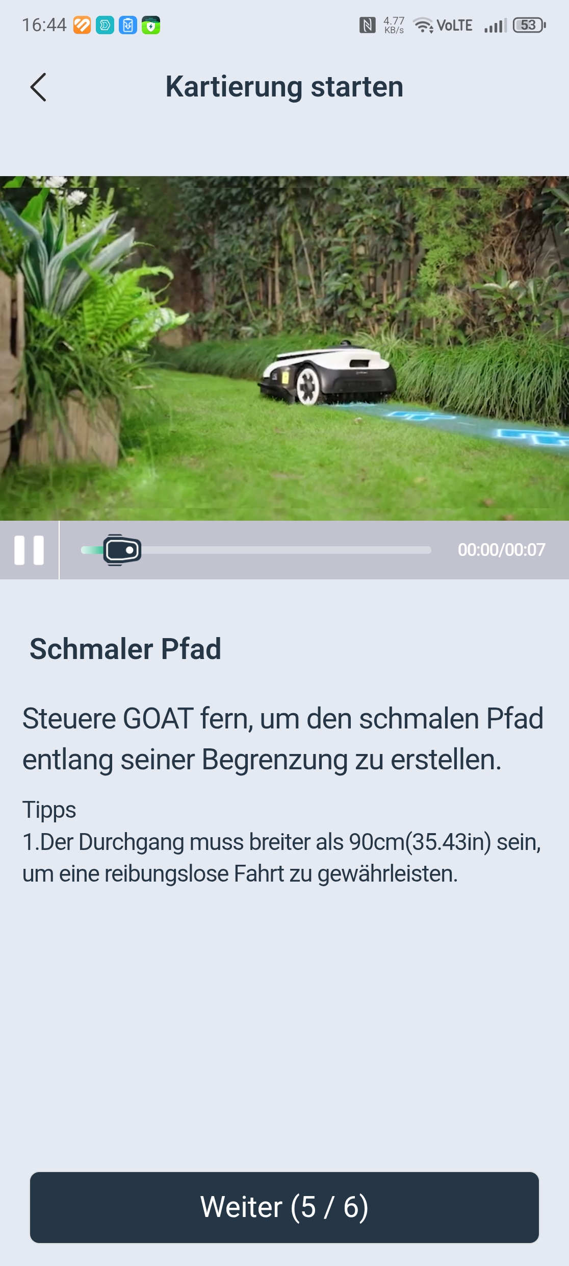 Die Mindestdurchfahrtsbreite gibt Ecovacs mit 90 cm an. Die 70 cm breite Engstelle im Testgarten konnte der Ecovacs Goat A3000 LiDAR Pro nicht passieren – anders als noch der Vorgänger Goat A3000 LiDAR ohne Pro-Zusatz. Für Gärten mit schmalen Durchgängen ist das eine relevante Einschränkung.