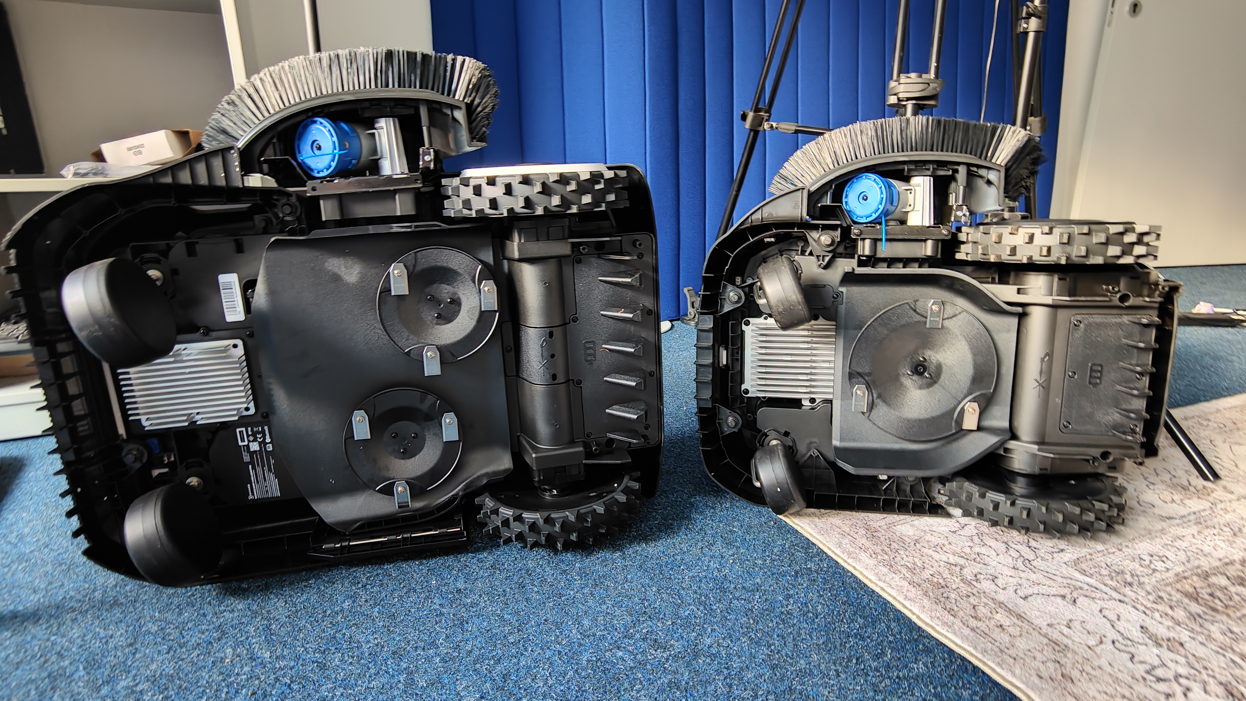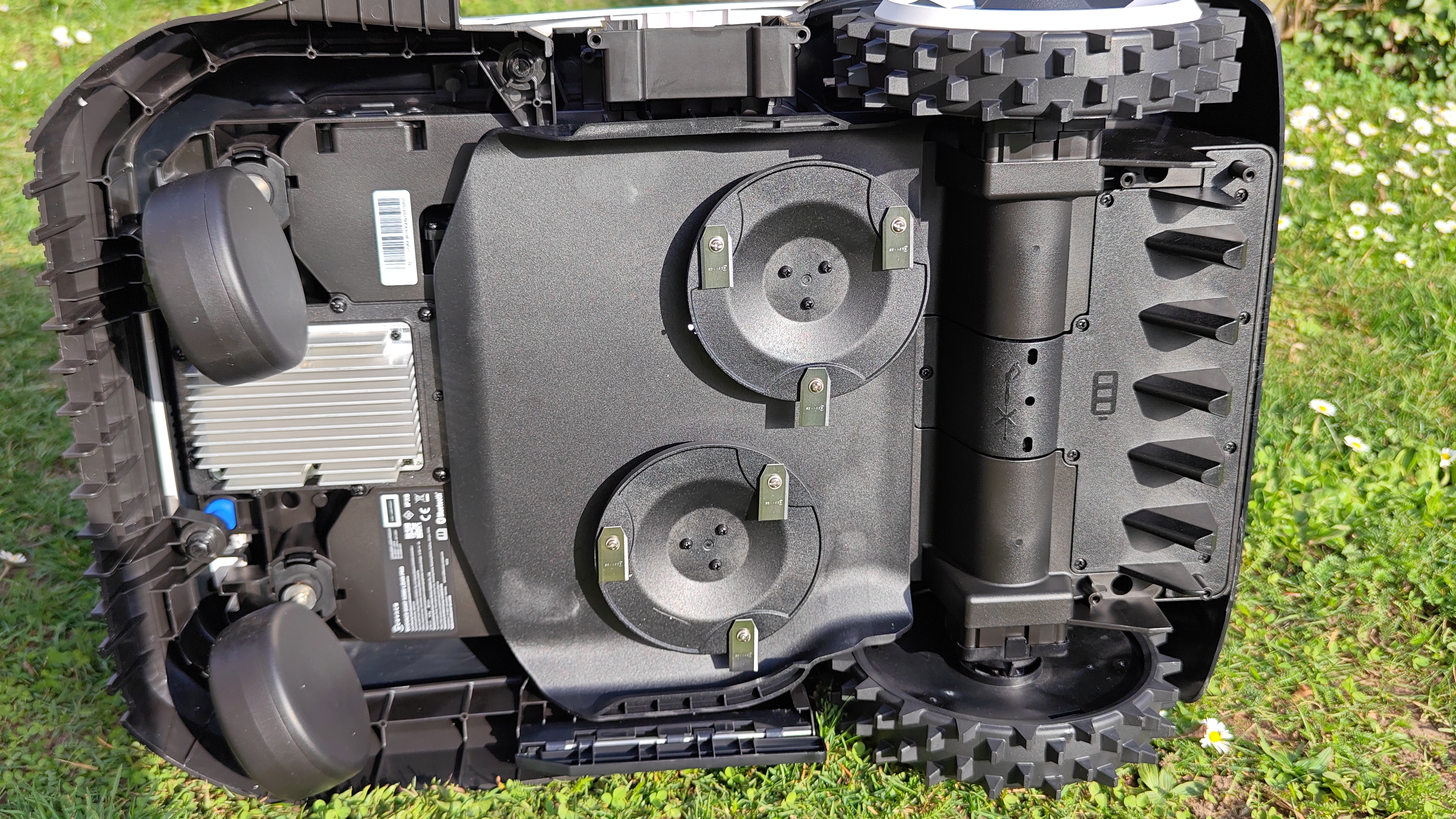 Auf der Oberseite thront die charakteristische 360°-LiDAR-Kuppel, die sich mit einer Schutzkappe abdecken lässt. Frontseitig ergänzen eine KI-Fischaugenkamera mit 150° horizontalem und 80° vertikalem Blickfeld sowie ein 3D-ToF-LiDAR mit 90° horizontalem und 70° vertikalem Erfassungswinkel bei einer Reichweite von 3 bis 4 Metern das Sensorsystem. Ein integriertes Display mit drei Tasten und eine gut erreichbare rote Stopptaste erlauben die Bedienung auch ohne Smartphone. Auf der Unterseite arbeiten zwei Messerscheiben mit jeweils drei Klingen bei 3.000 Umdrehungen pro Minute. Der seitliche Fadentrimmer wird separat montiert.