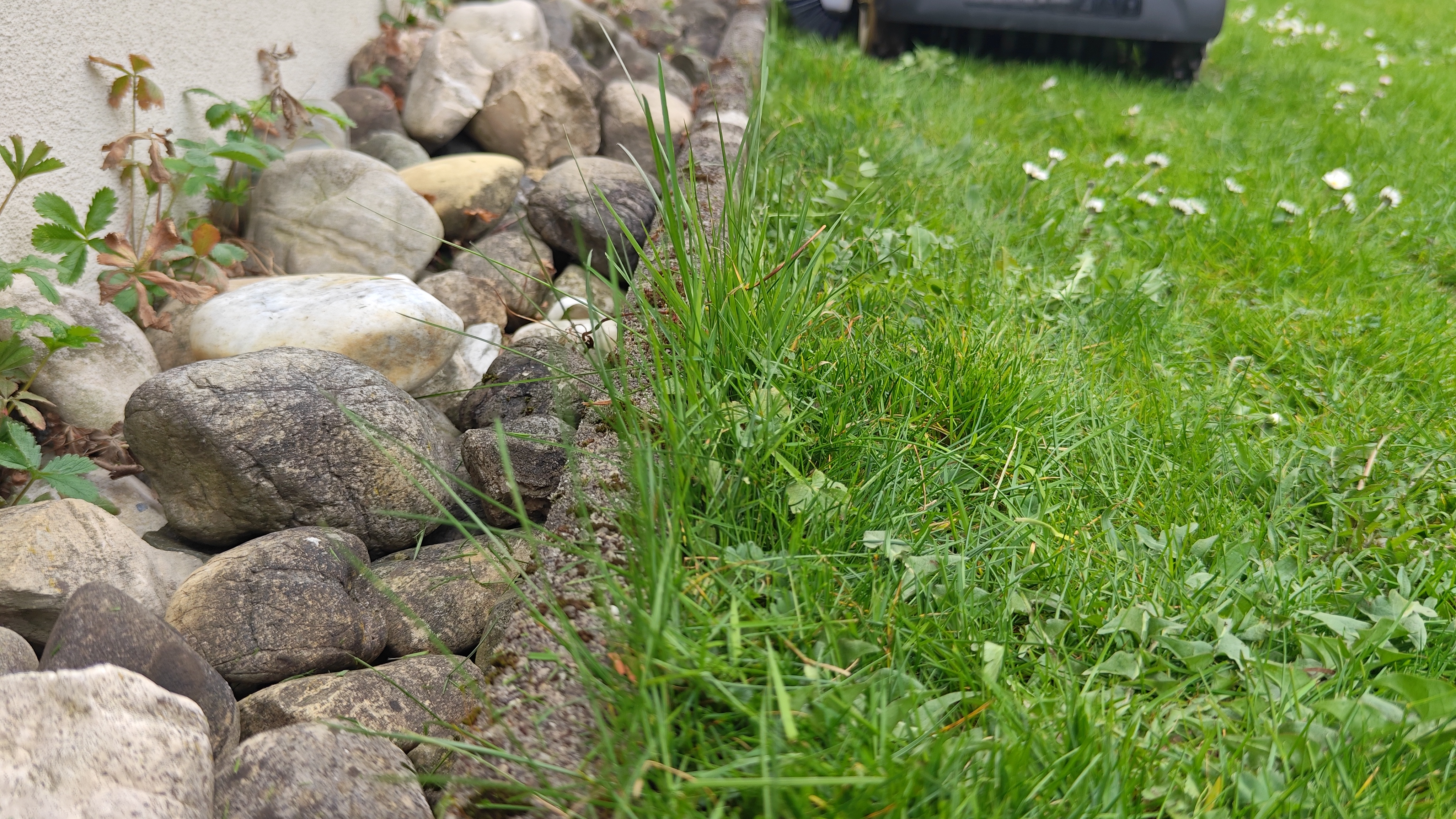 An den Außengrenzen des Gartens funktioniert das Trimmen zufriedenstellend – es bleibt deutlich weniger Nacharbeit als bei Mährobotern ohne Trimmer. Allerdings zeigten sich im Praxistest mehrere Schwächen: Der Roboter verlor gelegentlich ohne ersichtlichen Grund den Kontakt zum Rasenrand, navigierte ins Flächeninnere oder stoppte den Trimmer während der Fahrt. An Sperrflächen hielt er einen viel zu großen Abstand von 10 bis 20 cm, obwohl diese auf 1 bis 2 cm genau kartiert waren – der Trimmer wurde dort wirkungslos. Zudem kann die feste Bauhöhe von 6 cm dazu führen, dass der Trimmer an Randsteinen aufsetzt, wenn der Rasen tiefer als die angrenzende Fläche liegt.