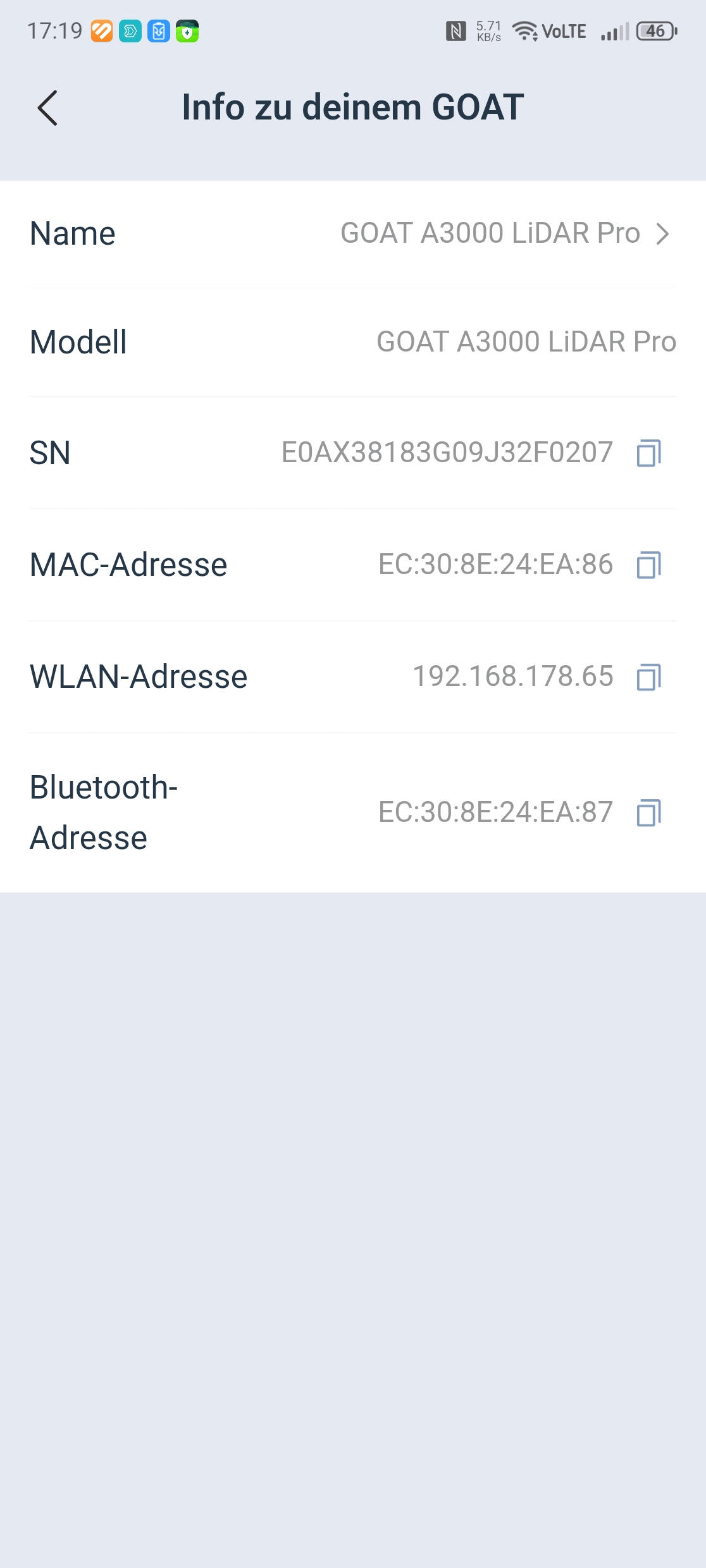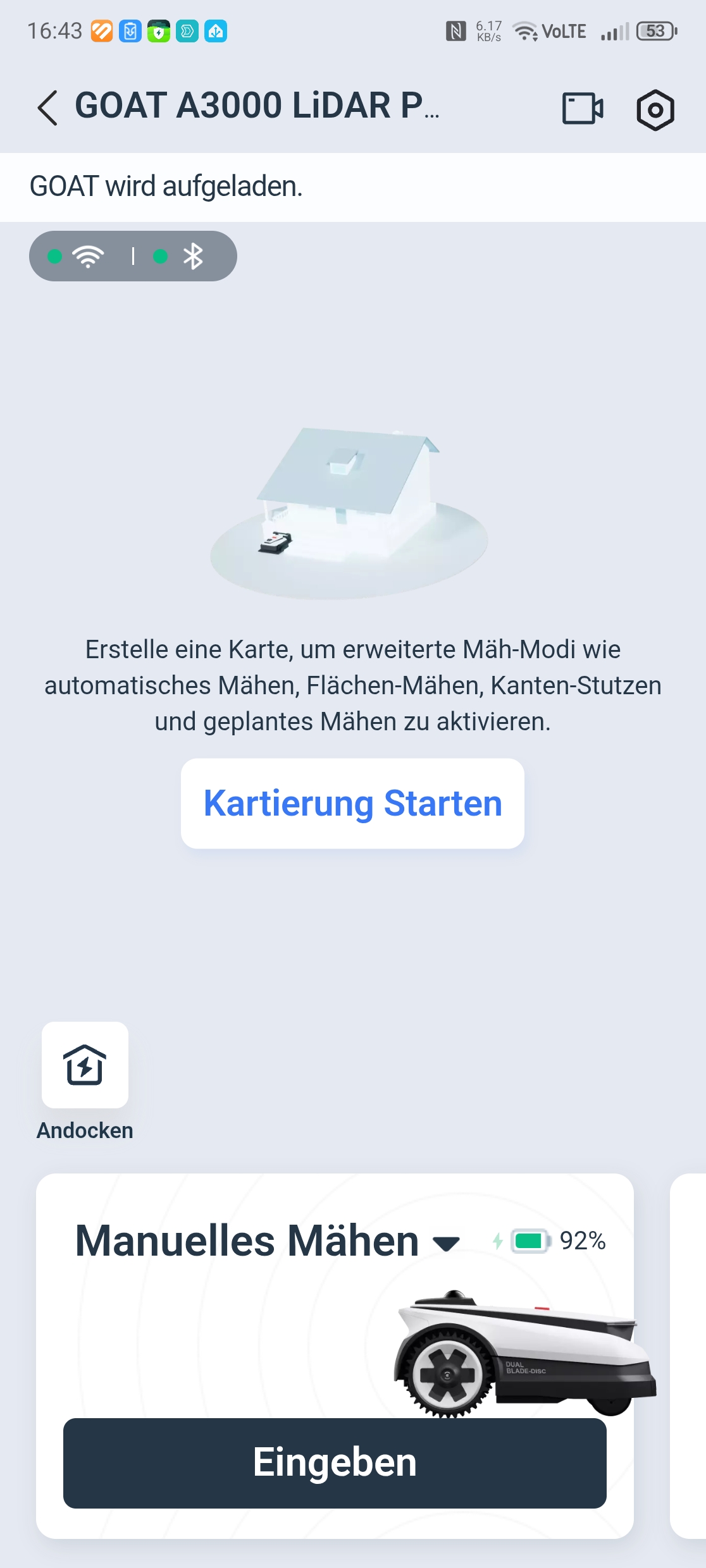 Smart-Home-Integration: Der Ecovacs Goat A3000 LiDAR Pro unterstützt Sprachsteuerung über Amazon Alexa und Google Assistant sowie Siri-Kurzbefehle für grundlegende Befehle wie Start, Stopp und Rückkehr zur Ladestation. Auch eine Einbindung in Smart Home by Hornbach ist möglich, bietet aber nur rudimentäre Funktionen wie Start und Stopp – selbst das Auslesen von Betriebsdaten wie dem Akkustatus fehlt. Die Community-basierte Home-Assistant-Integration unterstützt derzeit den Goat A3000 LiDAR aus dem Vorjahr, jedoch bislang nicht das aktuelle Pro-Modell. Zudem ist die Integration an die Hersteller-Cloud gekoppelt – ein rein lokaler Zugriff auf das Gerät ist nicht möglich. Eine native Anbindung an Apple Home besteht nicht.