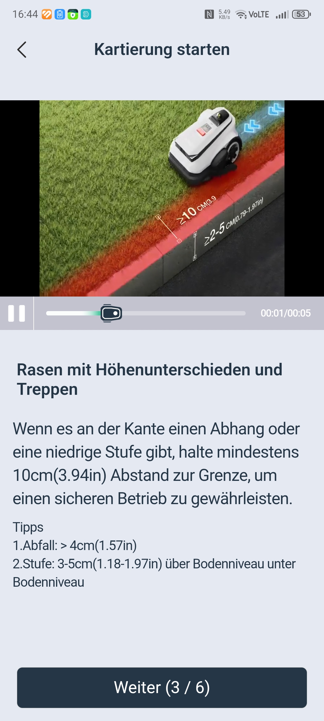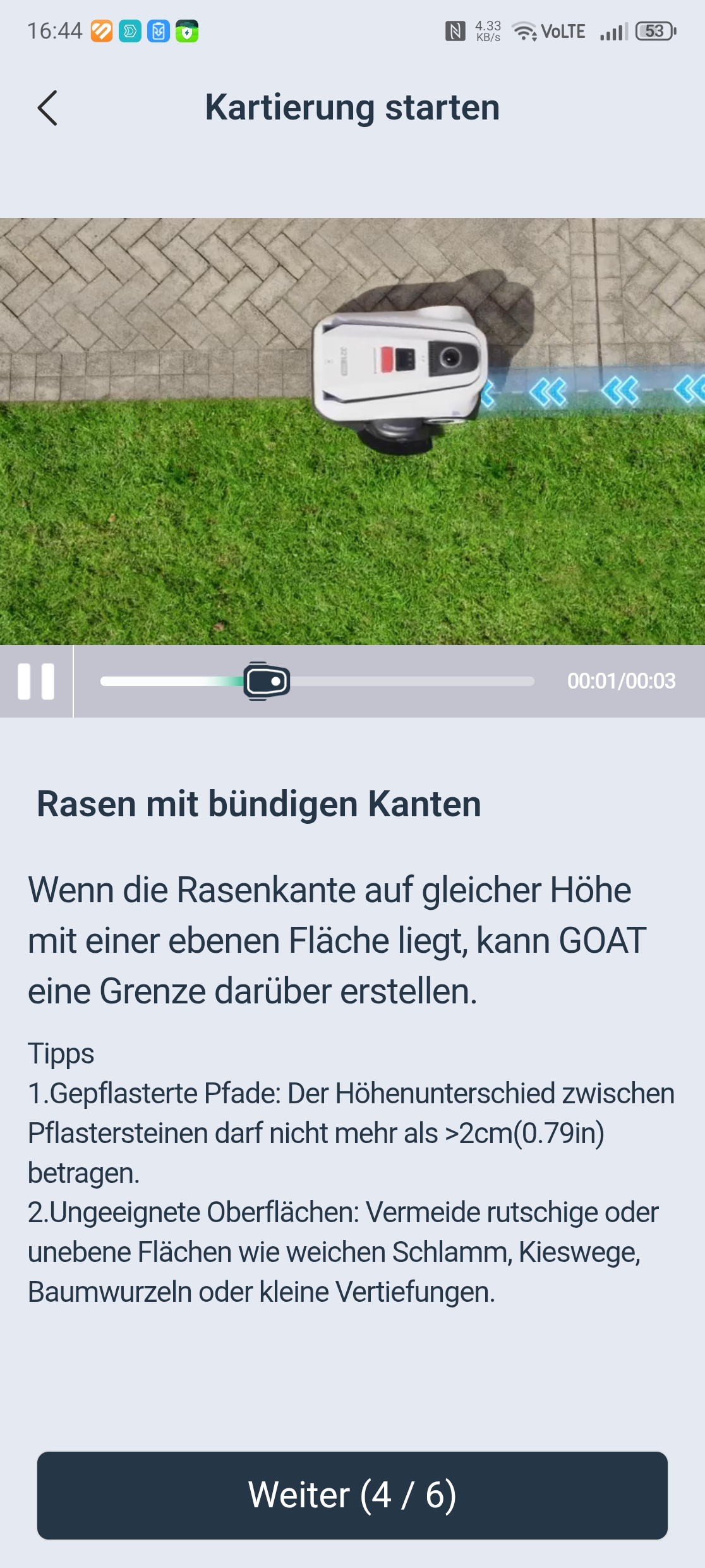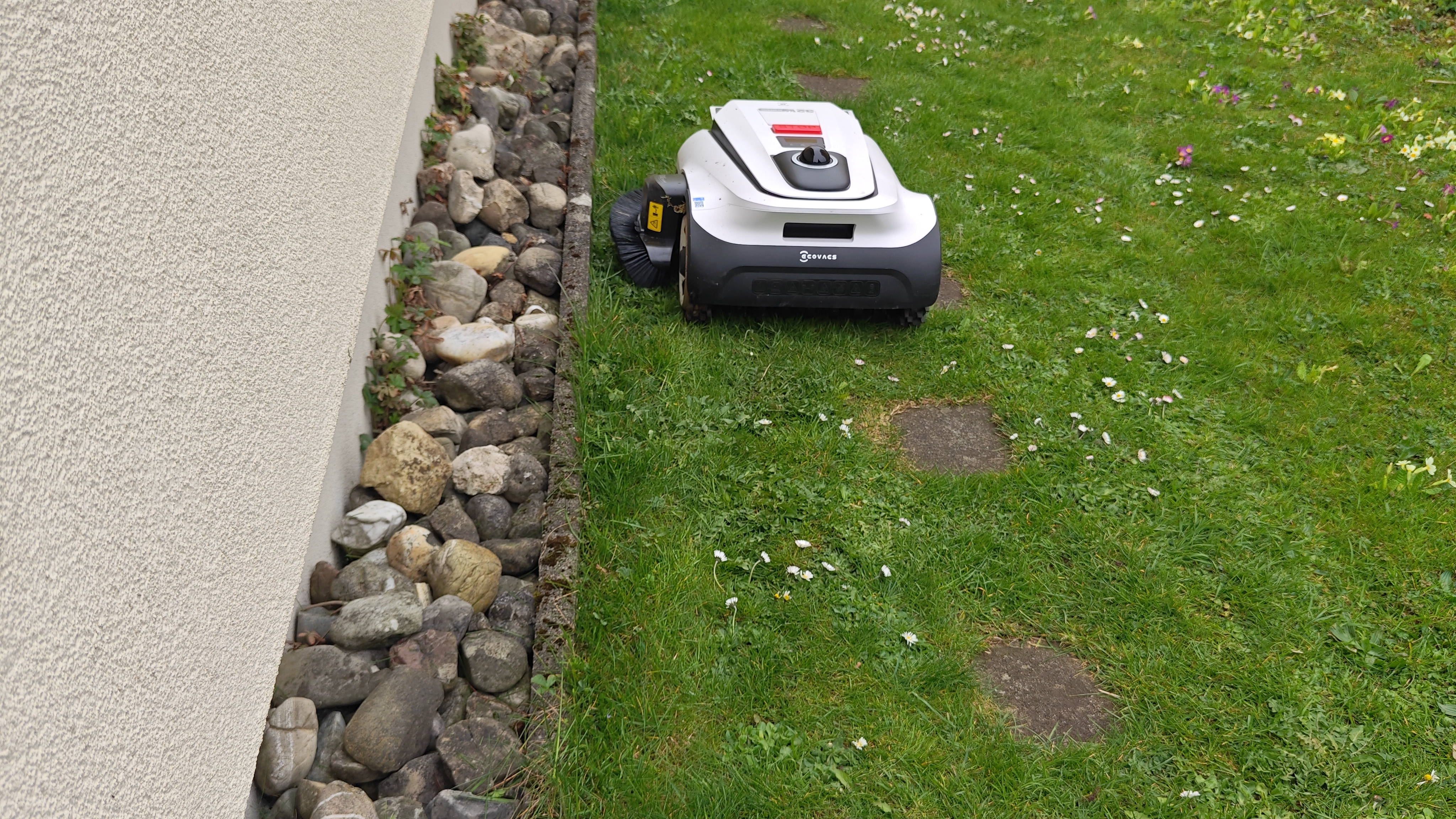 Die maximale Hindernishöhe liegt bei 4 cm, was für viele Gärten ausreichen dürfte. Die 4 bis 5 cm hohen Randsteine im Testgarten stellten jedoch eine unüberwindbare Hürde dar, sodass der Ecovacs Goat A3000 LiDAR Pro eine der drei Rasenzonen nicht erreichen konnte. Für normale Hanglagen bis etwa 45 Prozent Neigung und Gärten ohne hohe Bordsteinkanten ist das Gerät gut geeignet, bei extremeren Anforderungen stößt es an seine Grenzen.