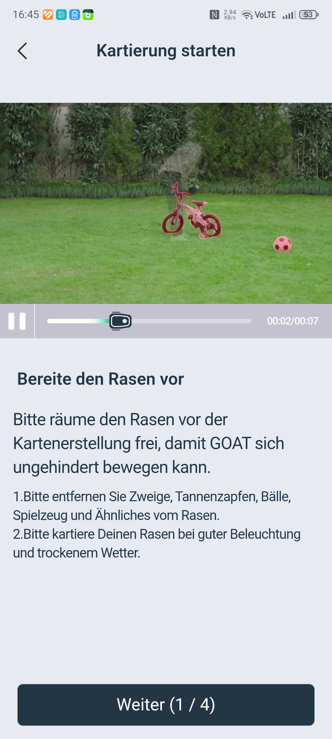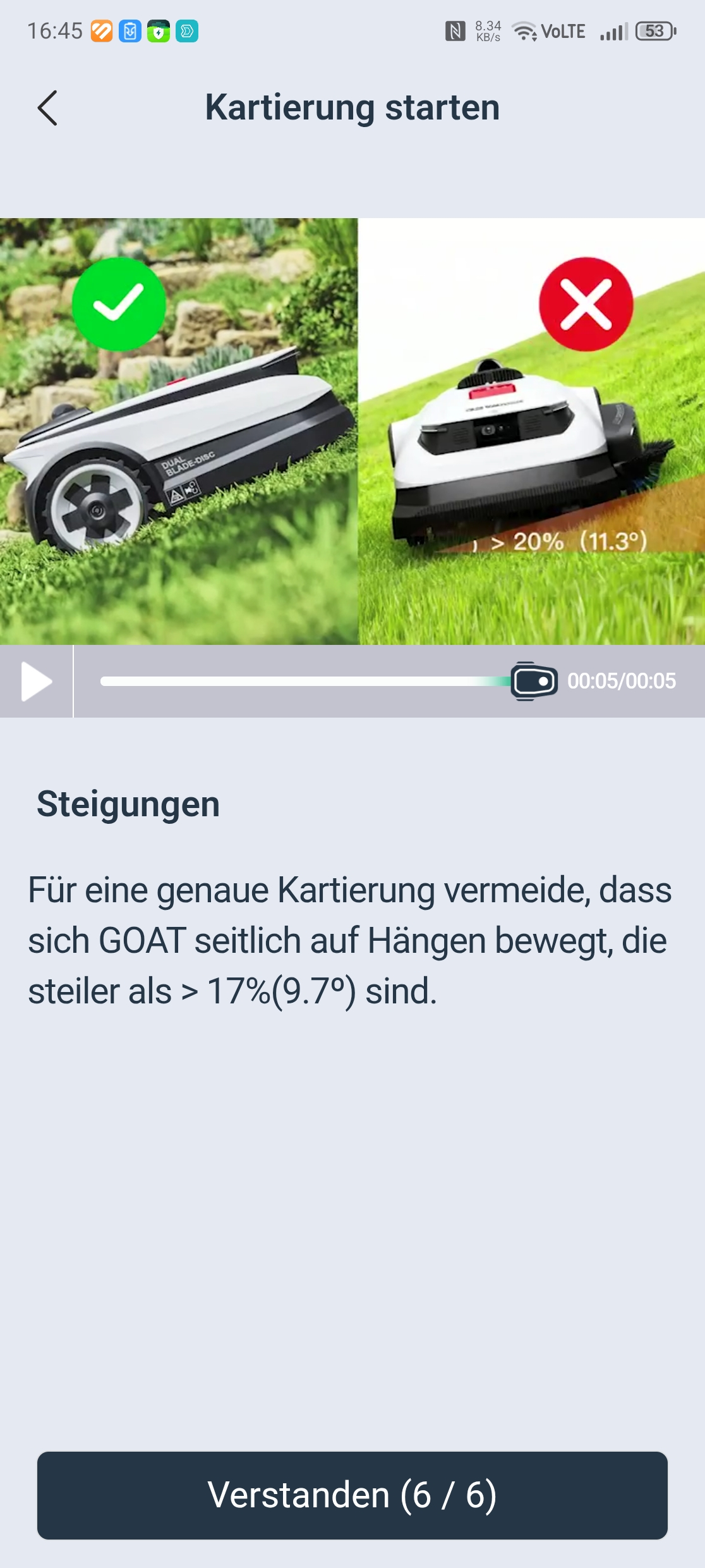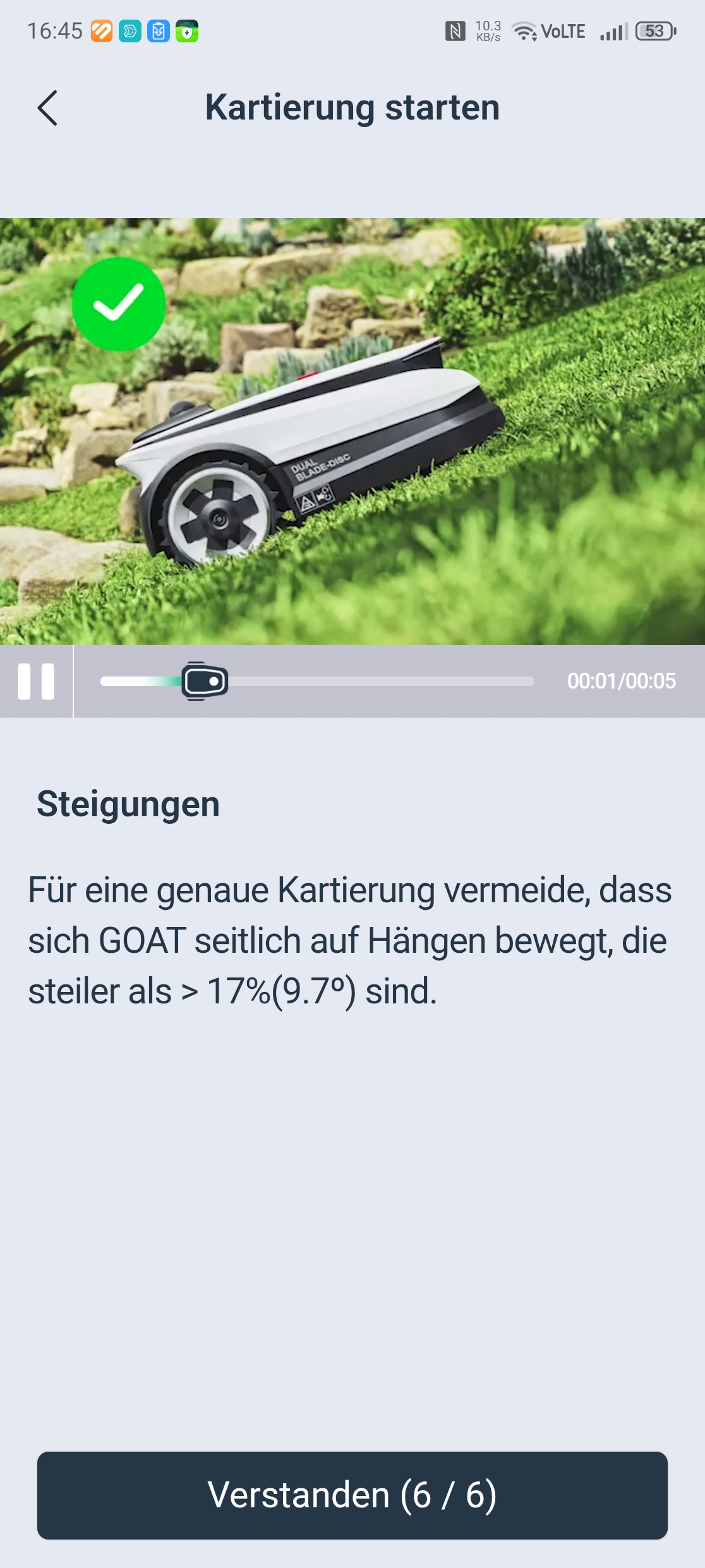 Die maximale Hindernishöhe liegt bei 4 cm, was für viele Gärten ausreichen dürfte. Die 4 bis 5 cm hohen Randsteine im Testgarten stellten jedoch eine unüberwindbare Hürde dar, sodass der Ecovacs Goat A3000 LiDAR Pro eine der drei Rasenzonen nicht erreichen konnte. Für normale Hanglagen bis etwa 45 Prozent Neigung und Gärten ohne hohe Bordsteinkanten ist das Gerät gut geeignet, bei extremeren Anforderungen stößt es an seine Grenzen.