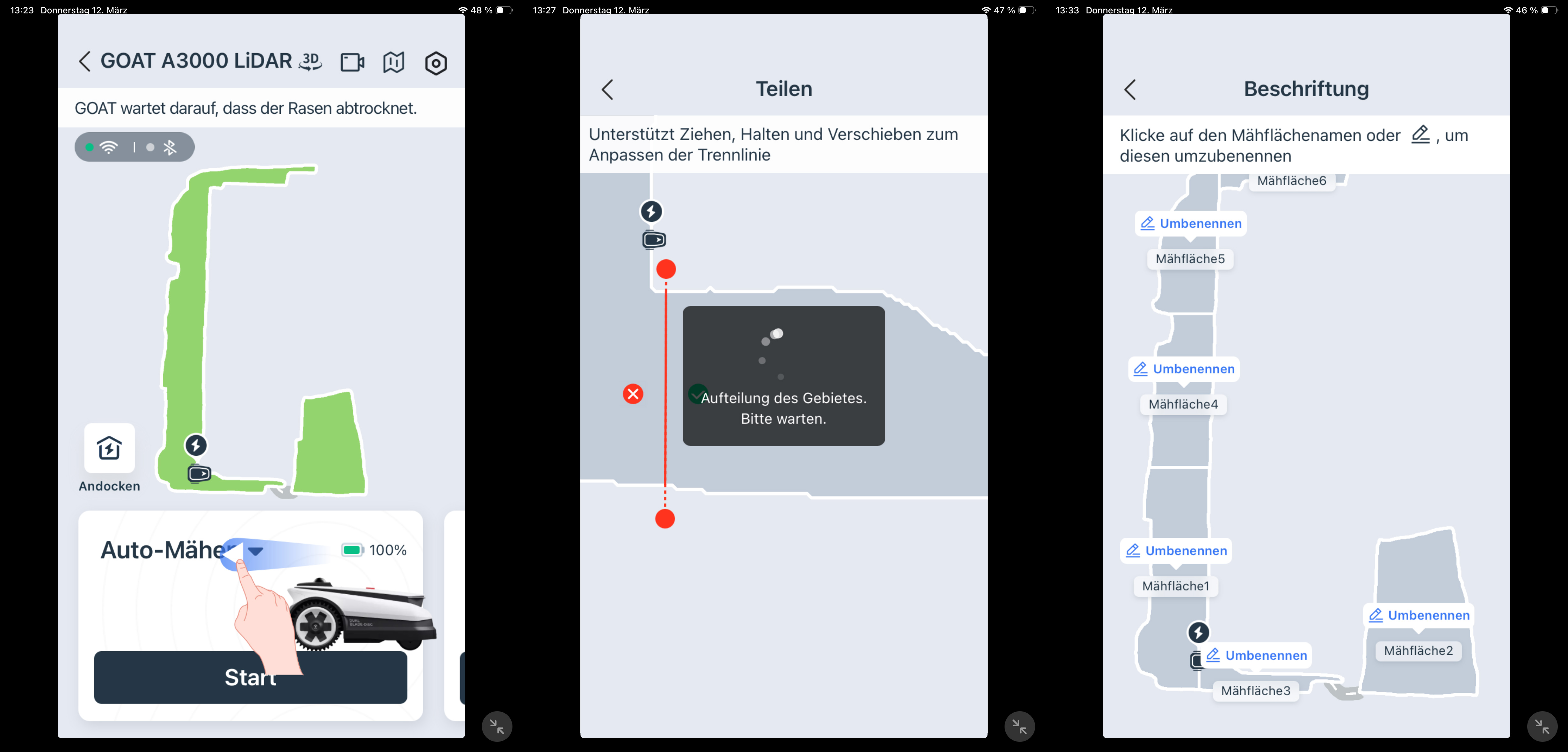 Die Ecovacs-App ist funktional und übersichtlich gestaltet. Sie bietet zonenbasierte Einstellungen für Mährichtung, Geschwindigkeit, Schnitthöhe und Hindernisvermeidungshöhe. Zeitpläne lassen sich ebenso konfigurieren wie Tierschutz-Zeiten und eine Regenverzögerung von 3 bis 5 Stunden. Die Kartenbearbeitung erlaubt das Teilen und Zusammenführen von Zonen, das Anlegen von Sperrflächen und Verbindungspfaden sowie die gezielte Auswahl der Kanten für den Trimmereinsatz. Darüber hinaus stehen eine manuelle Steuerung und ein Livestream der integrierten Kamera zur Verfügung. Die App ist allerdings nicht für Tablets wie das iPad optimiert – die Darstellung lässt sich lediglich größer zoomen.