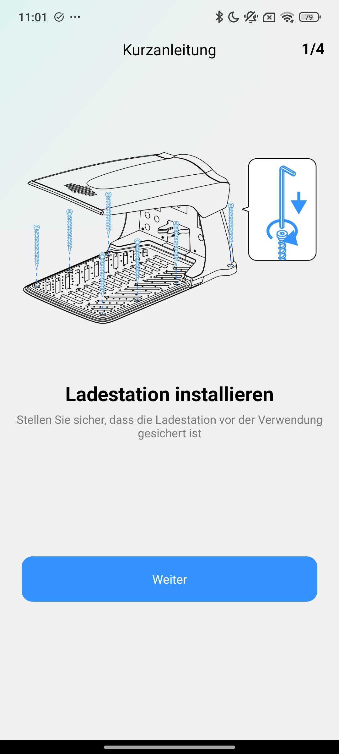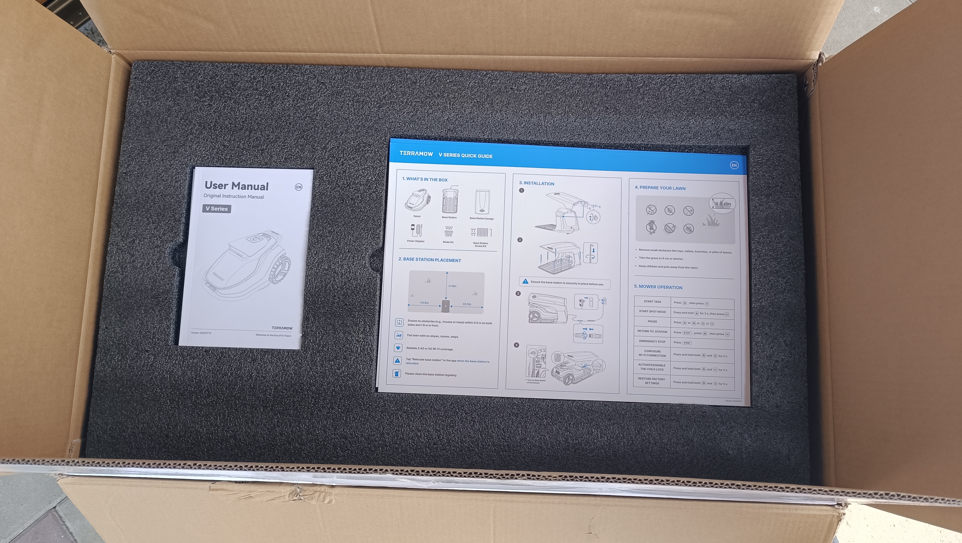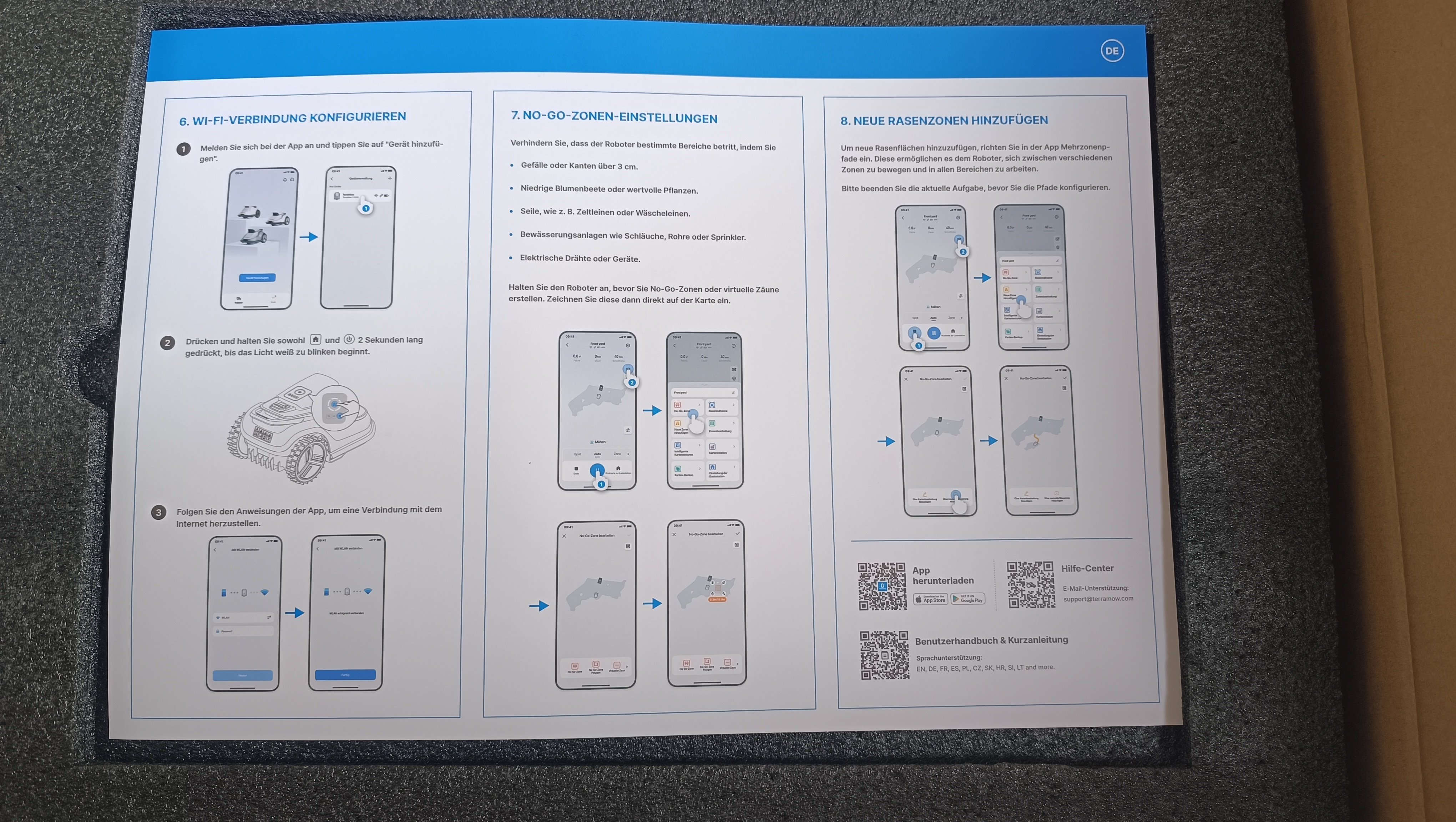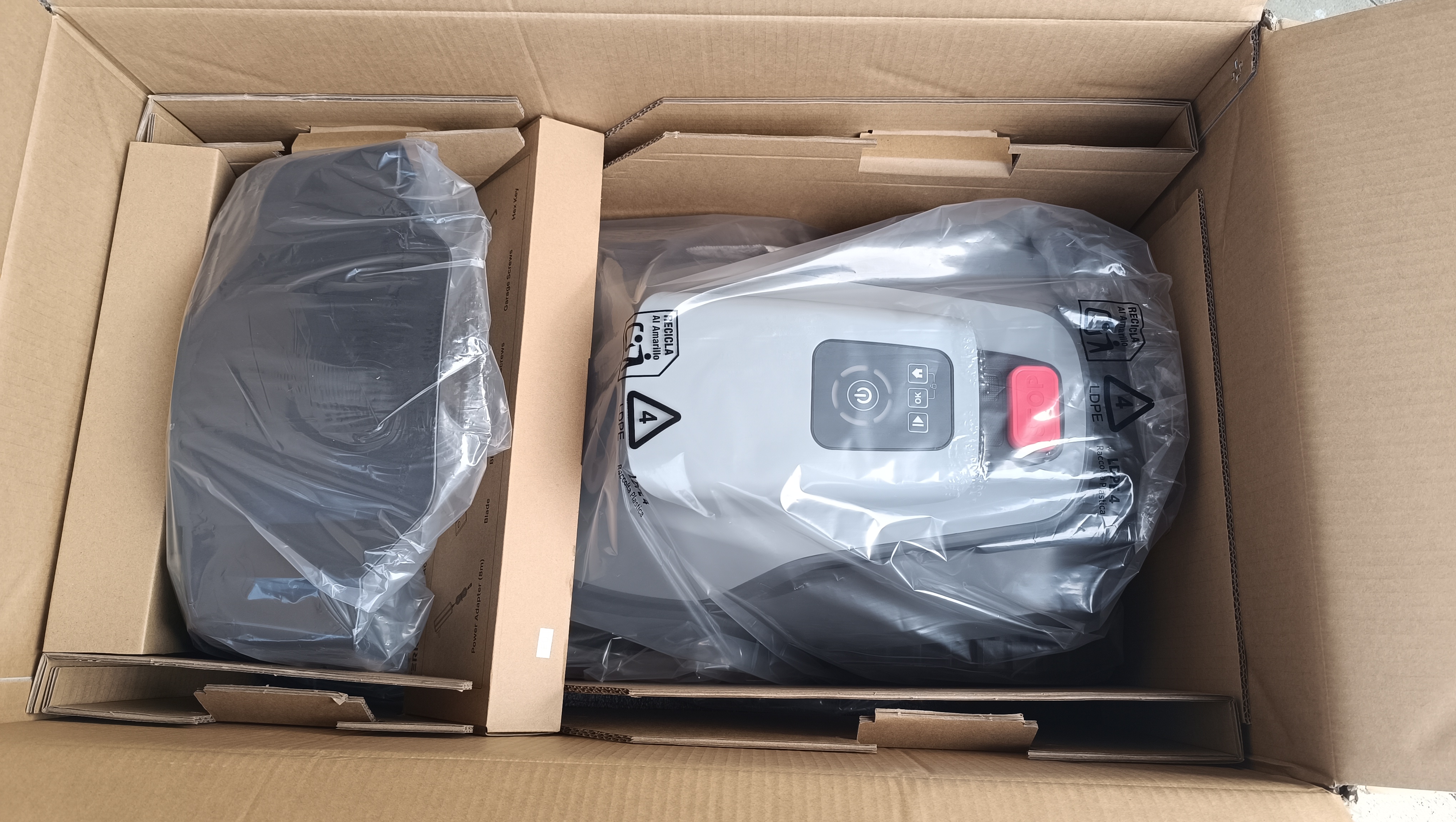 Neben dem Mähroboter selbst umfasst der Lieferumfang das Netzteil und die Ladestation. Diese ist zweigeteilt, wobei die Überdachung mit den beigelegten Werkzeugen und Schrauben manuell befestigt werden muss. Außerdem liegen Plastikschrauben für die Verankerung im Boden bei. Der Aufbauprozess ist dank zusätzlich beigelegter Anleitungen klar verständlich.