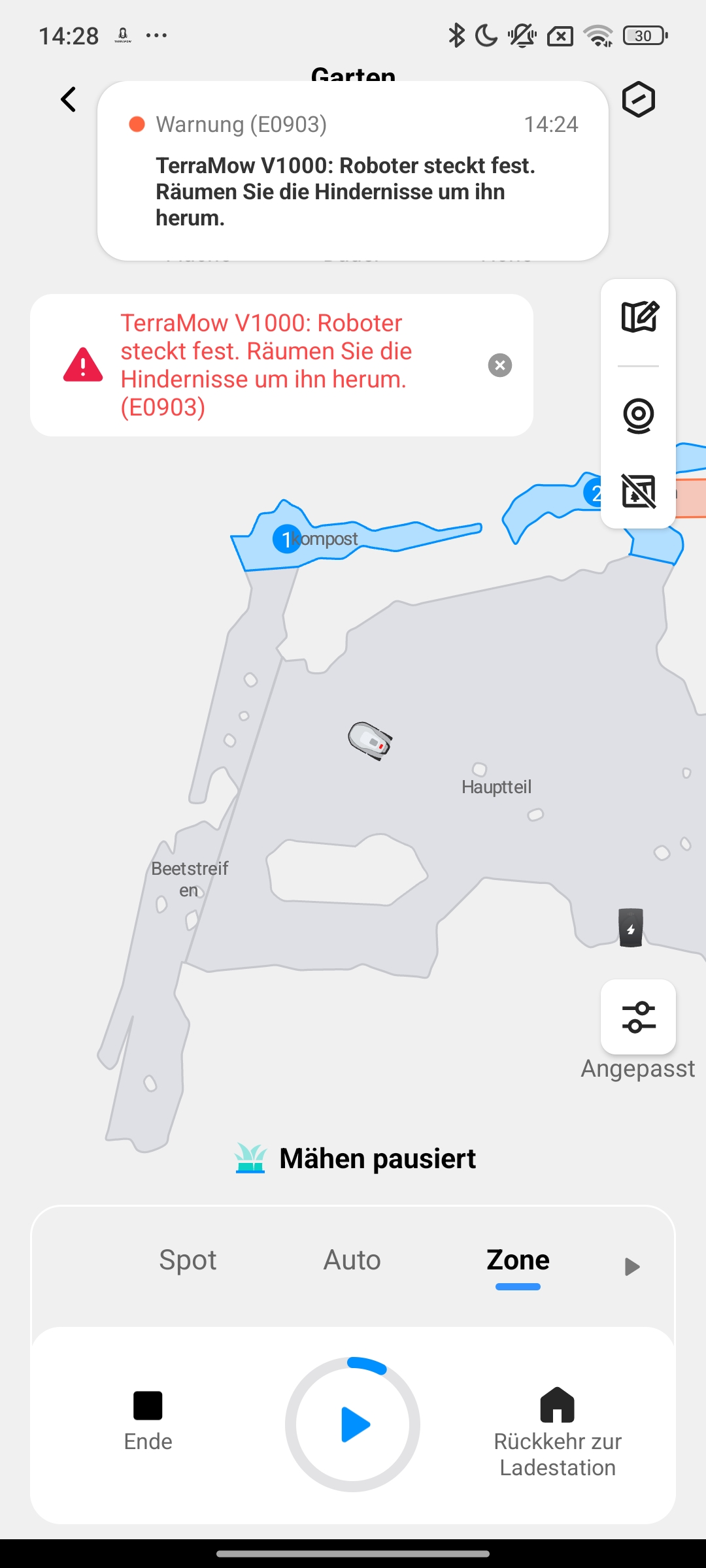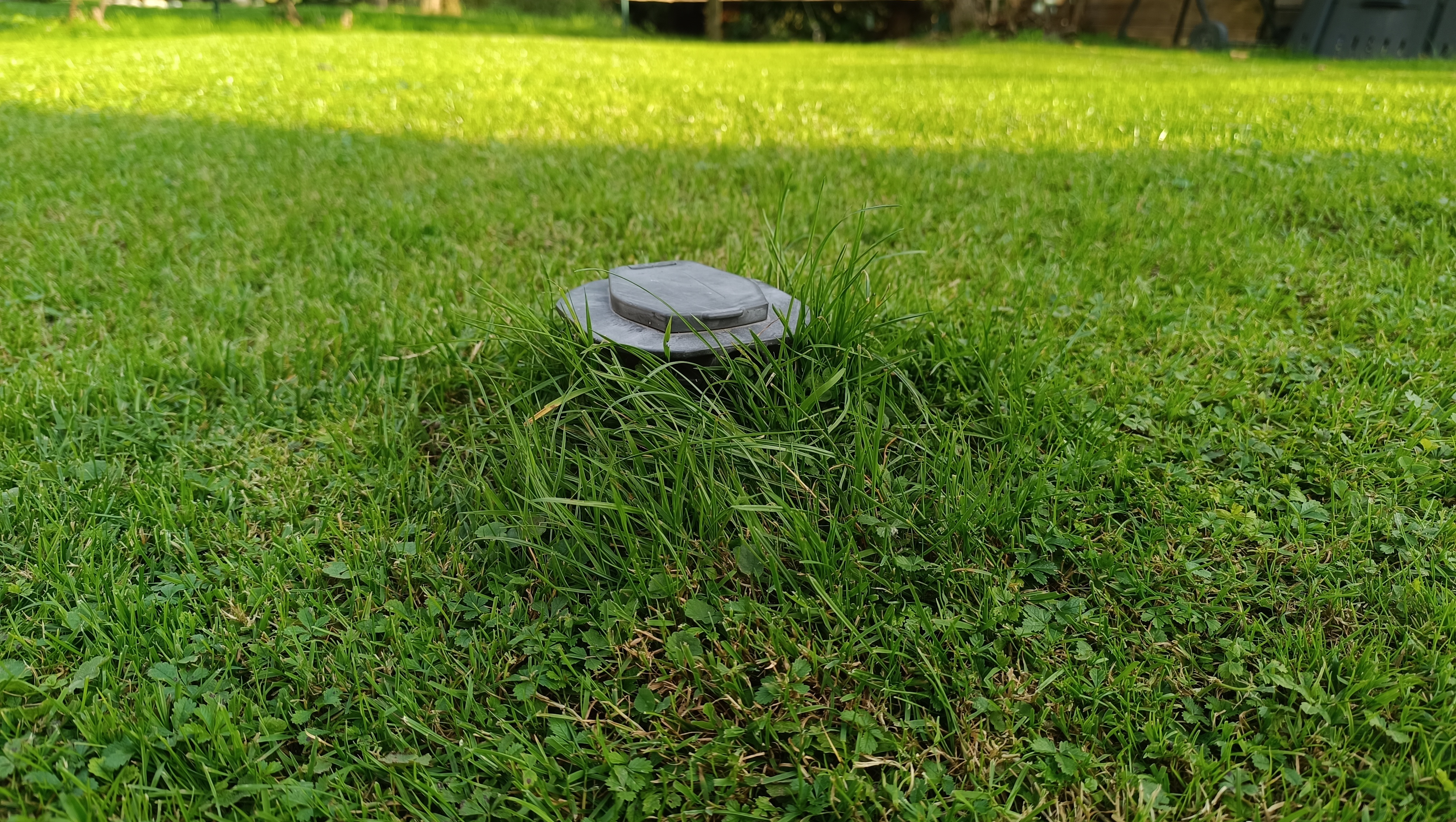 Die Hindernis-Erkennung des V1000 funktionierte in unserem Test tadellos, nur bei Engstellen und herabhängenden Blättern etwas zu vorsichtig. Im Garten gibt es zwei Halter für Schirme oder Wäschespinnen, die der Mäher souverän umfährt. Allgemein waren wir sehr zufrieden mit der Selbsteinschätzung des Mähers. Auch in engen Bereichen gelingt es diesem meist gut zu wenden oder er fährt auch mal einige Meter blind rückwärts – dabei verfährt er sich nur in Ausnahmefällen. In unserem Garten gibt es zum Rand einige Hügel, von denen sich der Terramow V1000 leider ziemlich weit weg hält – auch mit den bereits erwähnten Einstellungen zur Hindernis-Erkennung gibt es hier kaum Besserung. Lediglich an einer Stellte ist der Terramow-Mäher gleich zweimal gescheitert. Dort war ein starker Abfall der Rasenhöhe in einer Engstelle, dies konnten wir mithilfe einer No-Go-Zone lösen. Die Engstelle zwischen einem Beet und Holzstapel ist nur wenige Zentimeter breiter als der Mähroboter selbst und wurde in etwa 30 % der Mähvorgänge bezwungen.