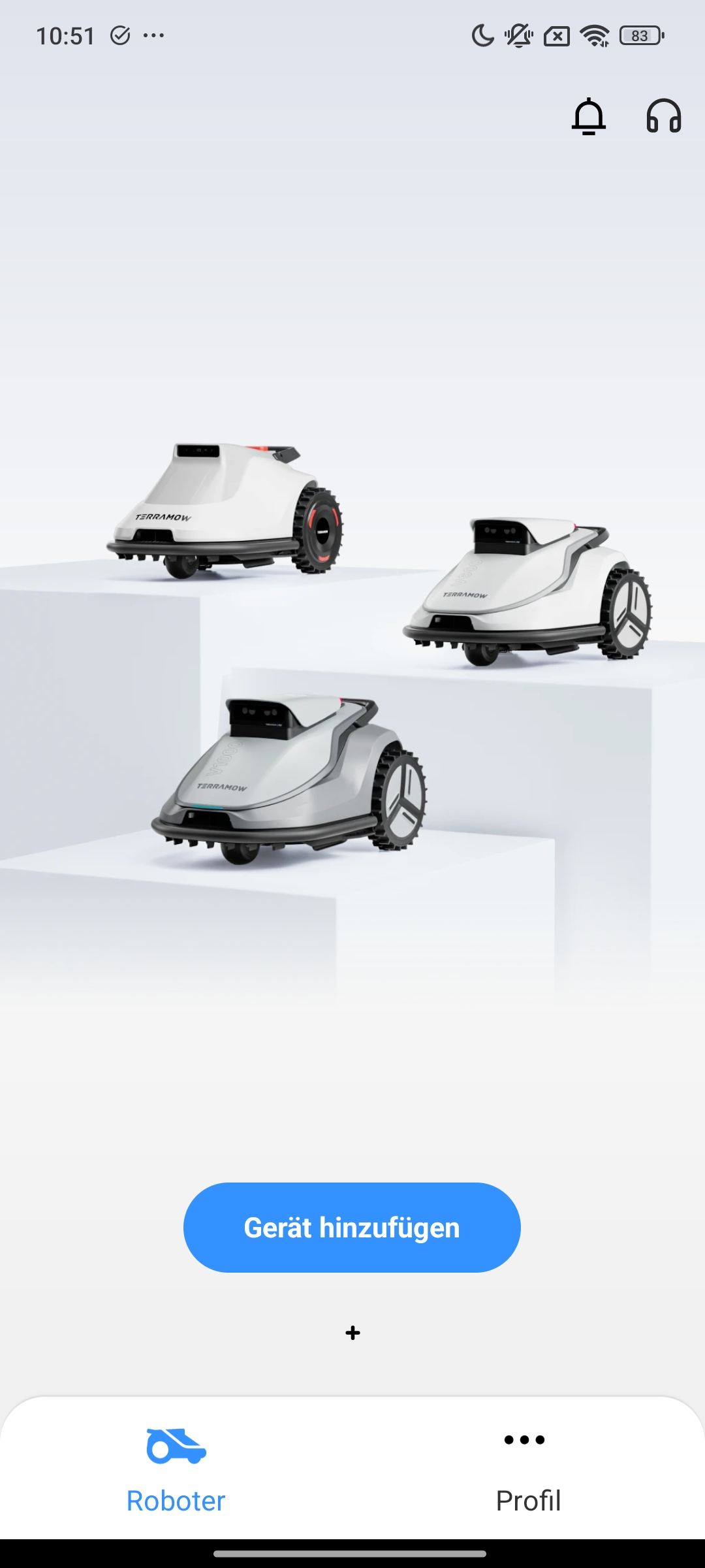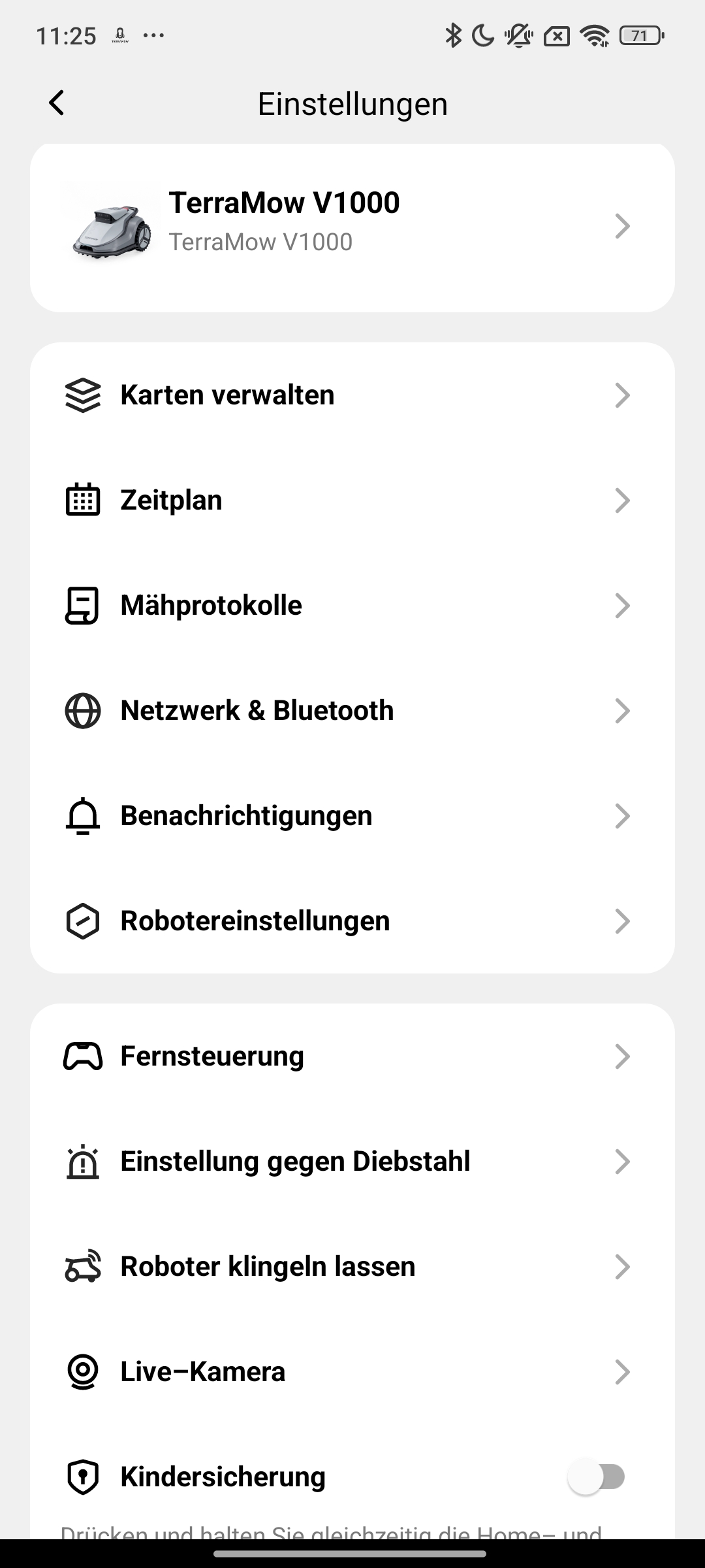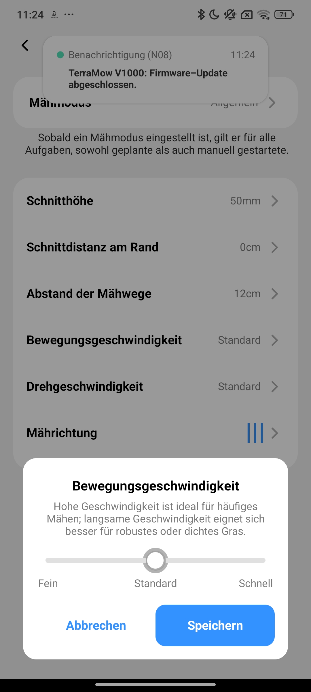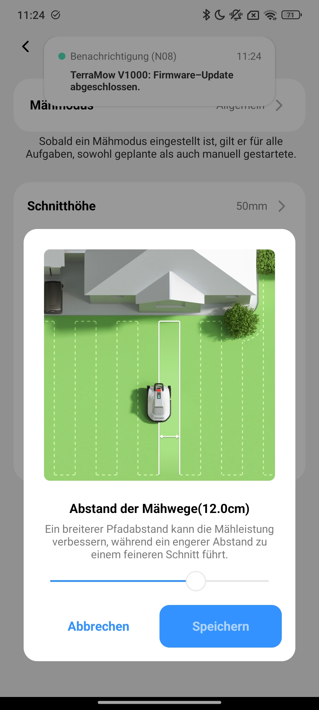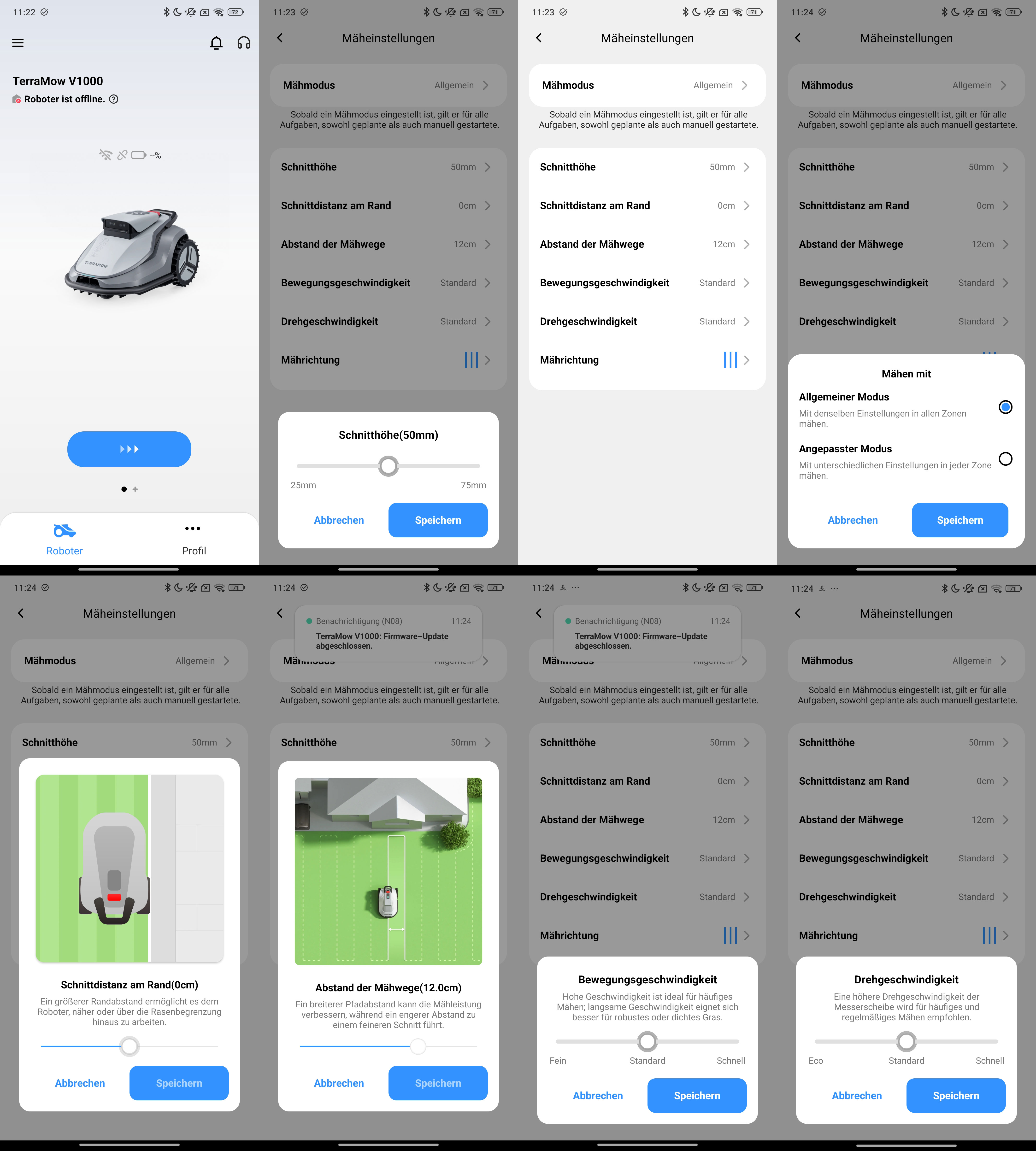 Der Terramow V1000 wird über die herstellereigene App „Terramow“ gesteuert. Dort ist zunächst die Registrierung eines Accounts notwendig, bevor die App schrittweise durch die Einrichtung des gewählten Geräts führt. Bei der Ersteinrichtung stand bereits eine neue Firmware zur Verfügung, die in etwa 20 Minuten installiert war.
