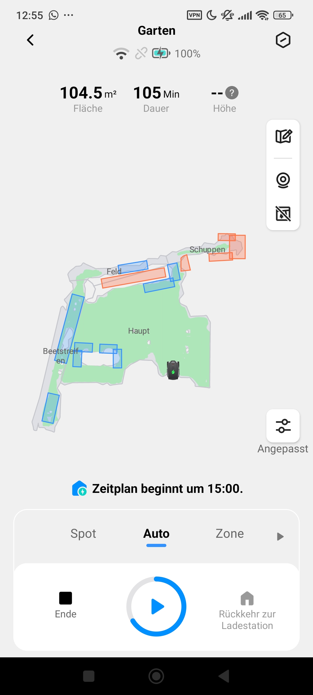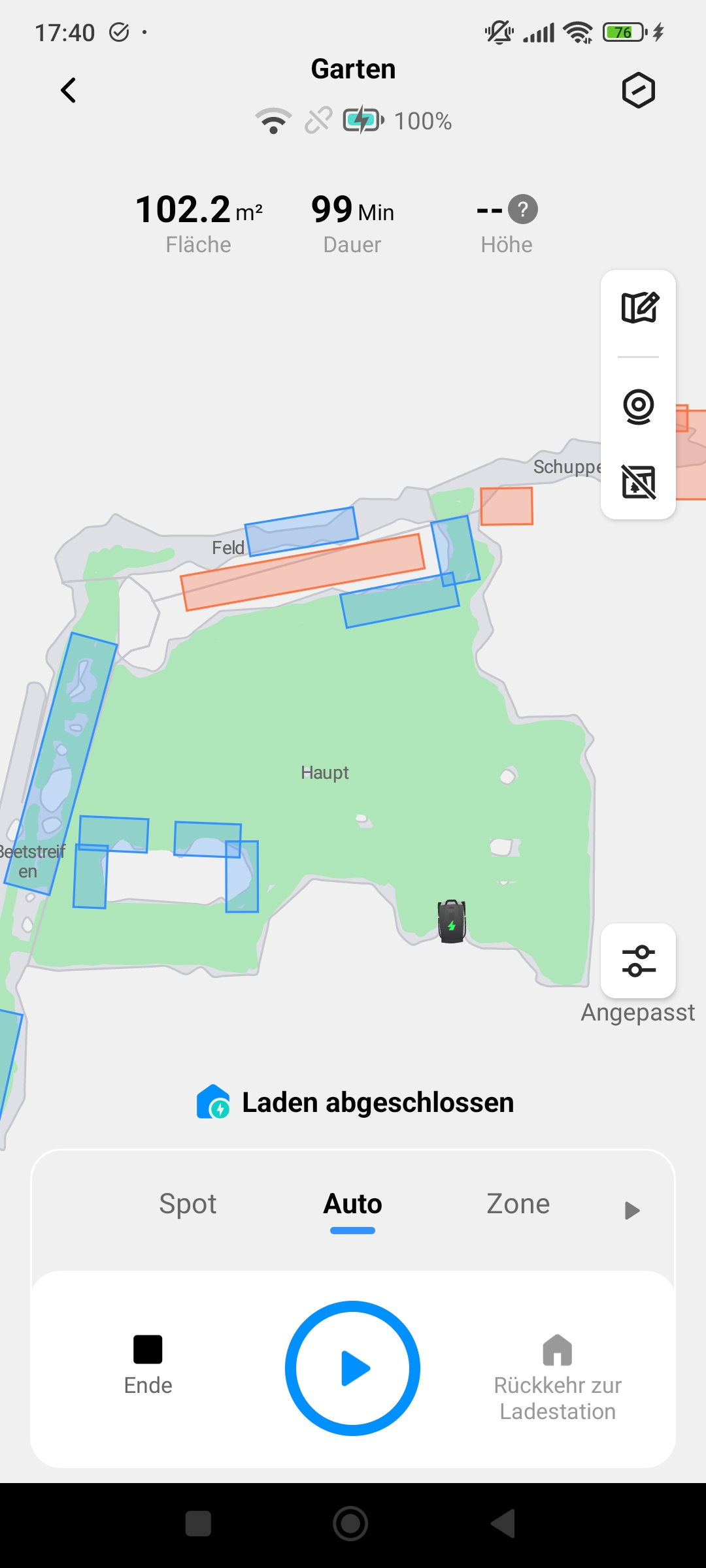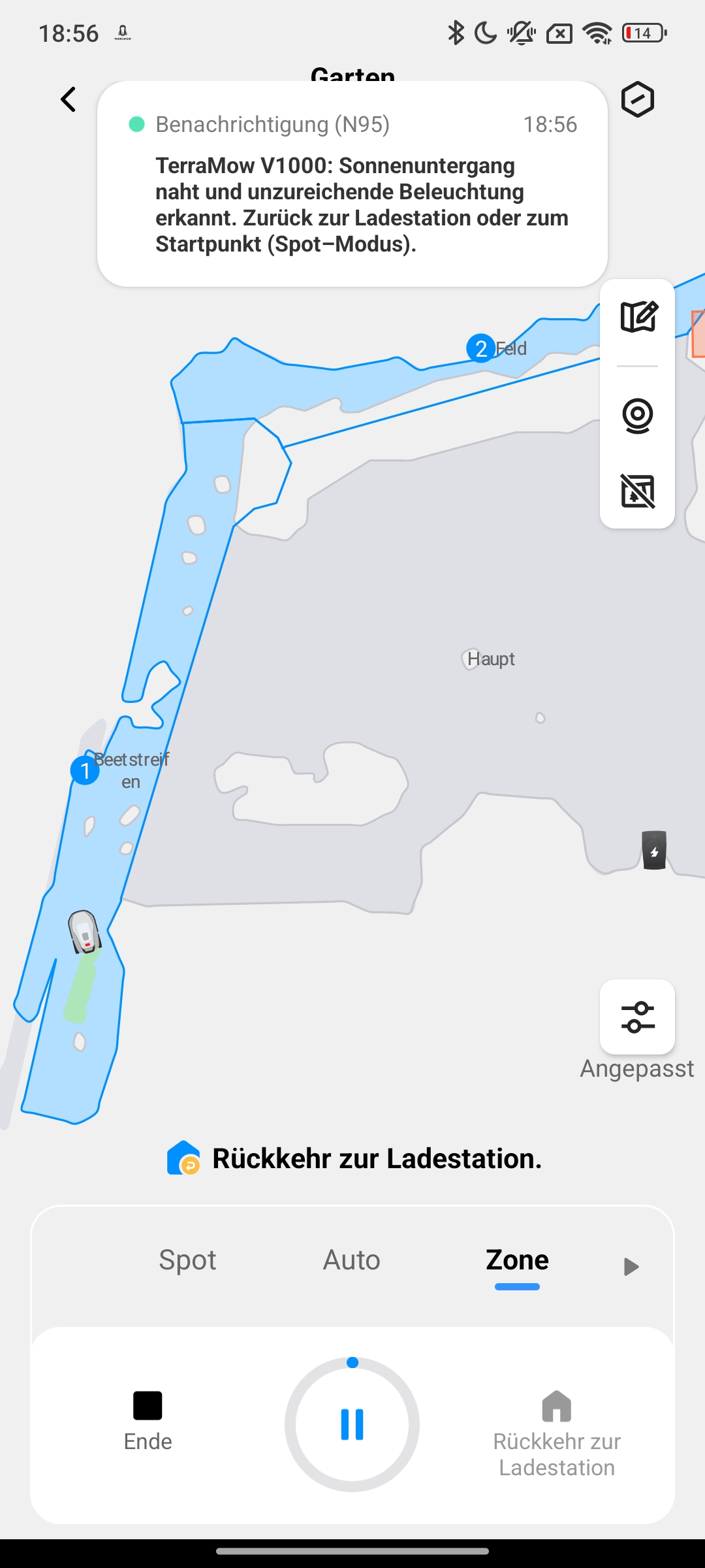 Im „Spot“-Modus können auch einmalig Rasenflächen gemäht werden, die nicht zur aktuellen Karte gehören. Beispielsweise kann man so auch problemlos den Rasen des Nachbarn mähen, sollte dieser im Urlaub sein.