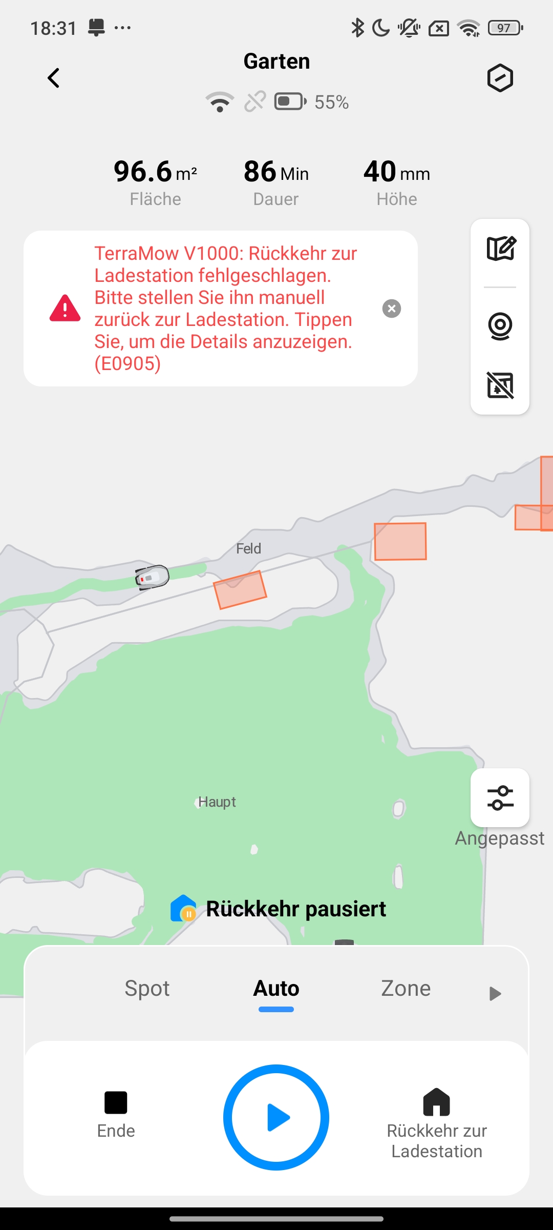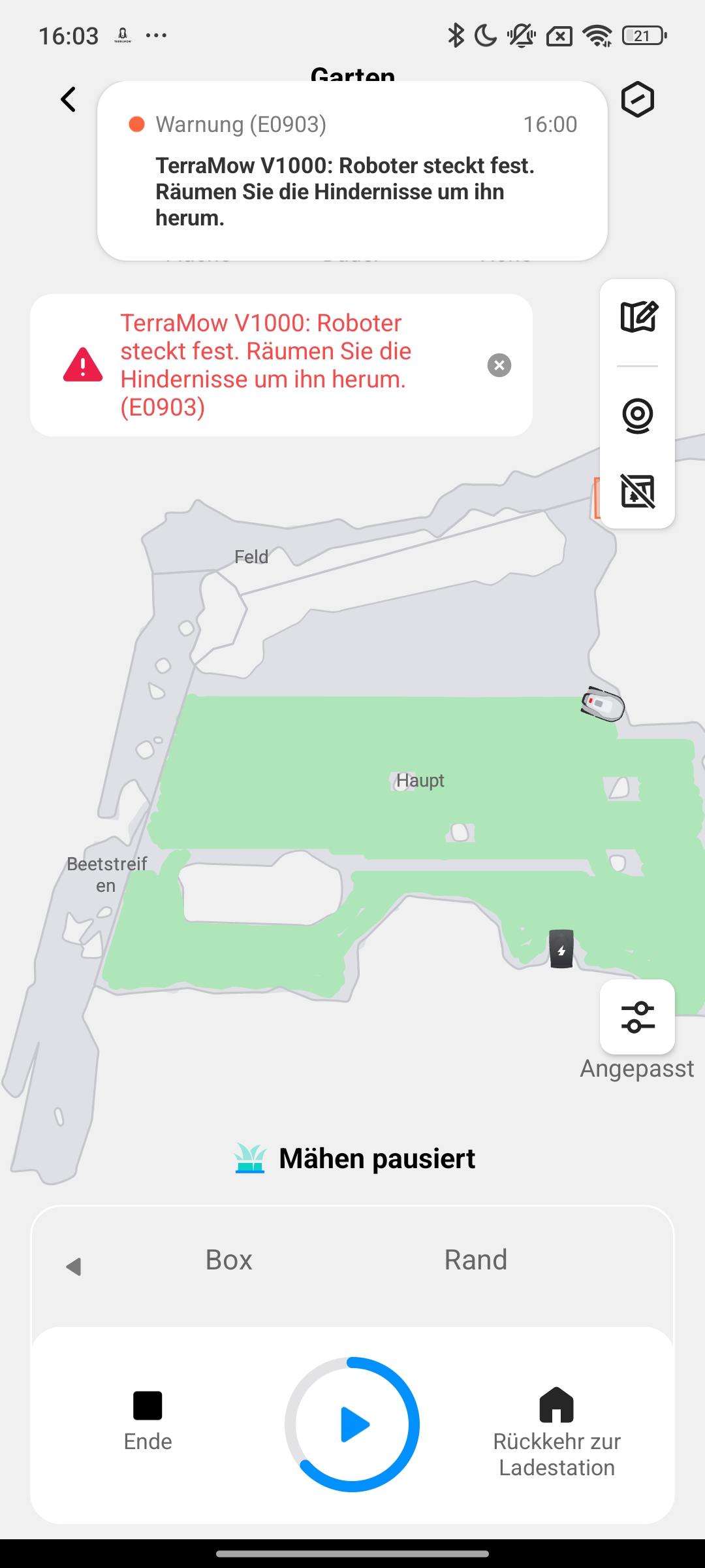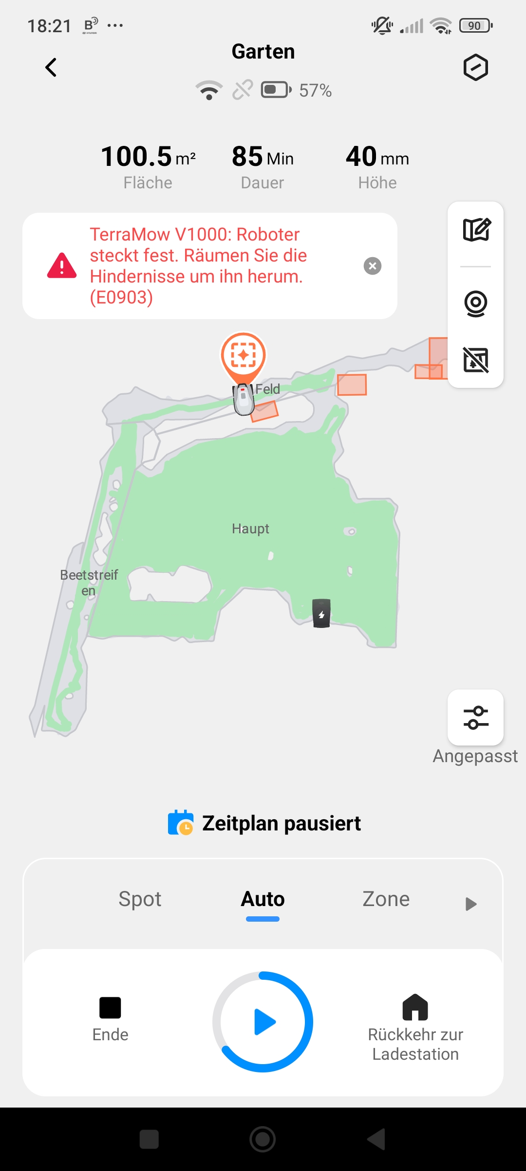 Der Terramow V1000 macht seinen Job enorm gut. Gerade große Flächen mäht er hervorragend und erkennt Hindernisse zuverlässig. Im Dunkeln kann er zwar nicht verwendet werden, durch Schatten wird die Navigation am Tag jedoch nicht beeinflusst. Damit ist er deutlich flexibler einsetzbar als RTK-Mäher, die etwa 20 Satelliten für eine gute Navigation benötigen. Eine Schwäche des Mähroboters sind jedoch Büsche und Blätter, die immer als Hindernisse erkannt und deshalb vollständig umfahren werden. Auch an Engstellen kann der V1000 mit der Konkurrenz mithalten und findet selbstständig wieder aus diesen heraus. Nur bei offenen Gärten ist bei der Kartierung eine Aufsicht und nachträglich die Abgrenzung mittels No-Go-Zonen erforderlich. Dank 4G-SIM kann der Mähroboter auch in großen Gärten mit schlechter WLAN-Adeckung problemlos eingesetzt werden.