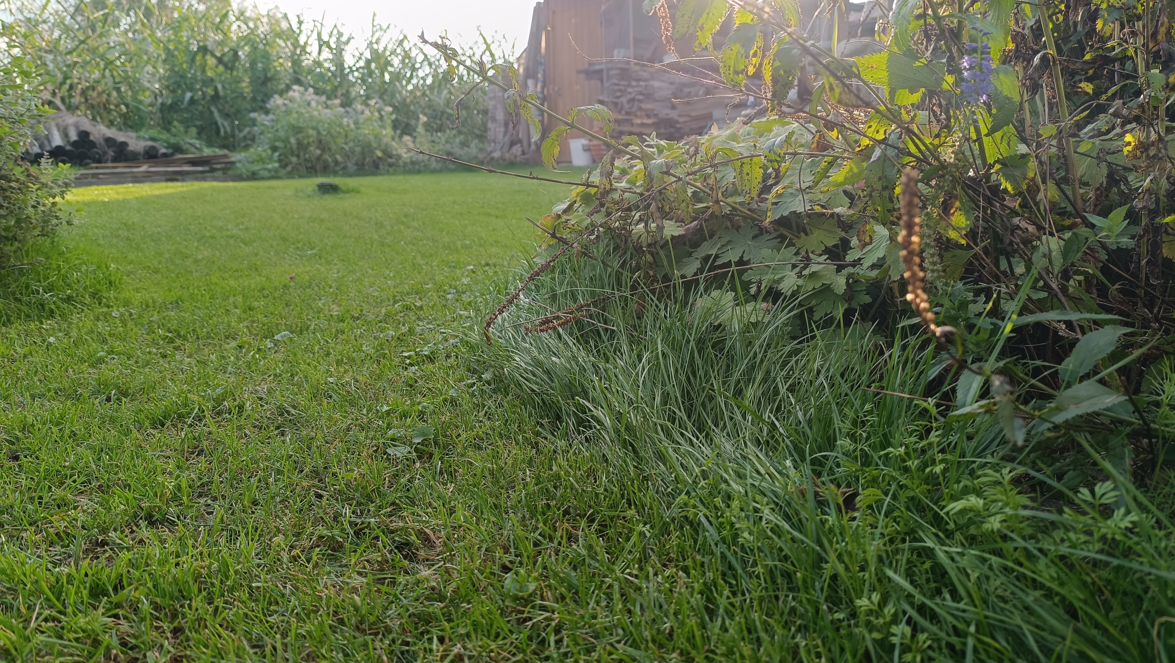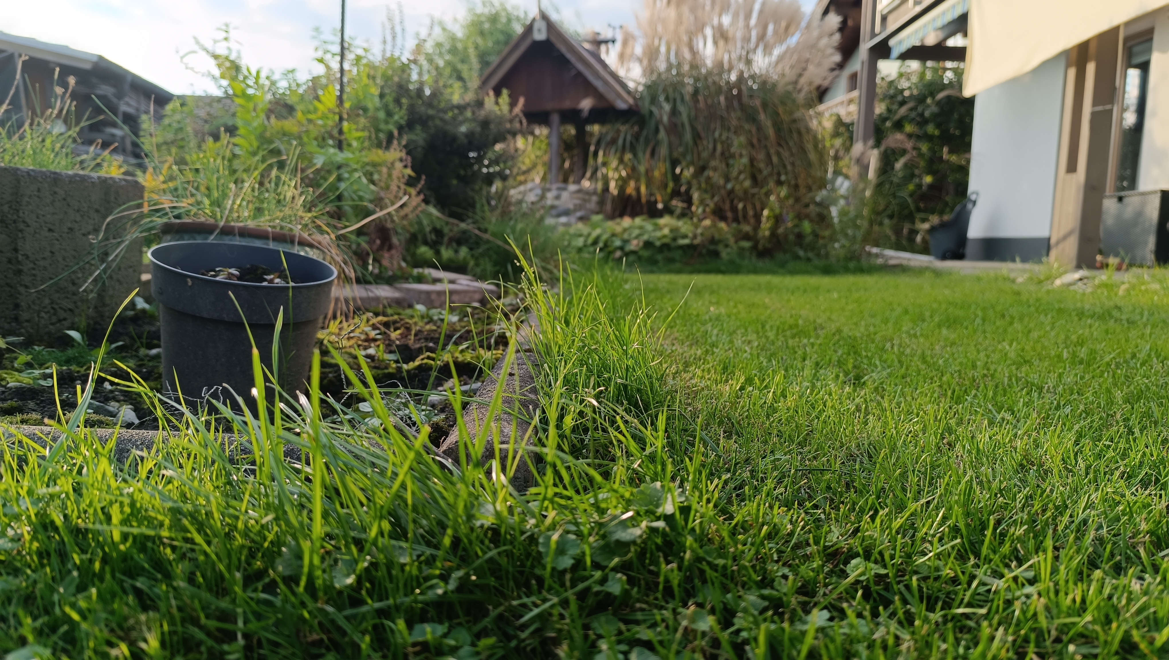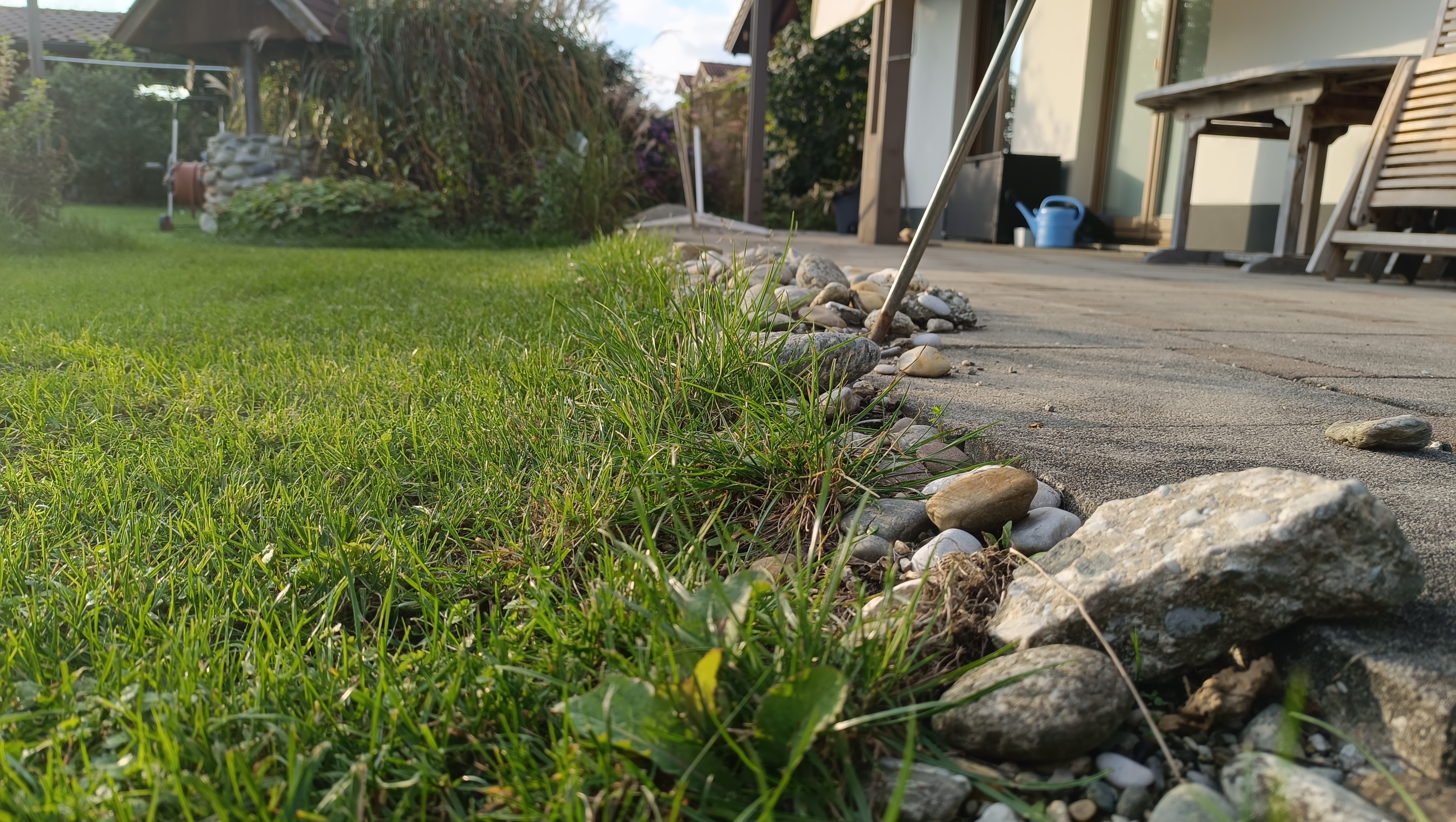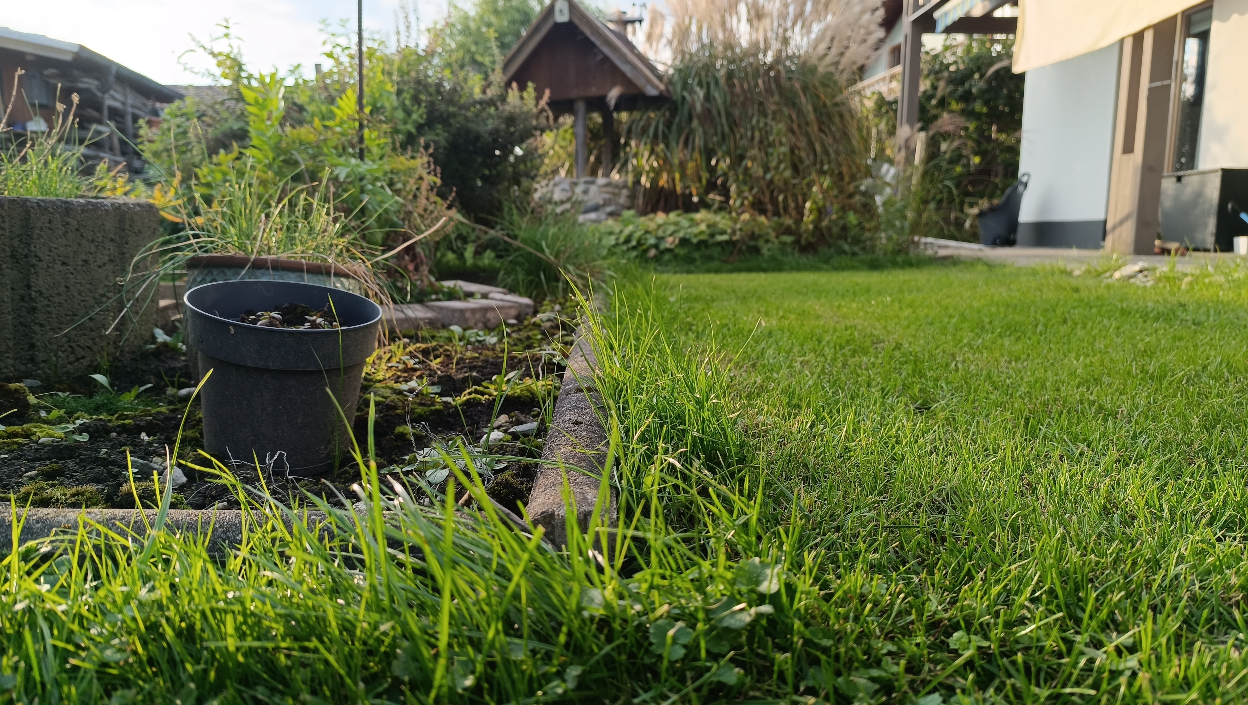Ohne Hindernisse im Weg mäht der Terramow V1000 auch souverän bis zur Rasenkante, sodass bauartbedingt nur etwa 9 cm Rasen am Rand stehen bleiben. Der Mähroboter lässt dabei kaum Freiraum zwischen Gehäuse und Randbegrenzung. Sofern sinnvoll, kann der Abstand zur Rasen-Begrenzung weiter verringert – oder auch vergrößert – werden, indem man den Abstand zur Rasenfläche entsprechend anpasst. Diese Einstellung ist ebenfalls Zonen-spezifisch.