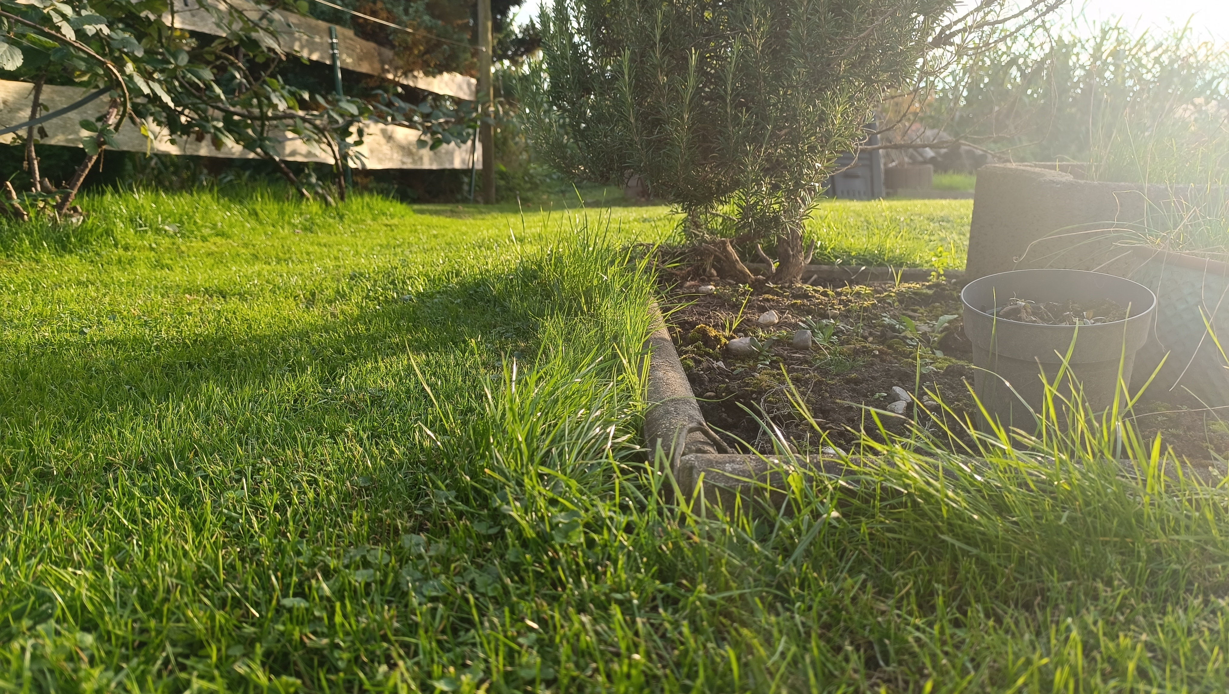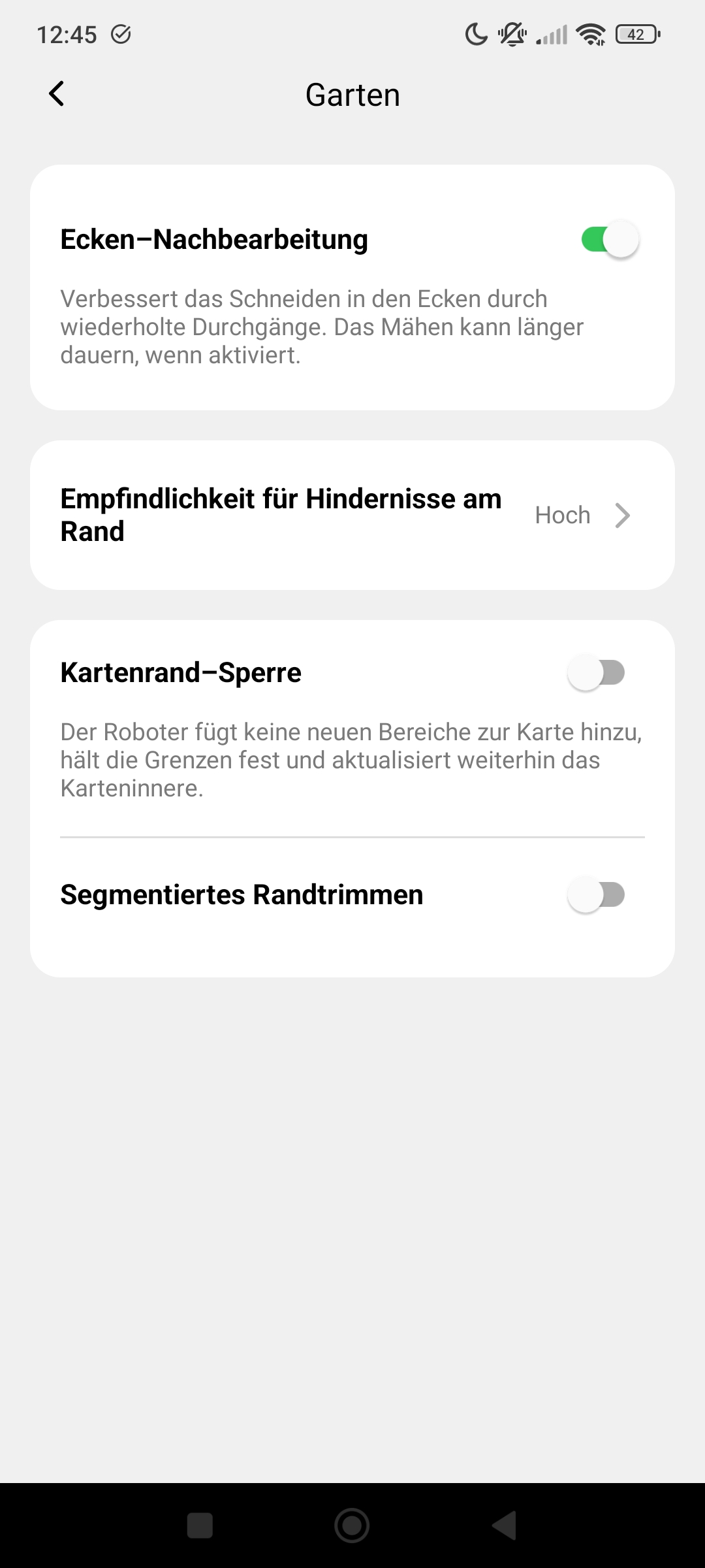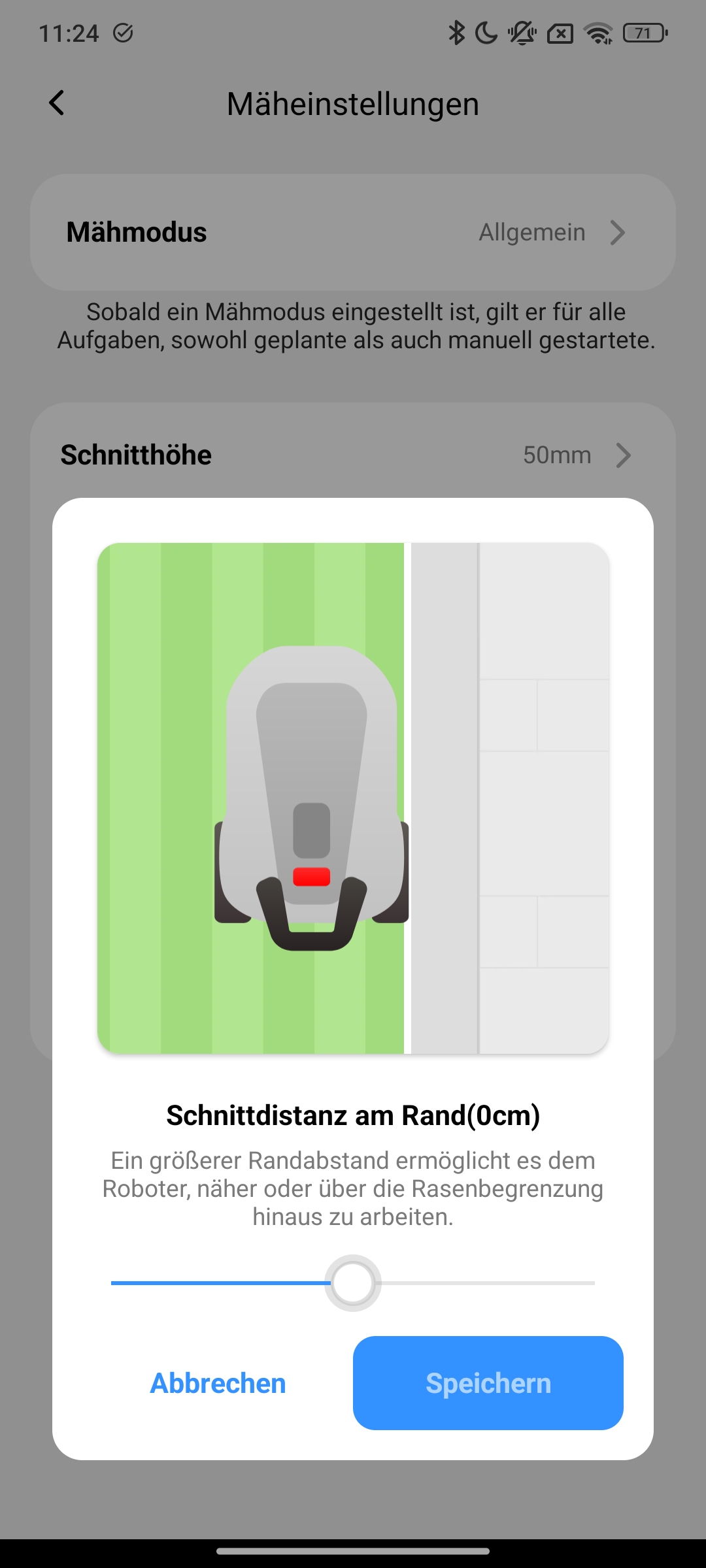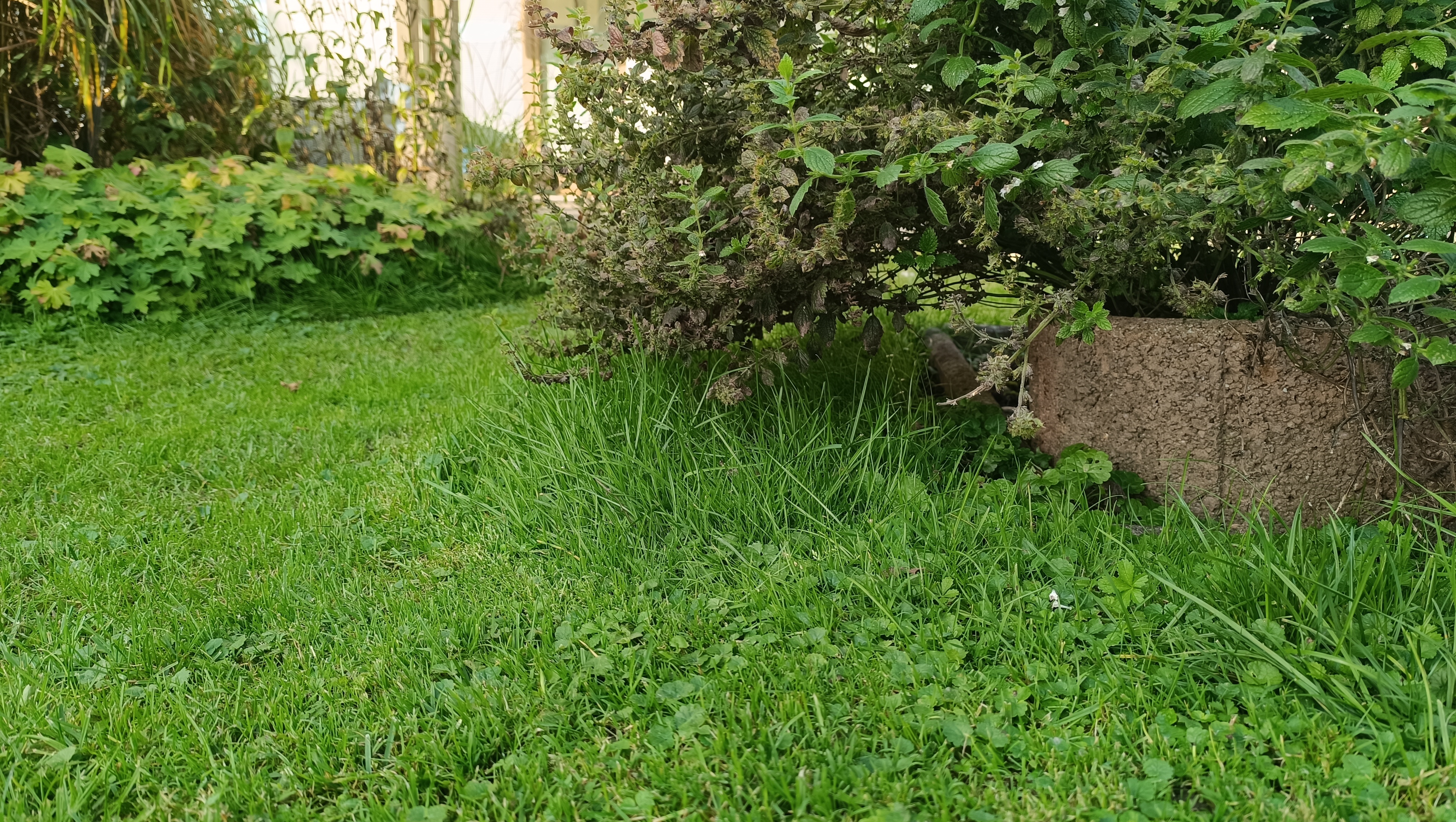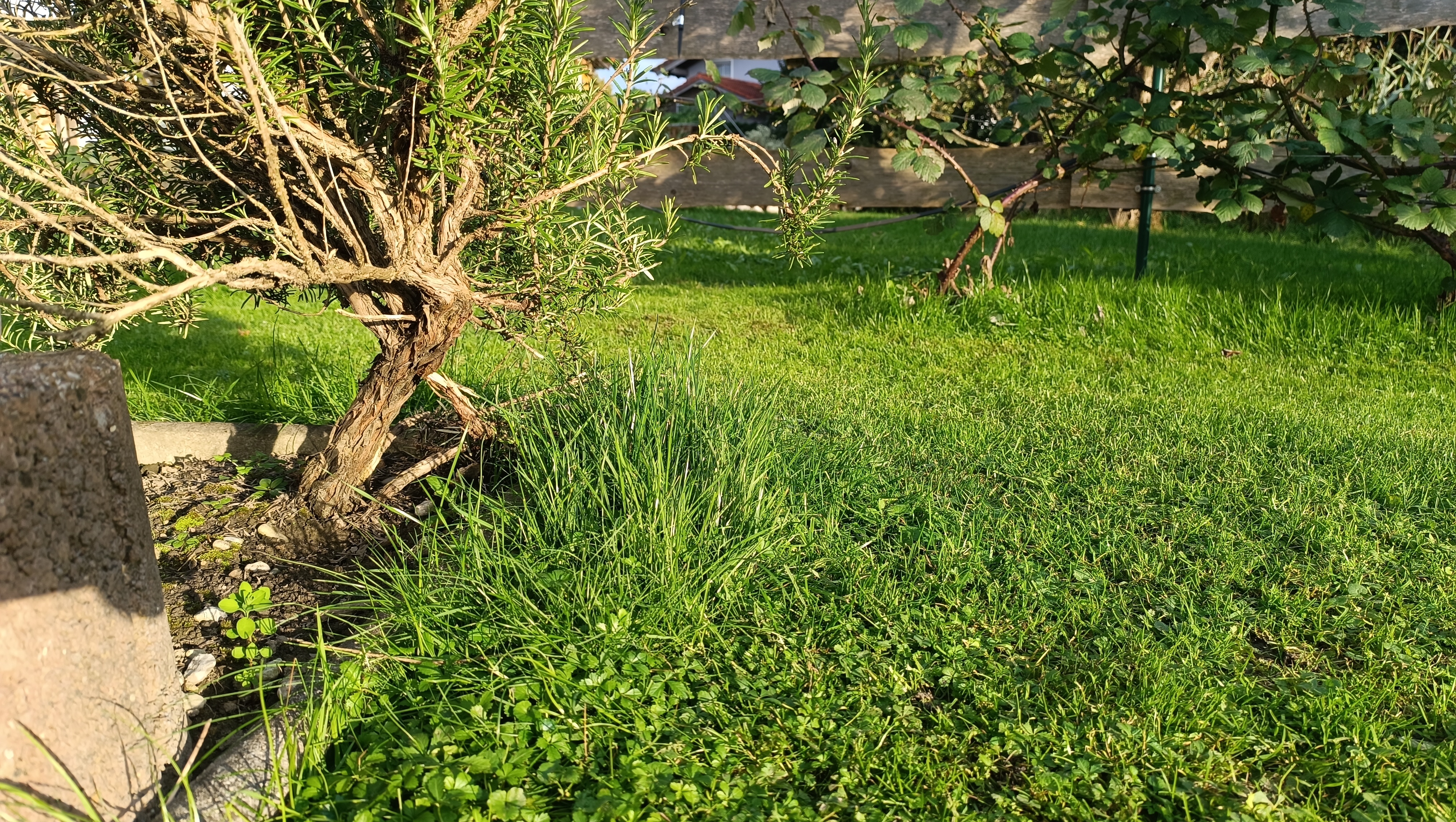 Ohne Hindernisse im Weg mäht der Terramow V1000 auch souverän bis zur Rasenkante, sodass bauartbedingt nur etwa 9 cm Rasen am Rand stehen bleiben. Der Mähroboter lässt dabei kaum Freiraum zwischen Gehäuse und Randbegrenzung. Sofern sinnvoll, kann der Abstand zur Rasen-Begrenzung weiter verringert – oder auch vergrößert – werden, indem man den Abstand zur Rasenfläche entsprechend anpasst. Diese Einstellung ist ebenfalls Zonen-spezifisch.