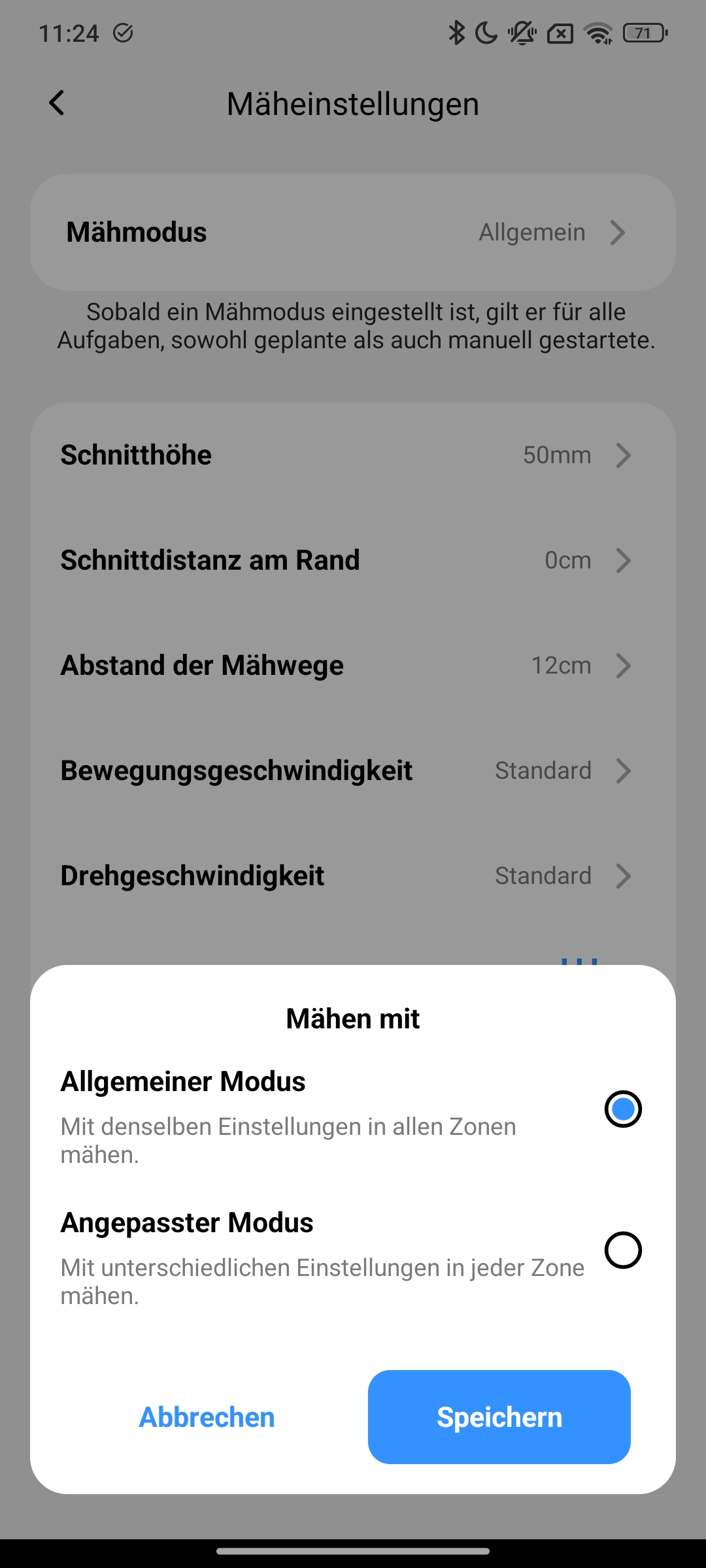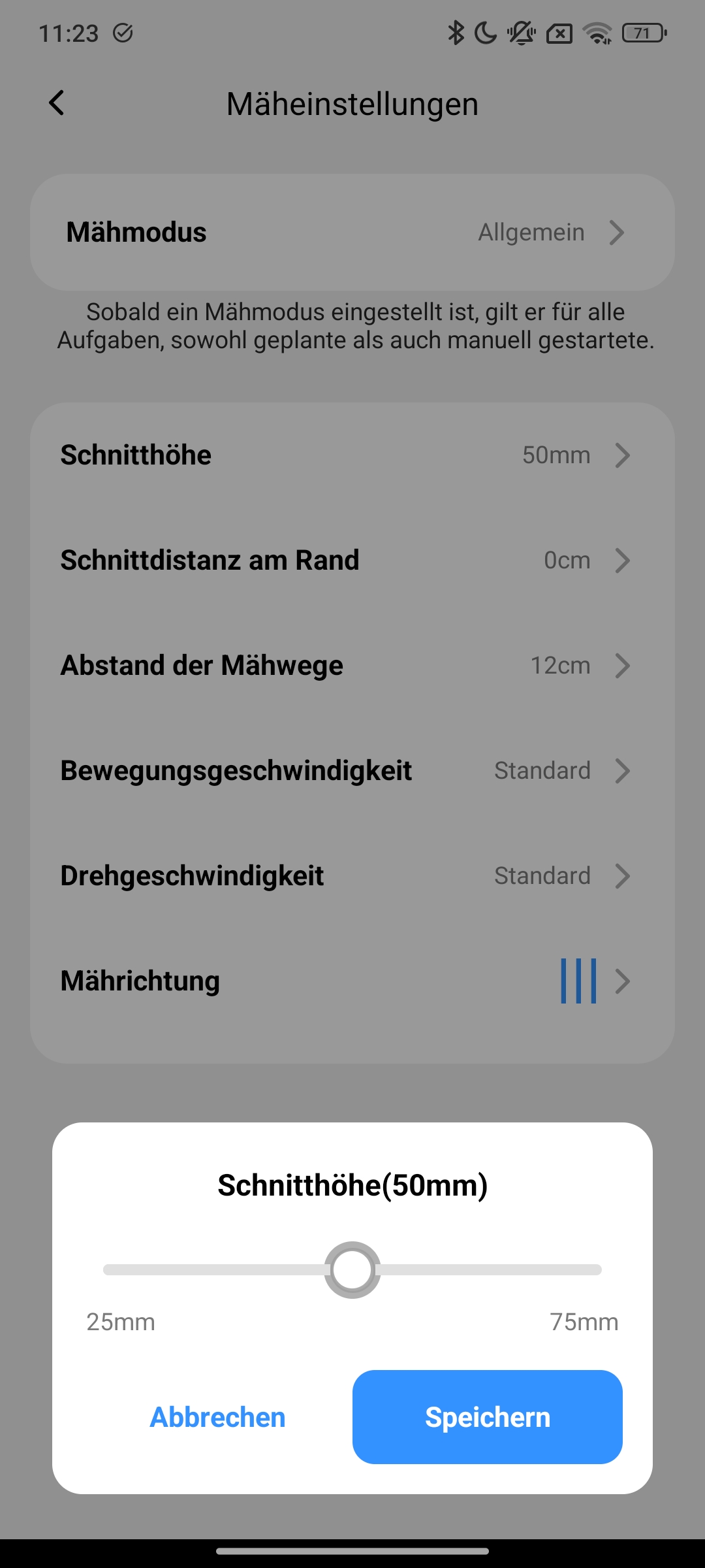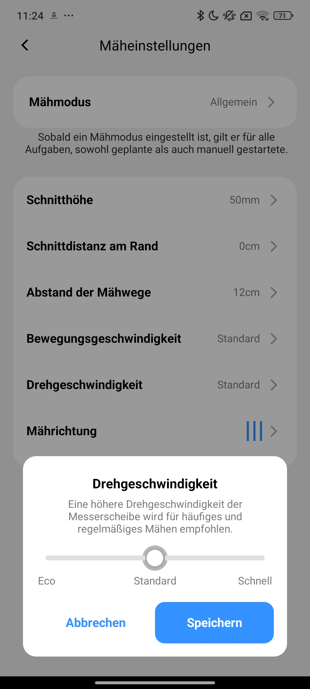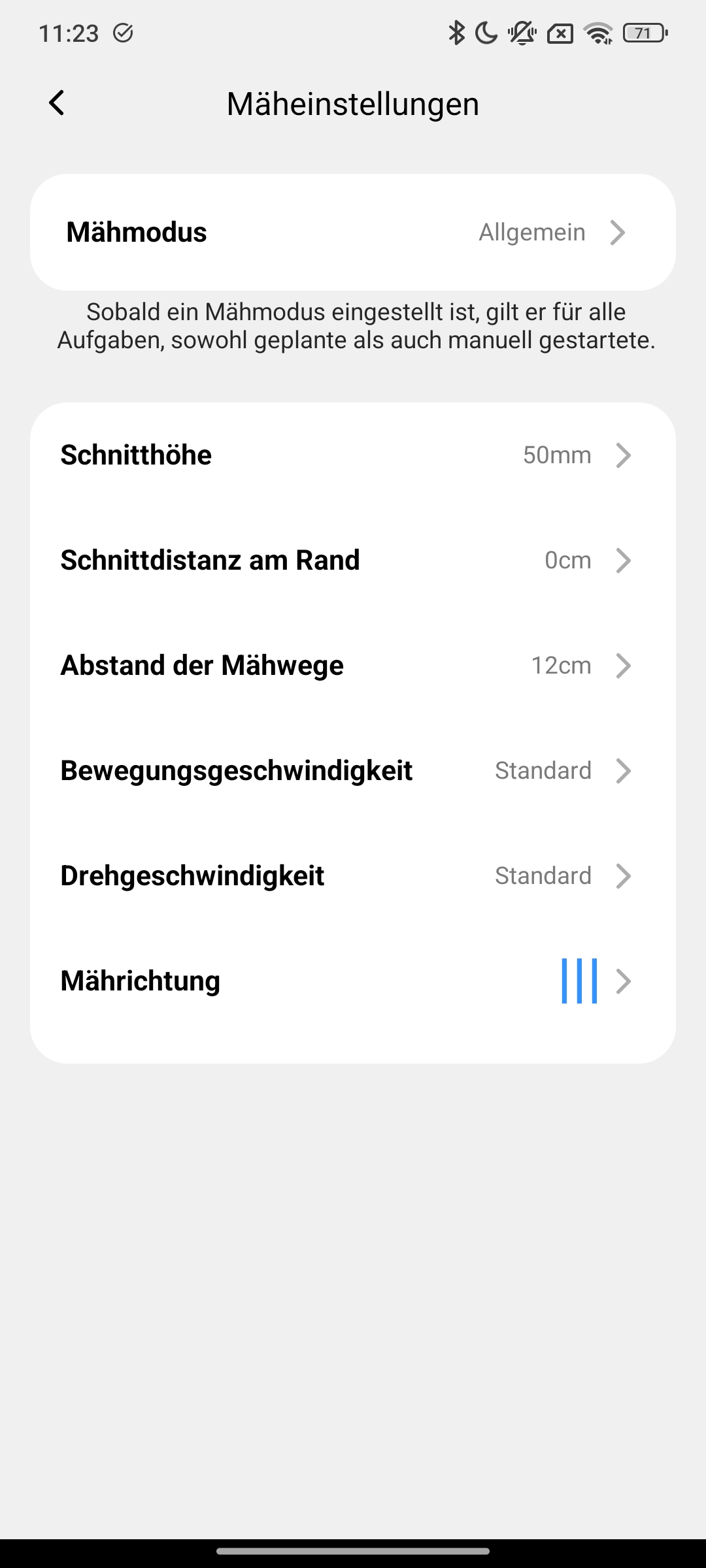 In unserem Test haben wir eine Schnitthöhe von 40 cm, 12 cm Abstand zwischen den Mähwegen und Bewegungs- und Messergeschwindigkeit im Modus „Standard“ gewählt. So mähen wir unsere Rasenfläche mit etwa 105 m² in 105 Minuten.