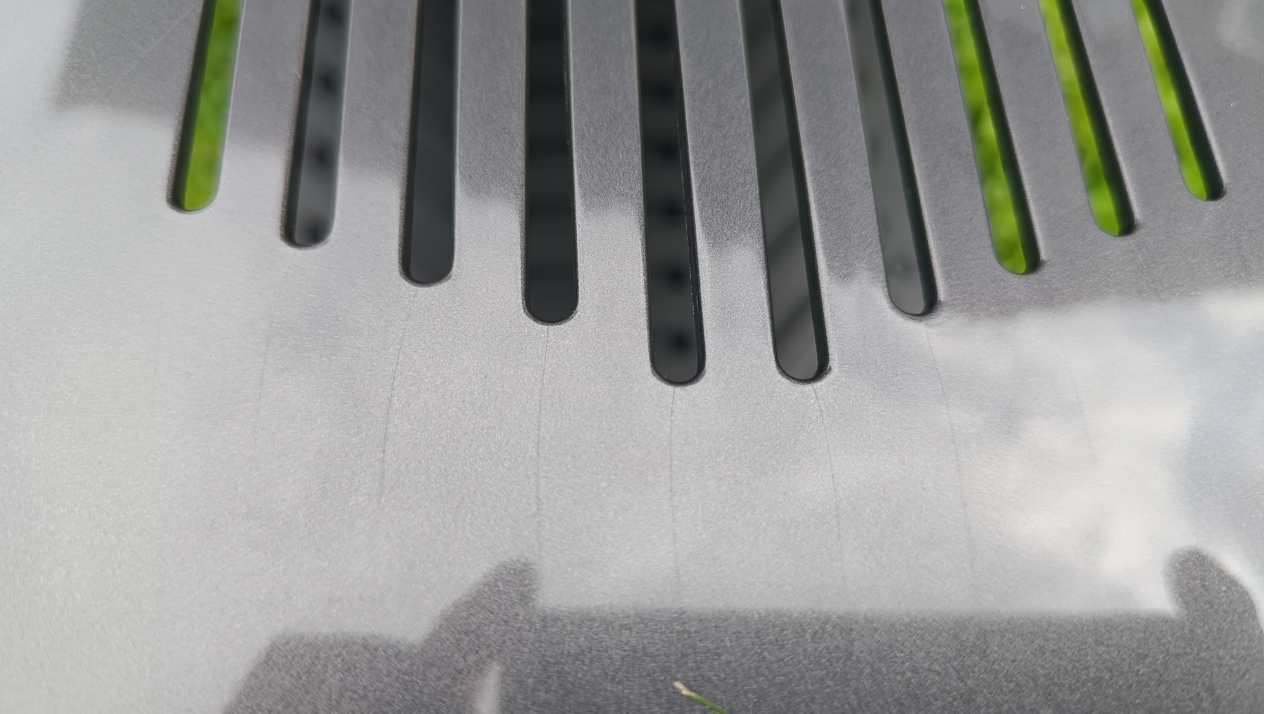 Sowohl die überdachte Ladestation als auch der Mähroboter selbst sind zum Großteil aus Kunststoff gefertigt. Der Unterstand wirkt zwar günstig, erfüllt aber seinen Zweck. In der Überdachung gibt es zudem eine Aussparung. Diese dient dazu, dass der Regen trotz des Unterstands am Sensor des Roboters erkannt werden kann. Die Verarbeitung des Roboters ist tadellos, aufgrund des Kunststoffs hat dieser bereits nach kurzer Zeit deutliche Gebrauchsspuren. Mähroboter und Station sind nach IPX6 staub- und wassergeschützt.