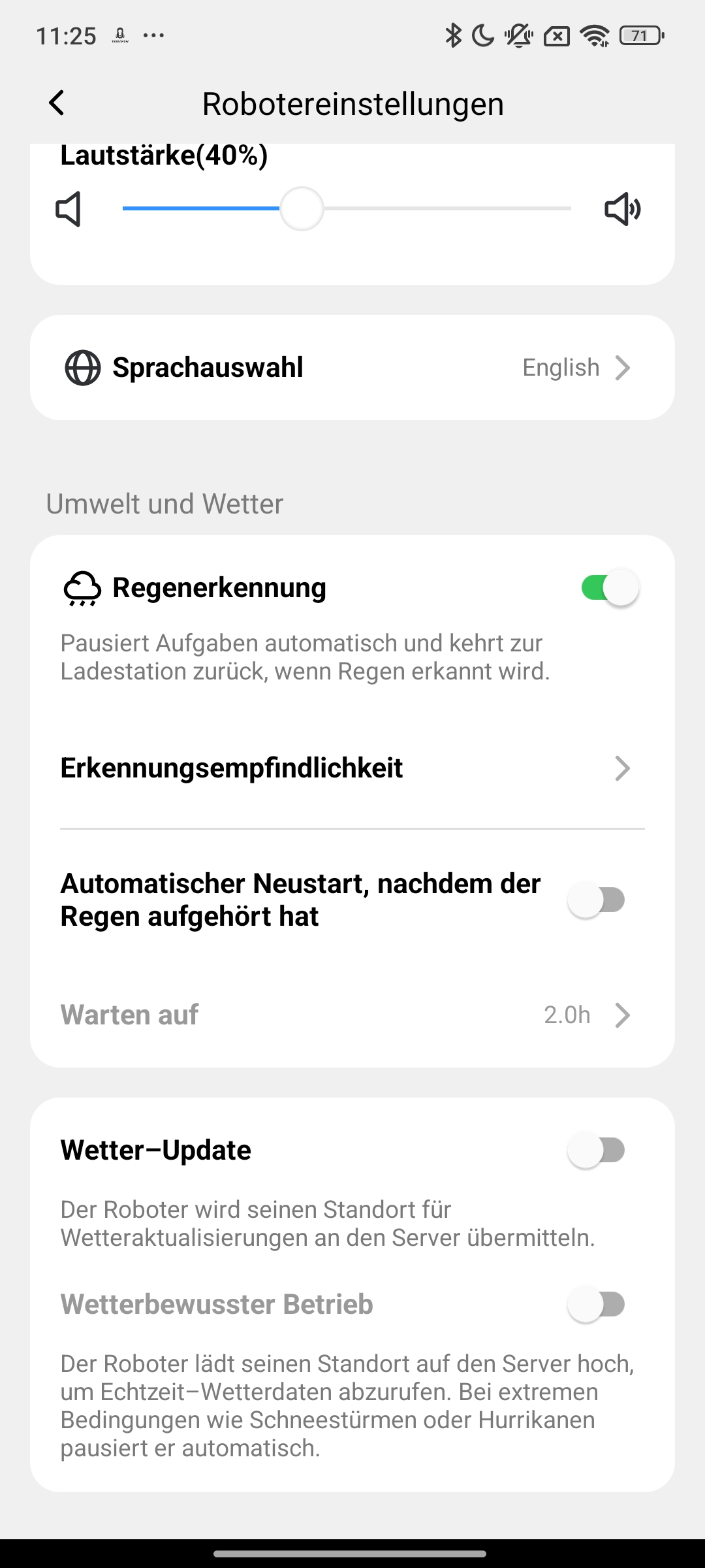 Sobald es dämmert, unterbricht der Mähroboter den aktuellen Auftrag und kehrt zur Ladestation zurück. Auch bei Regen stoppt er den Mähvorgang und setzt diesen zu einem späteren Zeitpunkt fort.