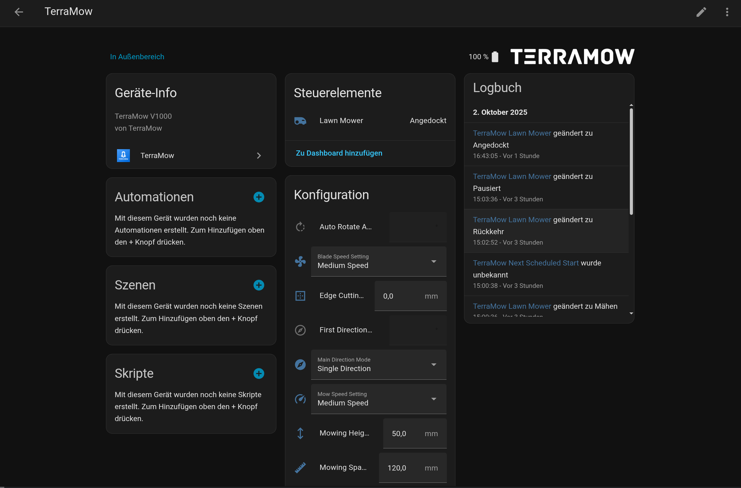 Dank einer Integration kann man den Terramow V1000 auch in Home Assistant integrieren.
