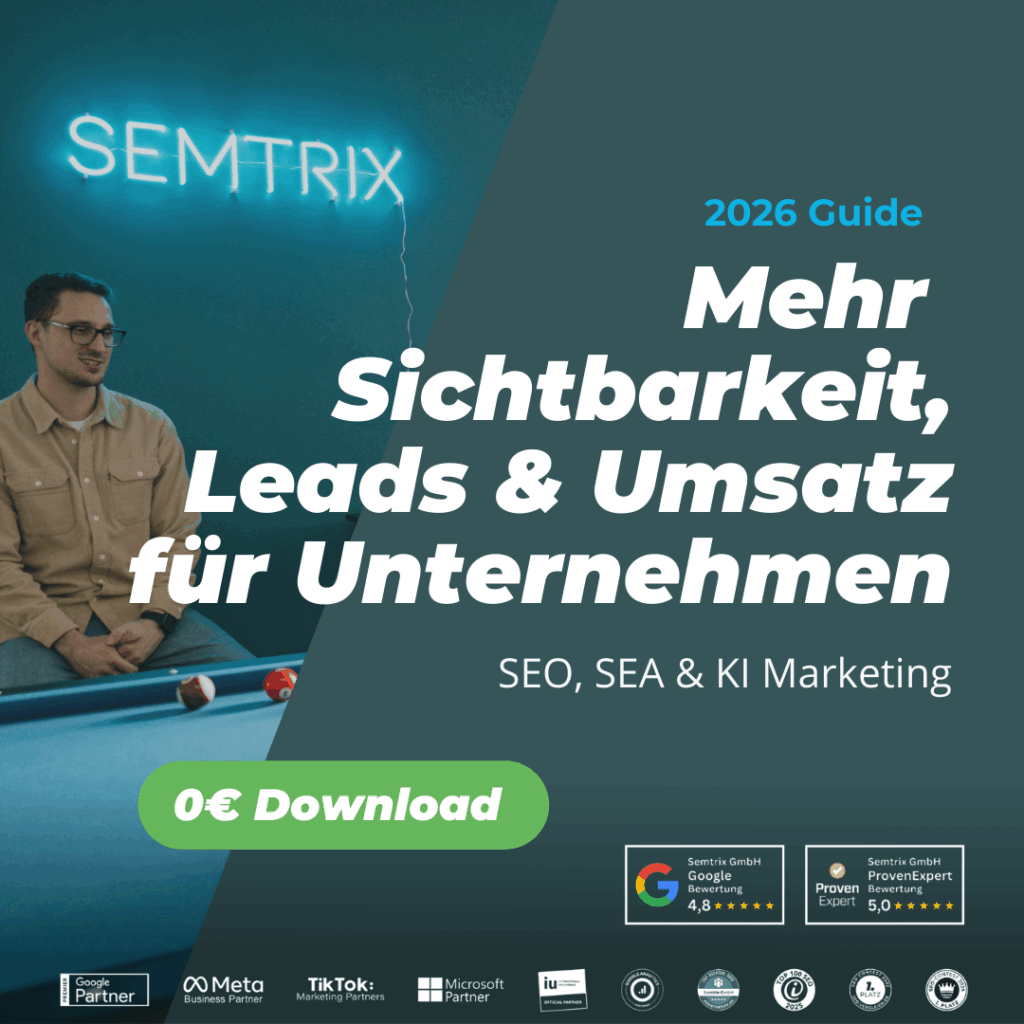 Von Sichtbarkeit zu Leads zu Umsatz: Dieser Dreischritt ist das Idealziel vieler Unternehmen. Doch er wird durch zahlreiche Faktoren erschwert, nicht zuletzt die Unsicherheiten, die die KI-Suche mit sich bringt. Die Expert:innen von Semtrix kennen sich besonders gut mit den Gegebenheiten und Neuerungen in den Bereichen SEO und GEO sowie SEA aus und teilen ihre Insights im neuen Semtrix Guide 2026. Dieser zeigt dir nicht nur, welche neuen Spielregeln es im Zeitalter der KI-Sichtbarkeit gibt, sondern auch, wie du in diesem langfristig Präsenz und Prominenz aufbaust. Wenn du außerdem wissen möchtest, mit welchen Kniffen du diese Sichtbarkeit strategisch in einen Umsatztreiber verwandelst, dann lade dir das kostenlose Paper zum Guide herunter.