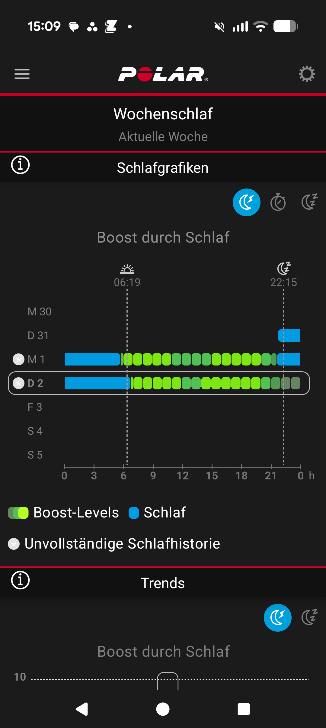 Zusätzlich zeigt der sogenannte Wert für Boost durch Schlaf auf einer Skala von 1 bis 10 an, wie sich der Schlaf auf Leistungs- und Konzentrationsfähigkeit am folgenden Tag auswirkt. Neben Schlafmenge und Schlafqualität berücksichtigt die App auch den Schlafrhythmus, um eine möglichst genaue Prognose zu erstellen. Im Test liefert das Feature glaubwürdige Werte, die mit dem subjektiven Empfinden übereinstimmen.
