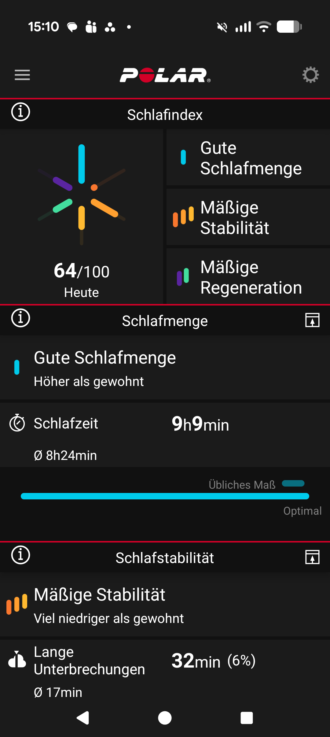 Außerdem finden wir in der App konkrete Angaben zur Schlafkontinuität und zu Schlafunterbrechungen. Vergleiche mit vergangenen Aufzeichnungen helfen uns dabei, langfristige Trends zu erkennen. Insgesamt funktioniert das Tracking im Test gut und liefert subjektiv glaubwürdige Werte. Teilweise gab es aber Blöcke im Schlaf-Tracking, die als unerkannt markiert wurden. Hier konnte die Uhr keine Messung durchführen, was in der App damit begründet wird, dass wir möglicherweise auf unserem Arm gelegen haben.