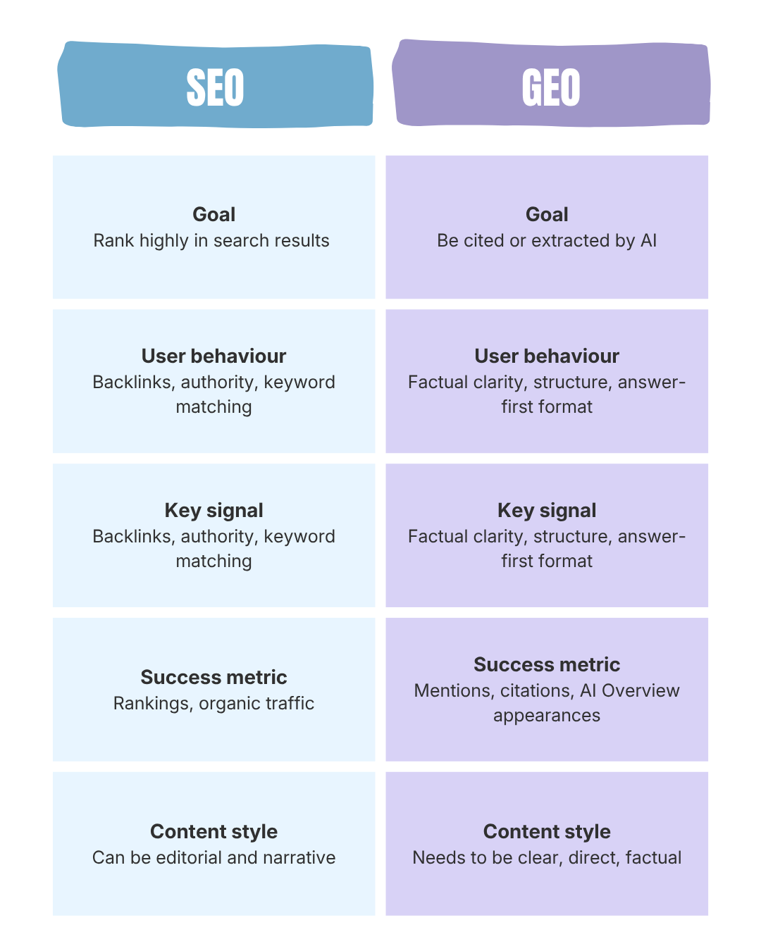 Während sich Search Engine Optimization (SEO) lange darauf konzentriert hat, Inhalte für Suchmaschinen zu optimieren und möglichst weit oben in den Ergebnislisten zu erscheinen, verschiebt sich der Fokus bei GEO leicht, aber entscheidend.
