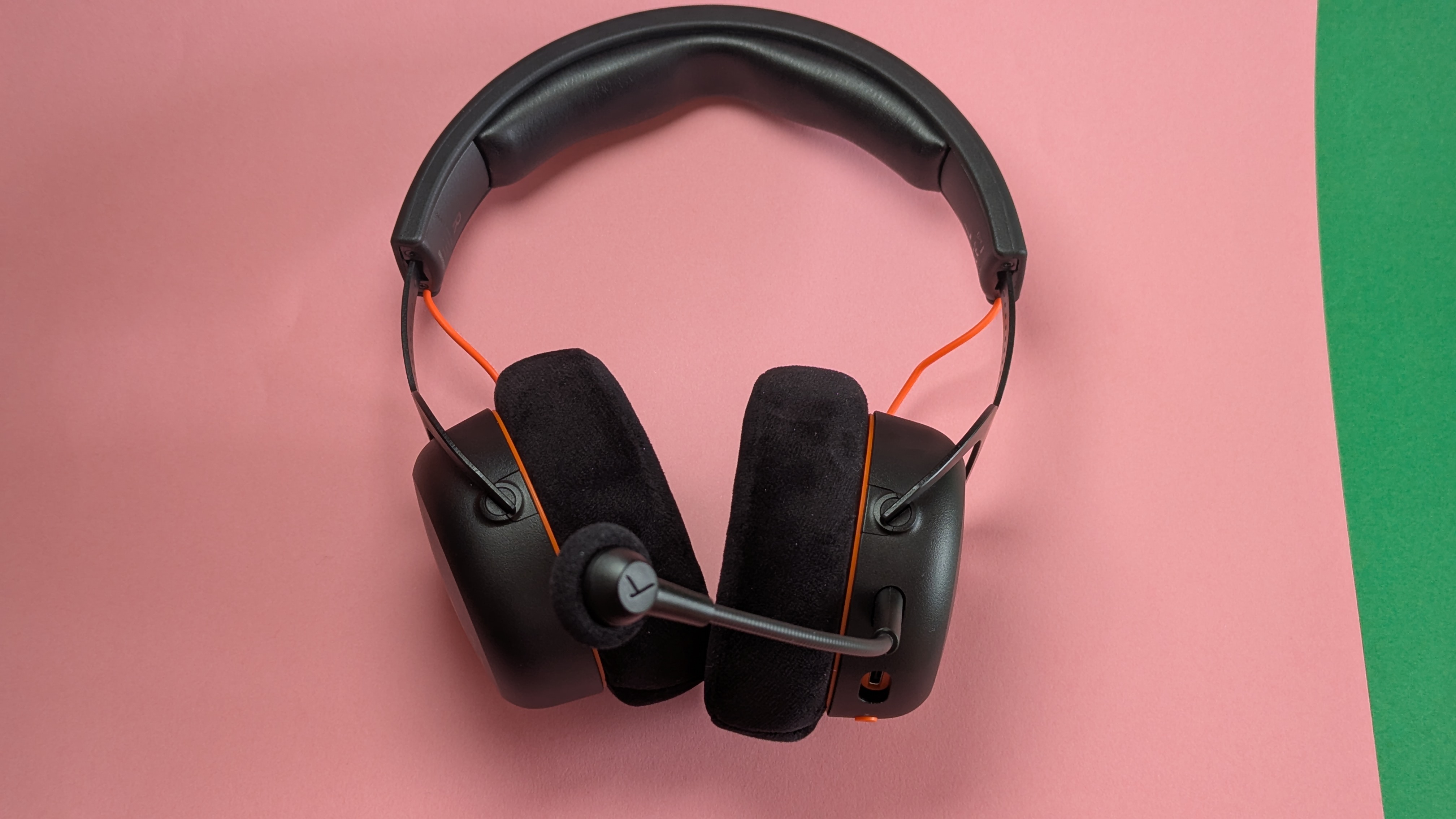 Ganz Gaming-untypisch kommt das Razer Blackshark V3 Pro in schlichtem Schwarz (alternativ in Weiß). Einzig der Mute-Button ist an der Basis in knalligem Razer-Grün gehalten. Mit 367 g hat es ein angenehmes Gewicht – sowohl in der Hand als auch auf dem Kopf. Das Kopfband besticht optisch durch eine Lederoptik mit geprägtem Razer-Schriftzug. Generell wirkt das Gaming-Headset sehr hochwertig und die Verarbeitung tadellos. Der Großteil des Gehäuses ist aus Plastik, die Ausnahme bilden die aus Aluminium gefertigten Ohrmuschelverbindungsarme und der Lautstärkeregler. Letzterer kommt mit geriffelter Oberfläche, was für eine deutlich bessere Griffigkeit sorgt. Ohr- und Kopfbandpolster haben eine sanfte Textiloberfläche. Das abnehmbare Mikrofon kommt mit abnehmbarem Popschutz.