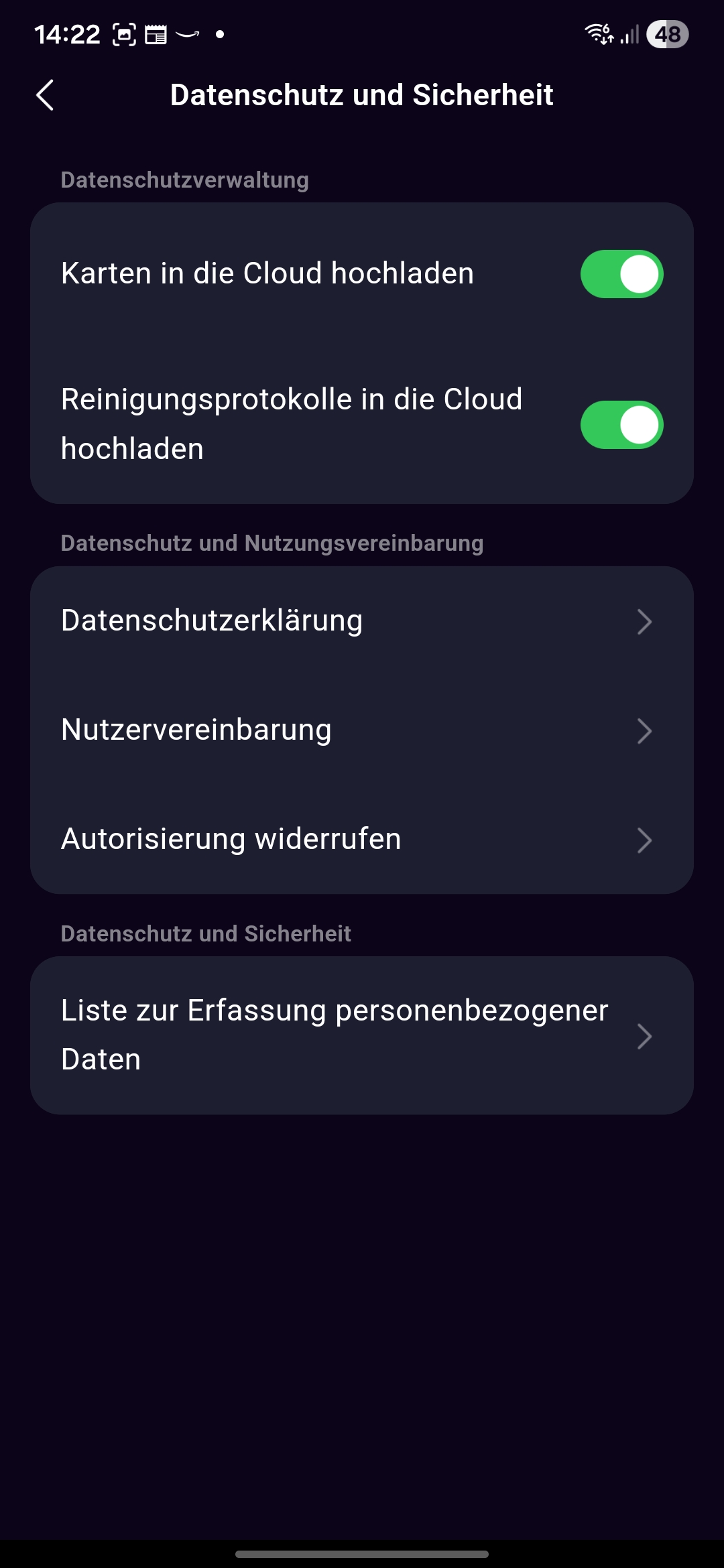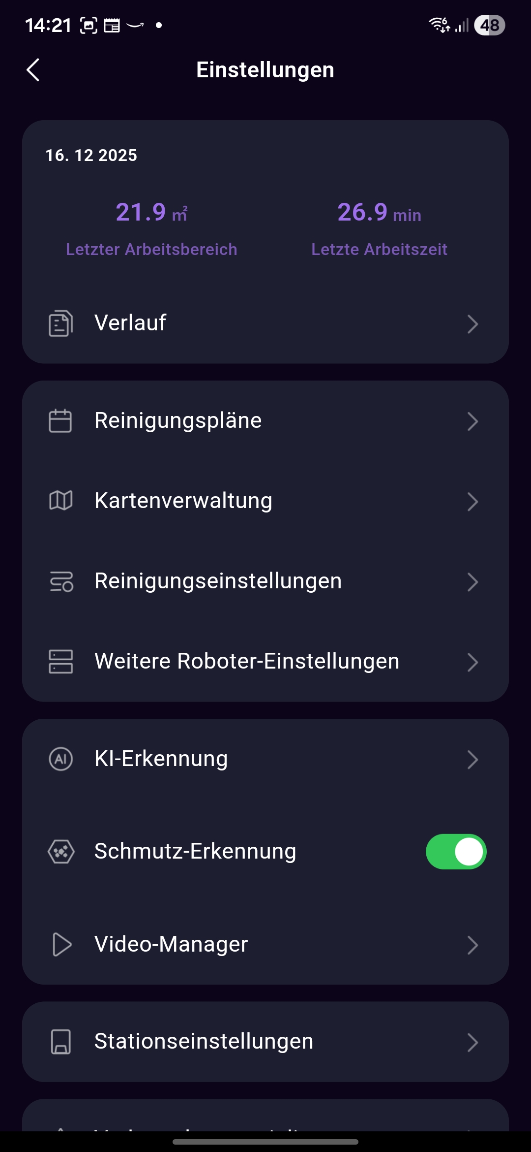 Auch das Verhalten der Station darf der Nutzer beeinflussen. Waschintervalle für Mopps, Trocknung und Entleerung lassen sich hier anpassen. Über die Kamera in der Front des Roboters ist zudem eine Live-Überwachung möglich, und es werden auf Wunsch Aufnahmen von erkannten Hindernissen und Haustieren erstellt. Der Hersteller gibt an, dass die KI-Hindernisvermeidung dabei ohne Speicherung von Bildern arbeitet und hat sich das vom TÜV Rheinland zertifizieren lassen.