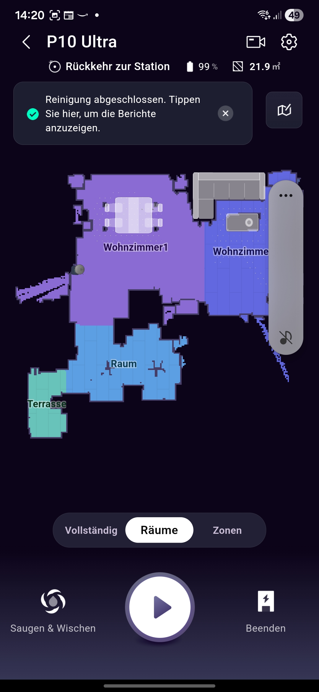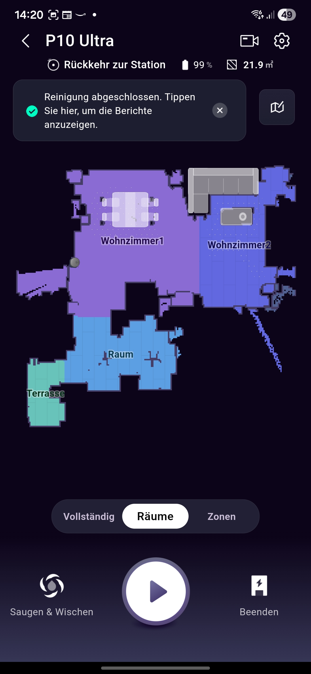 Da der Roboter vergleichsweise schnell navigiert, schaffte er im Test rund 120 m² brutto, also abzüglich Möbeln und unerreichbarer Stellen. Bei mehr Reinigungsfläche fährt der Roboter bei niedrigem Akkustand zum Laden zurück und setzt die Reinigung später fort. Eine vollständige Ladung dauert beim 3i P10 Ultra rund 3,5 Stunden.