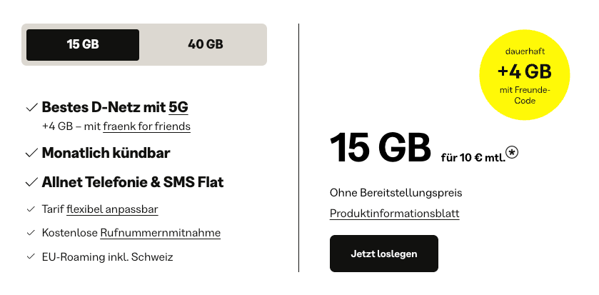 Telekom-Tochter Fraenk bietet seit Mitte Oktober dauerhaft 24 GB mit 5G (max. 50 MBit/s) für monatlich 10 Euro. Mit Codes wie HAGR5 oder ANDP69 aus der Aktion „Fraenkforfriends“ gibt es dauerhaft 24 statt 20 GB – Anfang Oktober waren es noch 15 GB. Pro Code oder geworbenen Freund gibt es weitere 4 GB dazu. Rufnummernmitnahme, Auslandsverbindung, EU-Roaming und Zahlung per Paypal sind möglich.