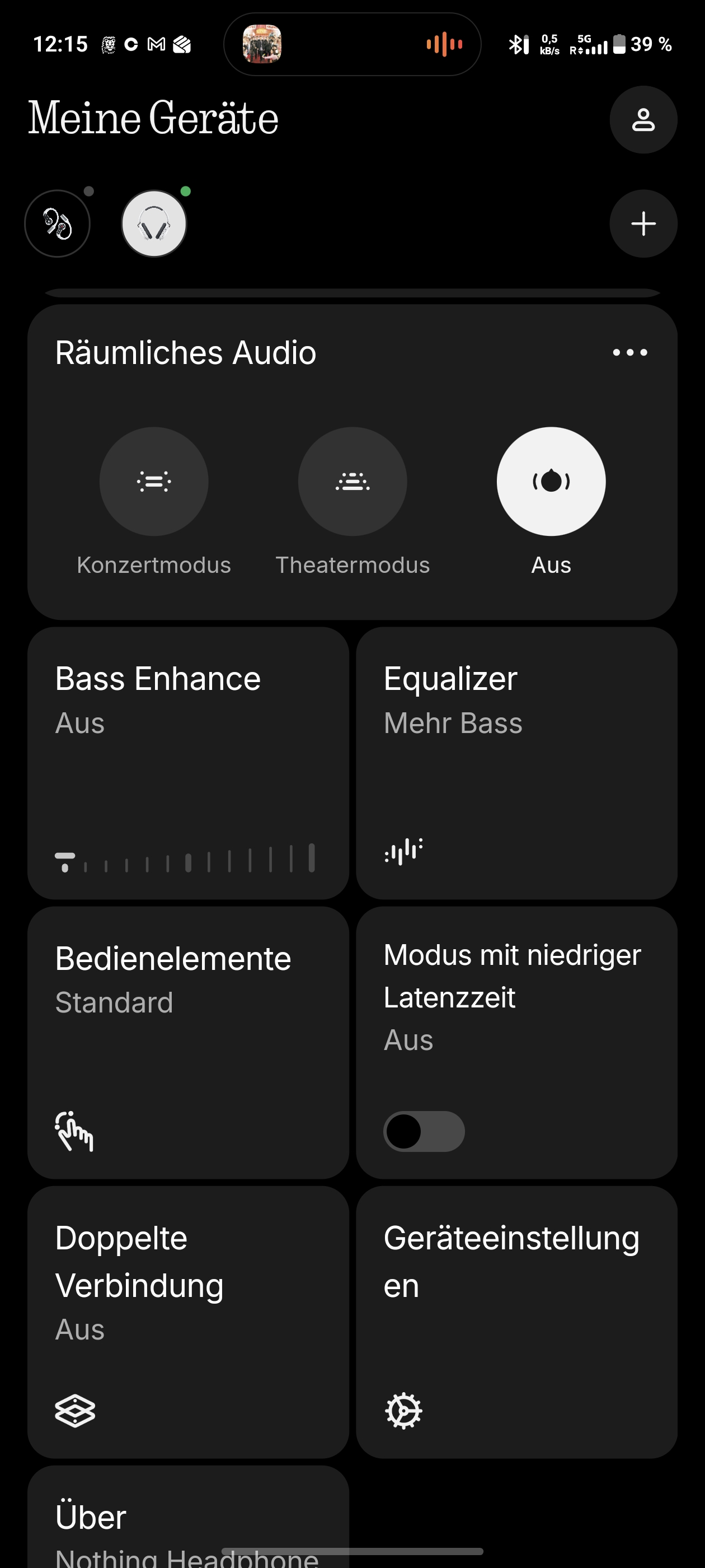 Weitere Features umfassen räumliches Audio mit Konzert- und Theatermodus, Bass Enhance, Low-Lag-Modus und Multipoint-Verwaltung. Was fehlt, ist eine akustische Anpassung an das eigene Hörvermögen, wie sie etwa der JBL Tour One M3 mit Personi-Fi 3.0 bietet. Gerade bei einem Kopfhörer, der vom EQ-Tuning profitiert, wäre ein automatischer Hörtest ein willkommenes Extra gewesen.