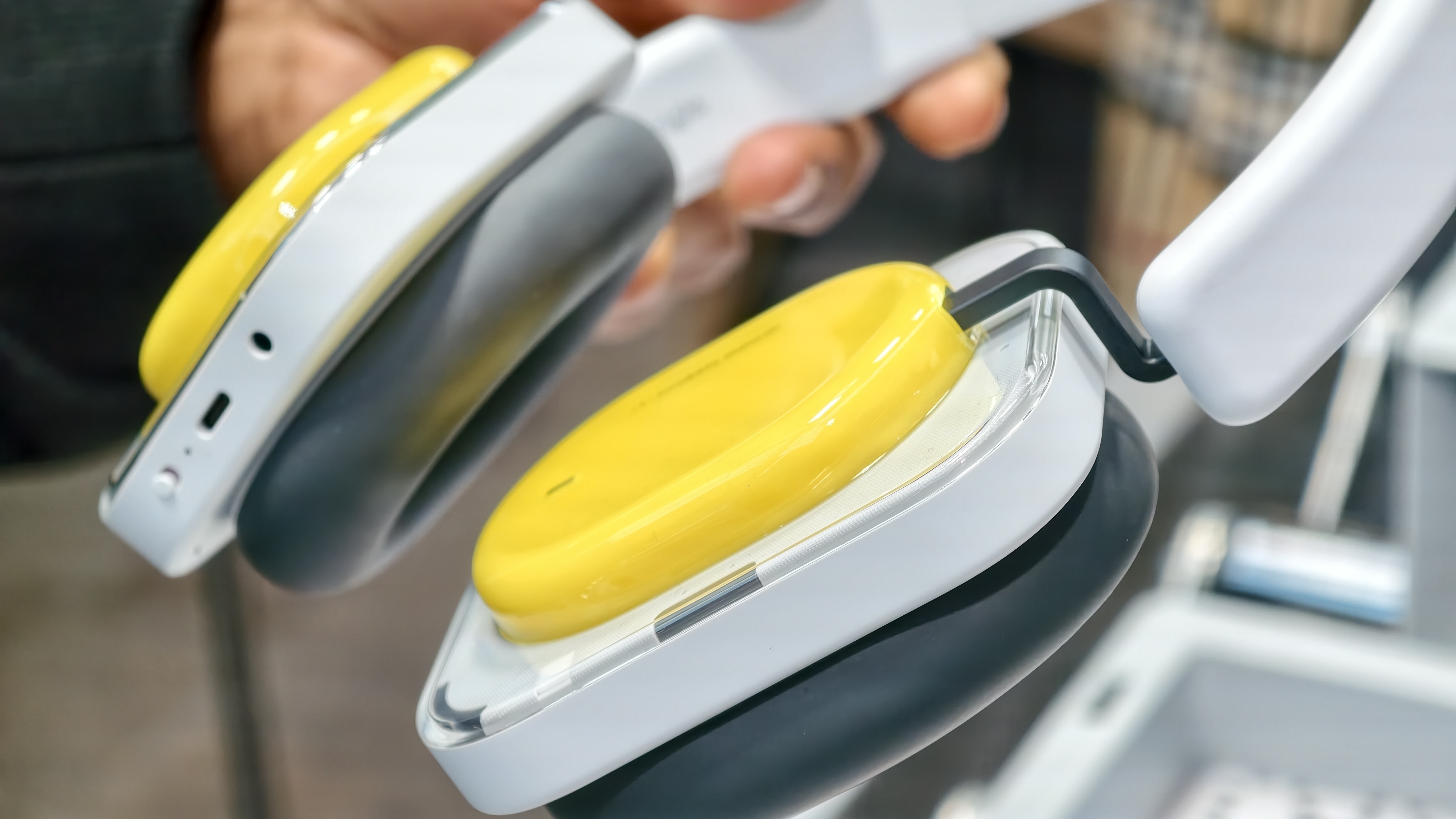 Nothing bleibt sich treu: Auch der Headphone A setzt auf das charakteristische Transparent-Design mit sichtbaren inneren Komponenten hinter rechteckigen Fensterbereichen. Optisch ähnelt er dem Headphone 1 deutlich – man erkennt die Verwandtschaft sofort. Der Unterschied liegt im Material: Statt Aluminium kommt beim A weitgehend Kunststoff zum Einsatz, auch beim Bügel. Das spart Gewicht und Kosten, nimmt dem Kopfhörer aber etwas von der Premium-Anmutung des großen Bruders. Der schicke Kontrast zwischen matten und glänzenden Kunststoff-Elementen sorgt trotzdem für eine ansprechende Optik.