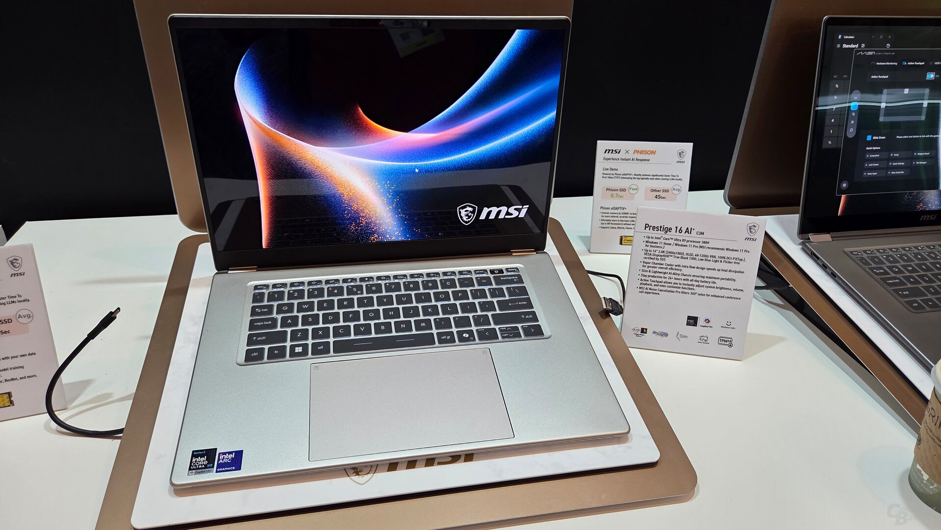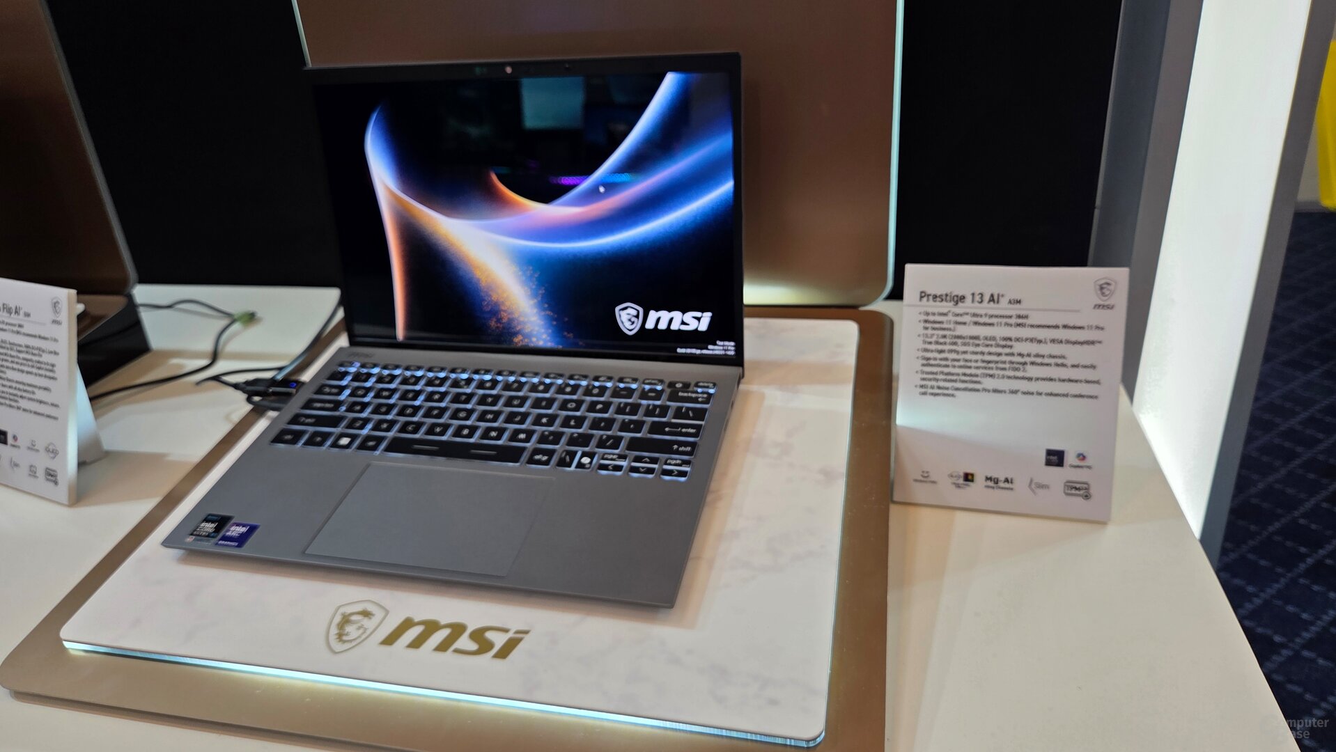 Auch im bereits angesprochenen 13-Zoll-Modell steckt Intel Panther Lake, hier ist jedoch bei der Variante Intel Core Ultra 9 386H Schluss – also der SKU mit nur 4 Xe-Cores statt dem Vollausbau von 12 Xe-Cores für die integrierte Grafik. Dies ist deshalb eher der ultramobile Office-Begleiter, wie ihn MSI vor Ort auch nennt, die 899 Gramm sind im hochwertig anmutenden Magnesium-Aluminium-Gehäuse ein entsprechendes Indiz. Aber auch hier wird ein OLED mit 1.800p-Auflösung verbaut.